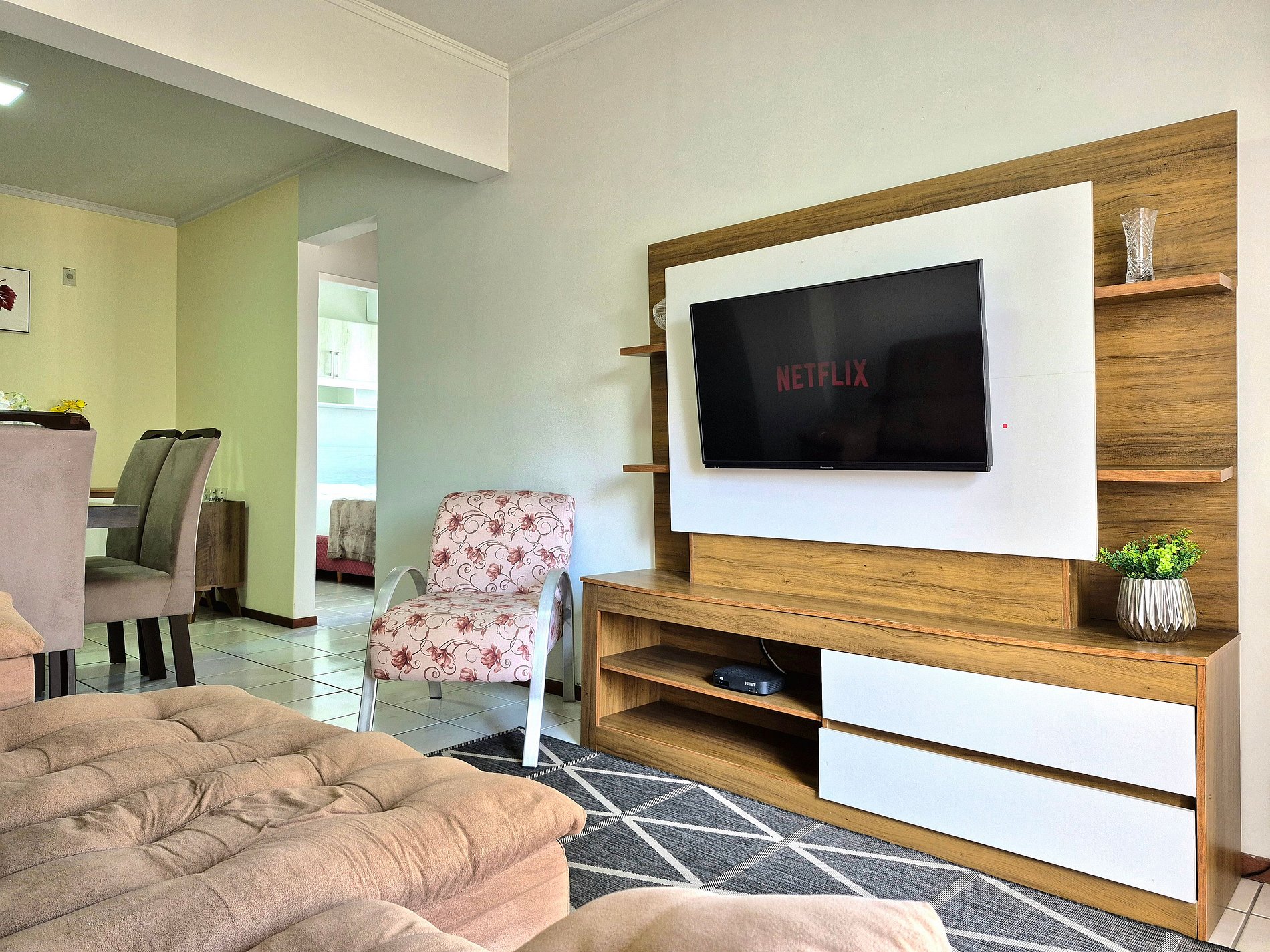 Nosso apartamento possui 2 quartos confortáveis com ar condicionado, TV com aparelho Net Digital HD na sala e em um dos quartos. Sala de estar integrada a sala de jantar com mesa e cadeiras para acomodar sua família ou amigos. Cozinha completa com utensílios e eletrodomésticos. Área de serviço com máquina de lavar roupas. Temos uma sacada ampla e ensolarada, com vista para cidade, de frente pra Av. Brasil, uma das avenidas mais movimentadas de BC!
