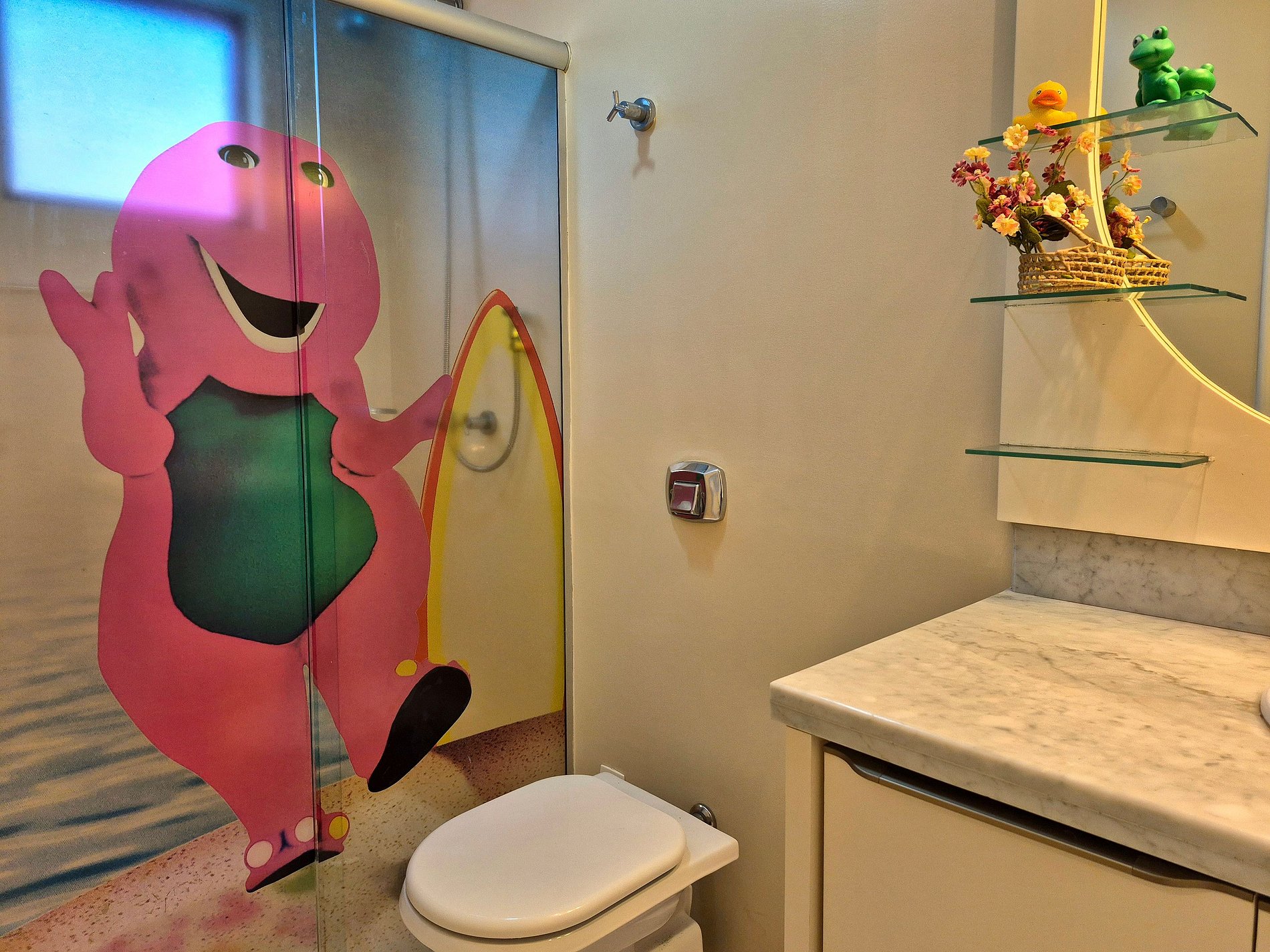 Extremamente amplo, nosso apartamento possui 3 suítes espaçosas e confortáveis. Você vai se surpreender com a decoração do banheiro de duas das nossas suítes, é de encantar a criançada!