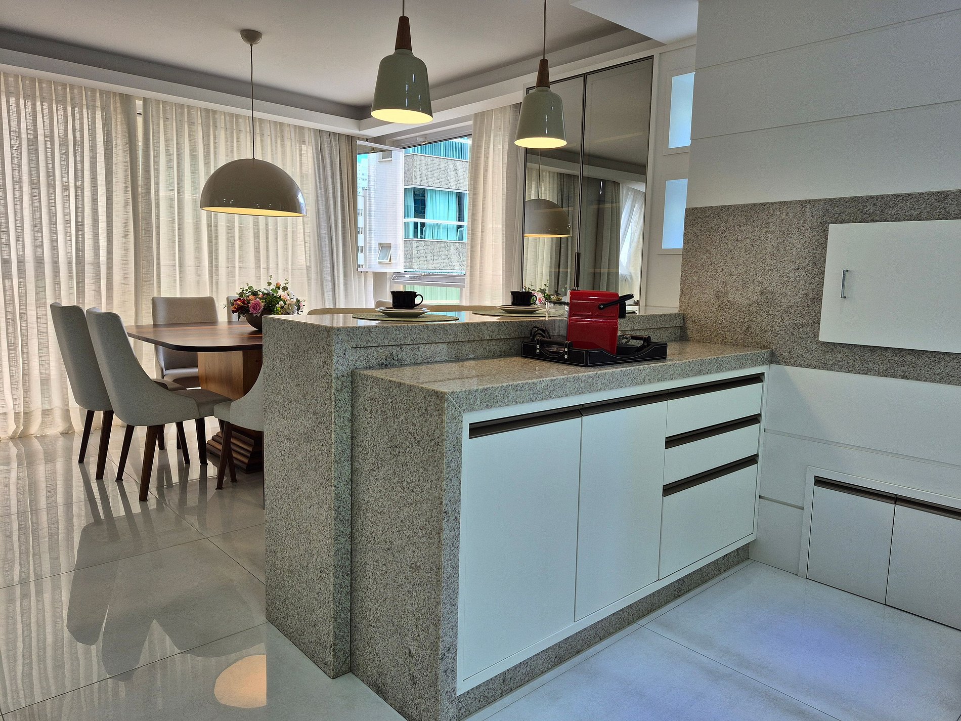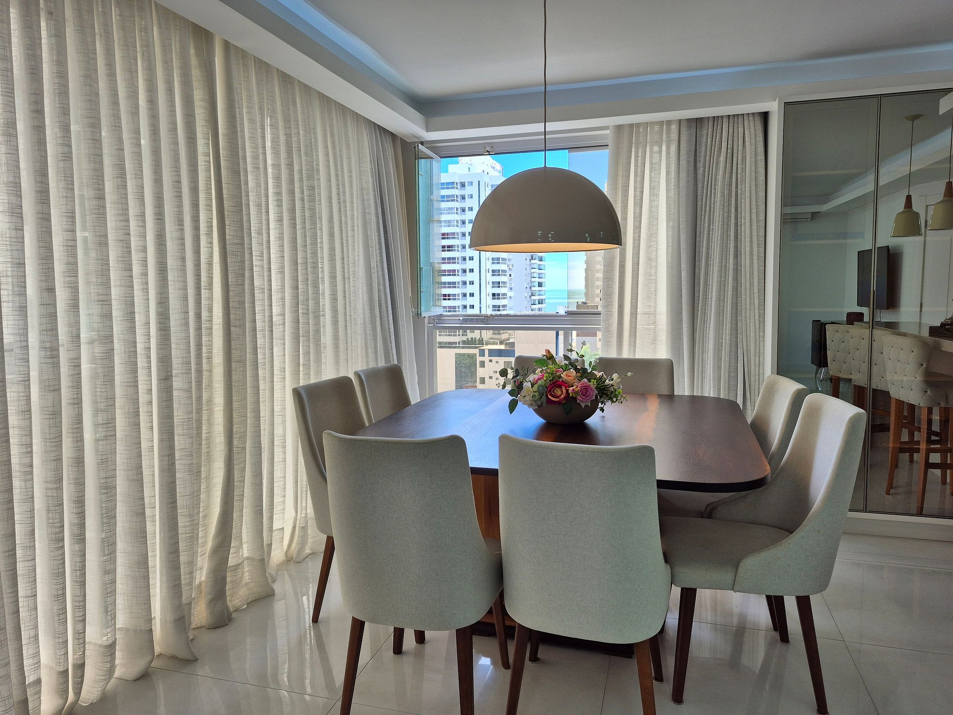 Este espaçoso apartamento oferece acomodações confortáveis e bem distribuídas. A suíte principal conta com cama king-size e tv. A segunda suíte possui cama de casal e a terceira suíte conta com uma cama de casal e uma cama de solteiro, tv e frigobar, acomodando confortavelmente diferentes configurações de hóspedes. Há um lavabo para maior comodidade. Proporcionando momentos de lazer e refeições especiais, a cozinha é totalmente equipada e integrada à área de estar, garantindo praticidade e conforto. Há também o diferencial da CHURRASQUEIRA A CARVÃO integrada a cozinha, que proporciona momentos muito prazerosos a famílias que curtem fazer um churrasco, e confraternizar juntos. Conta ainda com lavanderia equipada com máquina de lavar e varal, garantindo praticidade para sua estadia.
