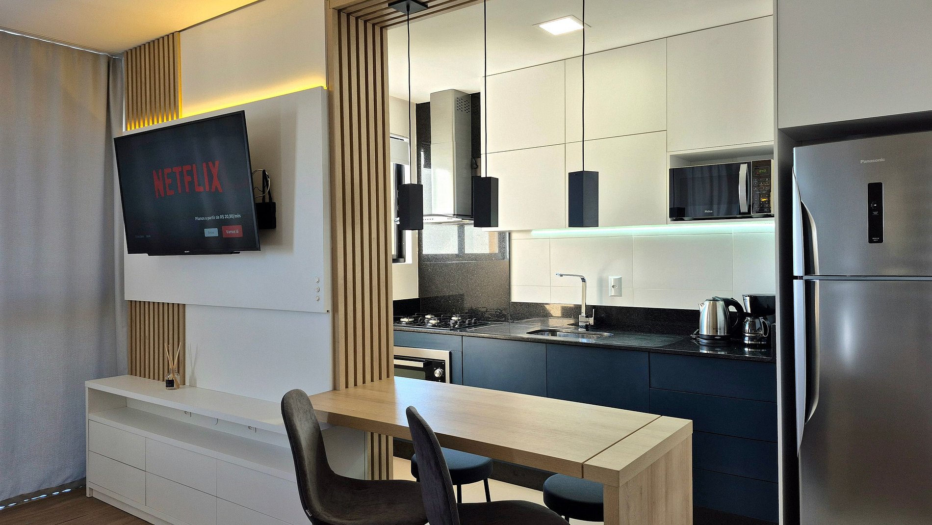 O studio destaca-se pelo design contemporâneo e pela funcionalidade dos ambientes. A decoração clean e os equipamentos modernos proporcionam uma experiência acolhedora aos hóspedes. A cama de casal e o sofá cama confortáveis, a cozinha equipada e o espaço de trabalho dedicado contribuem para uma estadia agradável.