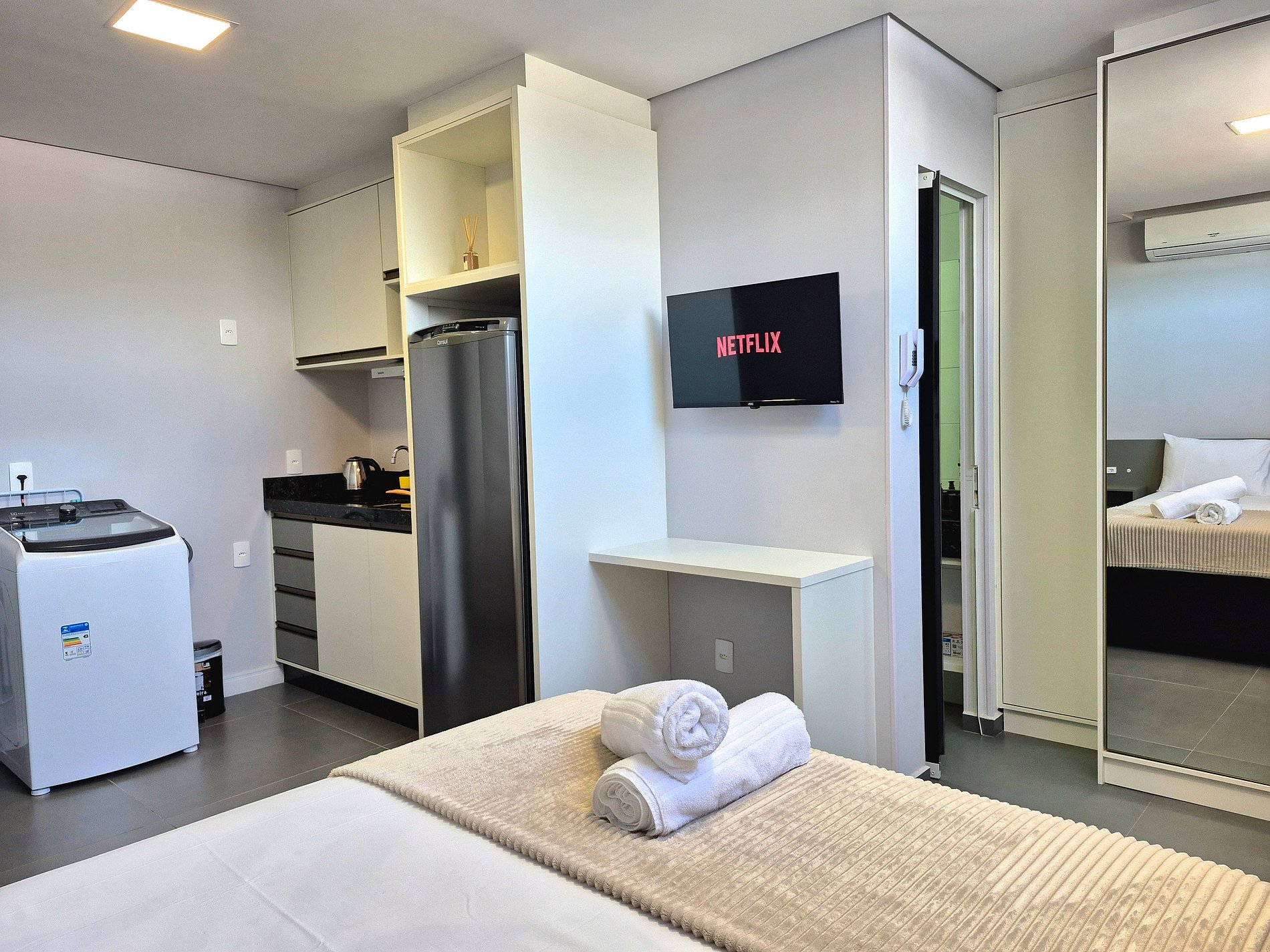 Moderno e equipado no bairro da Barra em Balneário Camboriú. Conta com cozinha compacta com fogão, geladeira, utensílios, chaleira elétrica, cama de casal confortável, mesa para refeições e home office, máquina de lavar e banheiro completo. Ao lado do nosso loft tem padaria, praça pública, farmácia, conveniência, mercado e fica a poucos minutos do Parque Unipraias, Passarela da Barra. Prático e super eficiente, atendendo as necessidades do cotidiano e para quem quer aproveitar as praias de BC e as atrações turísticas.