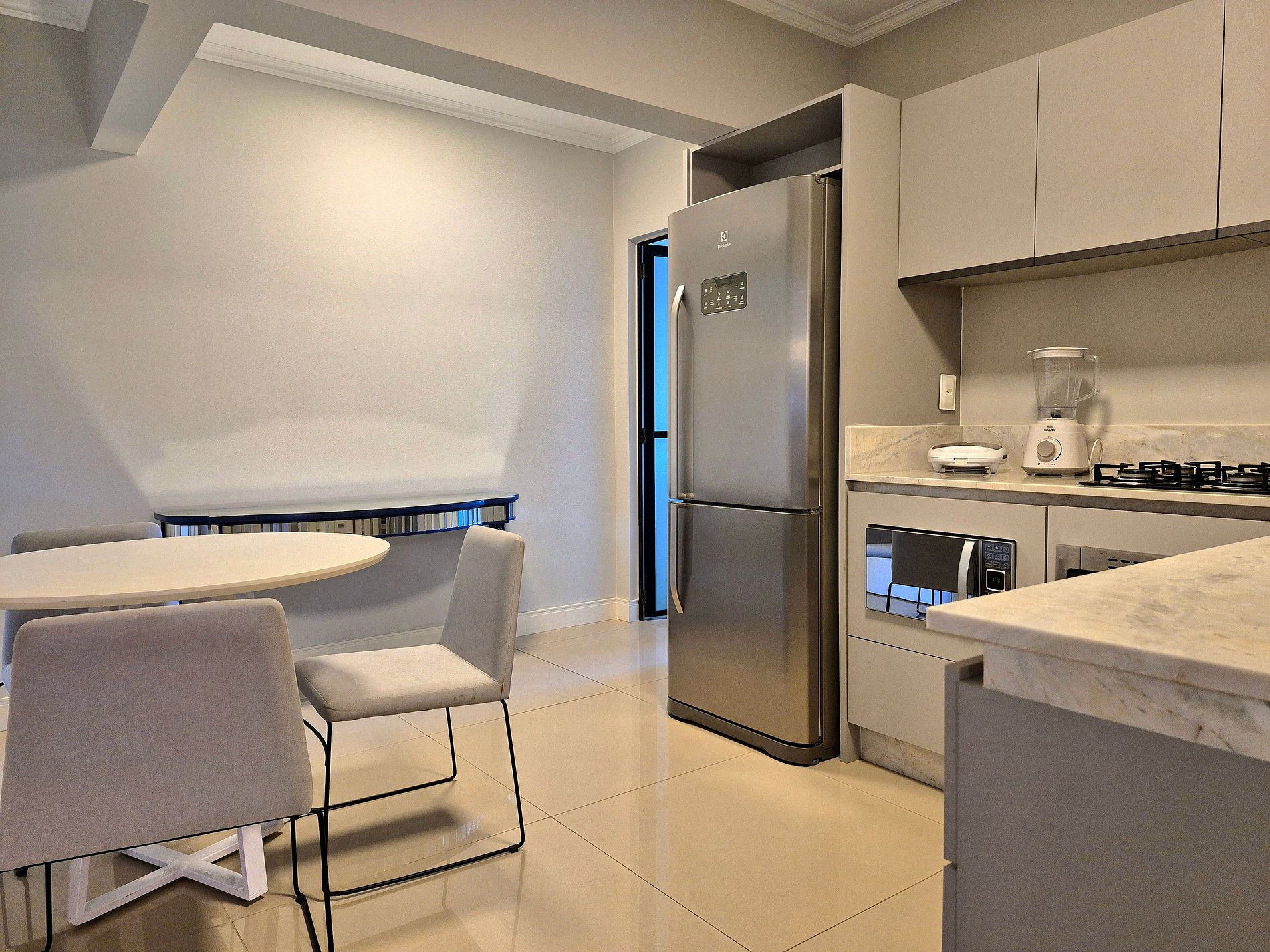 Nossa sala de estar é ampla e integra a sala de jantar, acomodando confortavelmente seus amigos ou familiares durante as refeições. Cozinha completa com utensílios e eletrodomésticos com ótima bancada!
