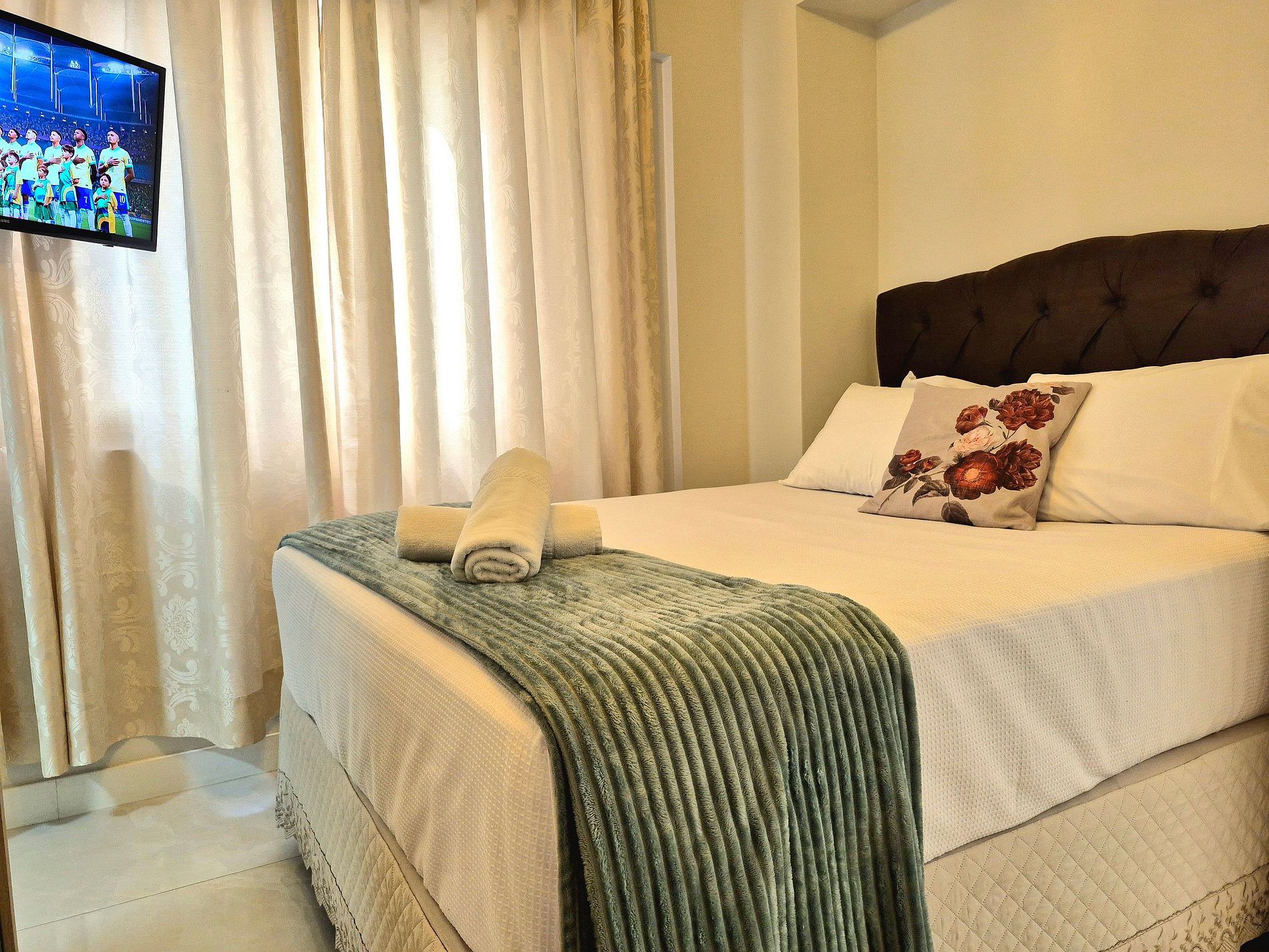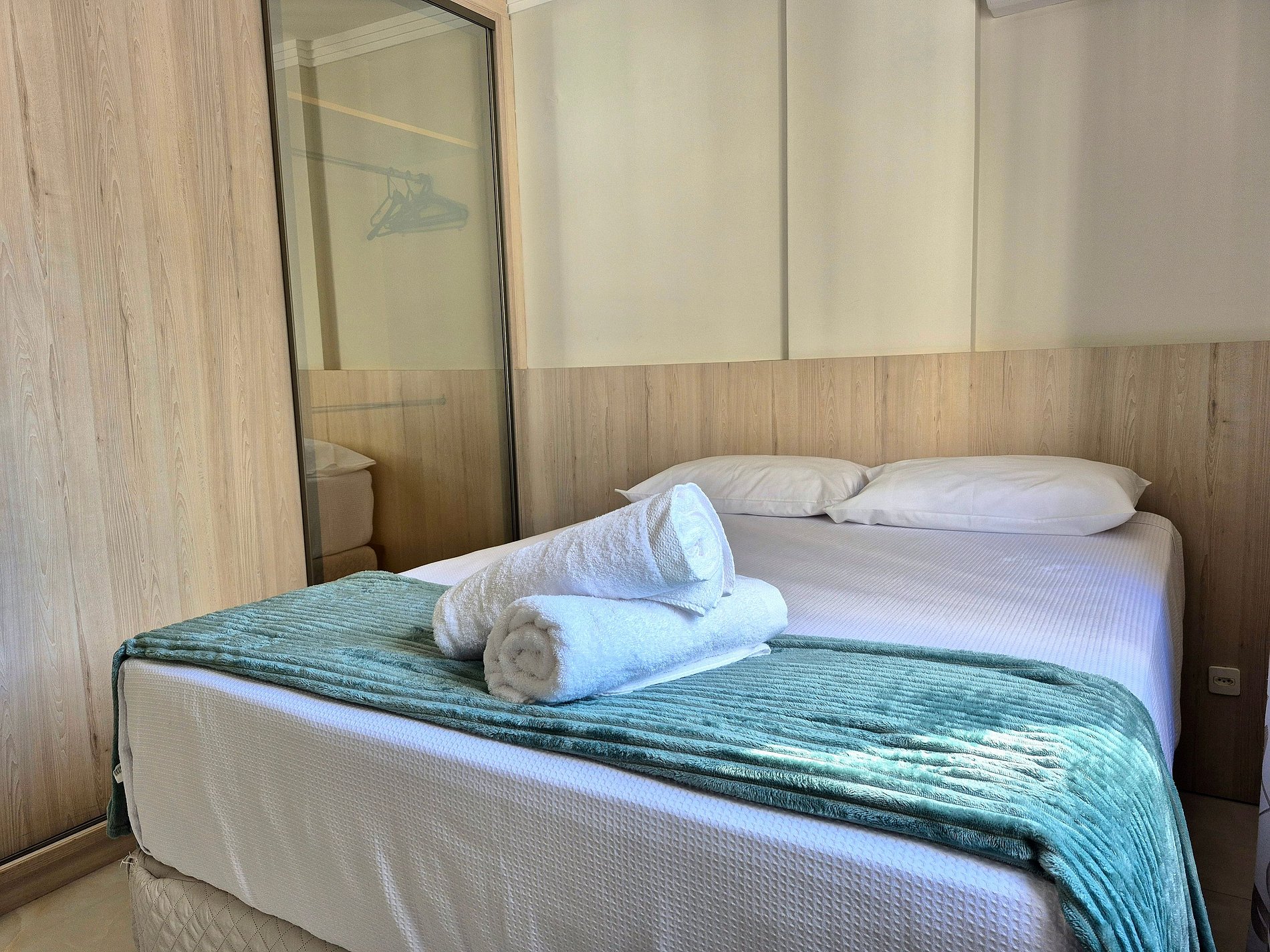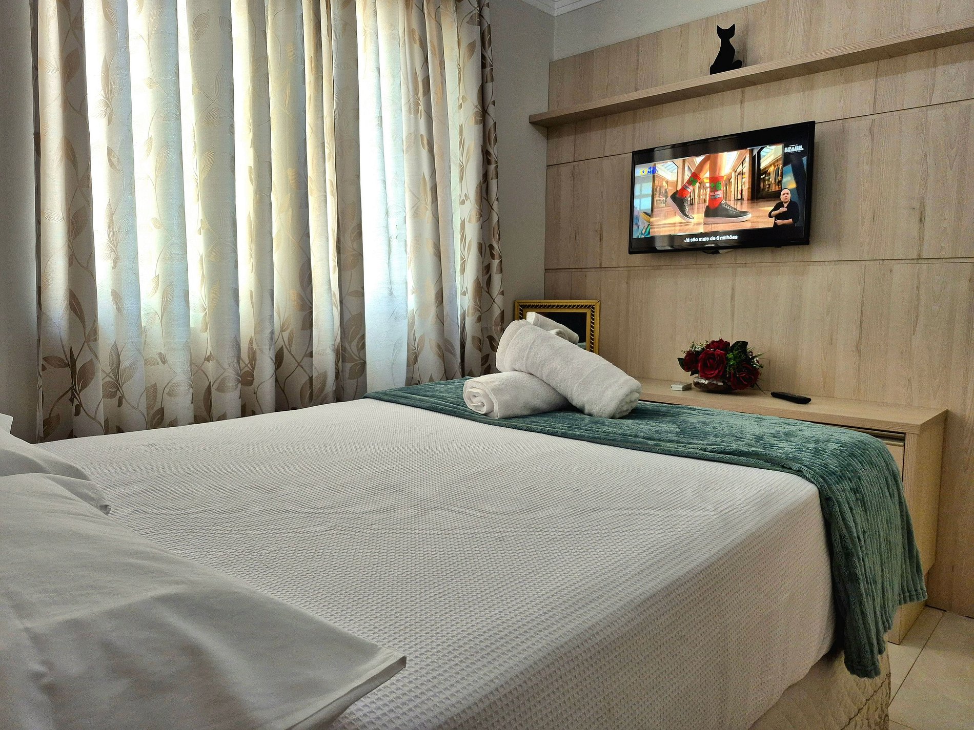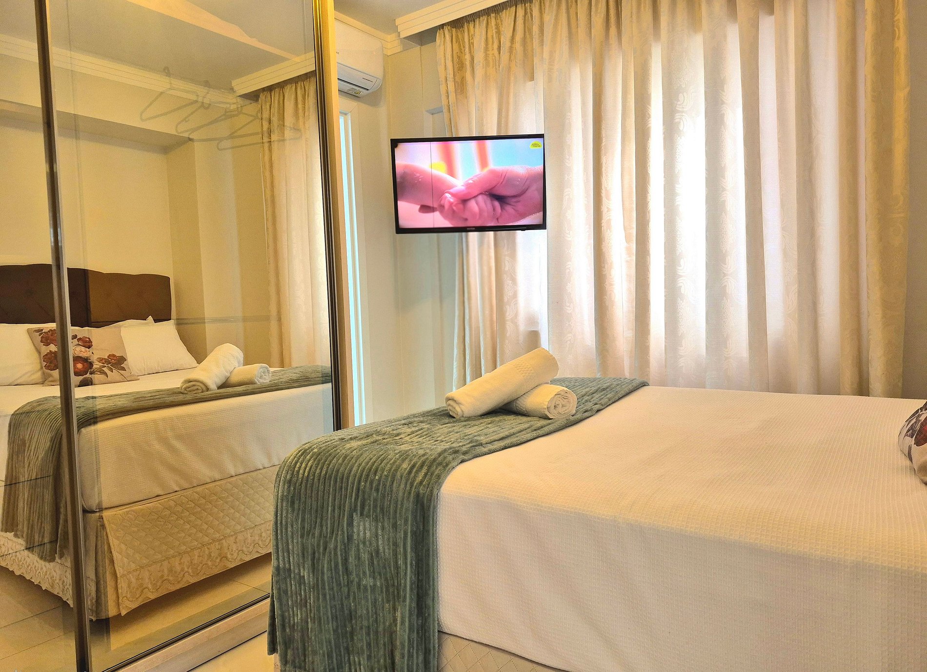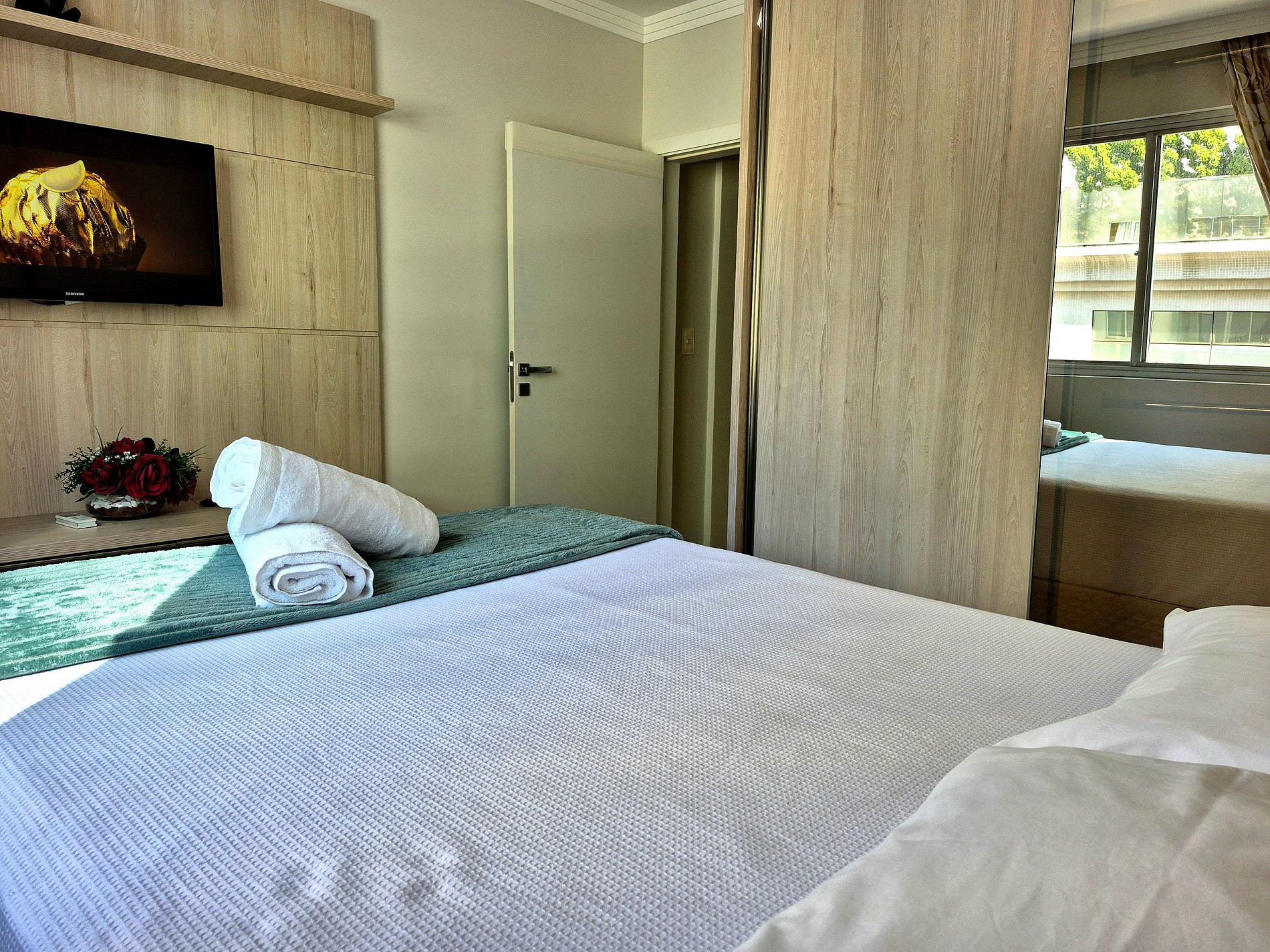 Quartos: ambos possuem cama de casal, armário amplo, ar condicionado e Tvs.