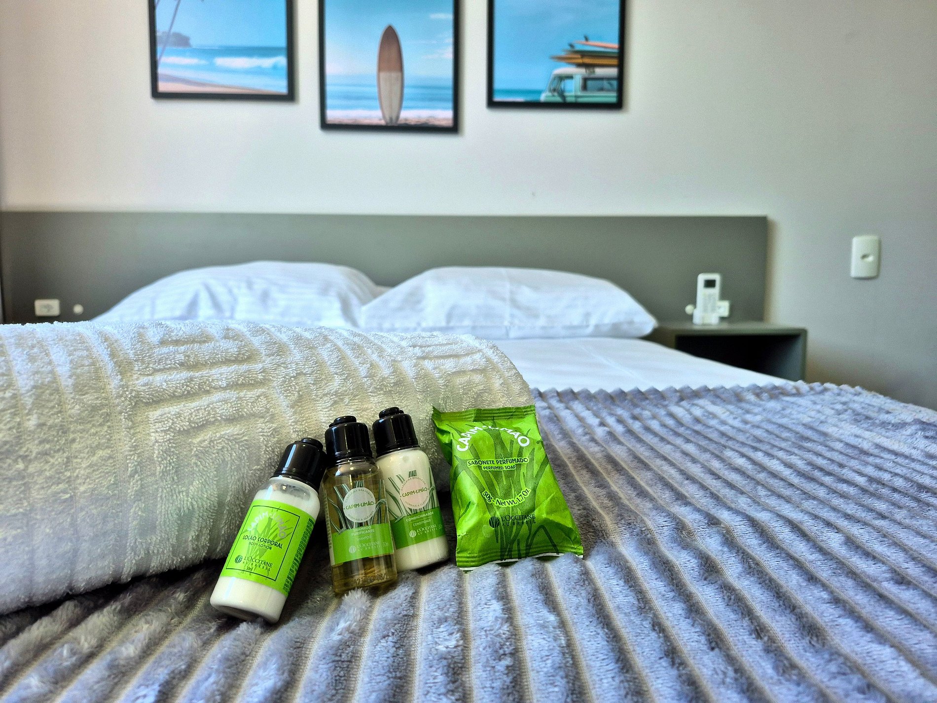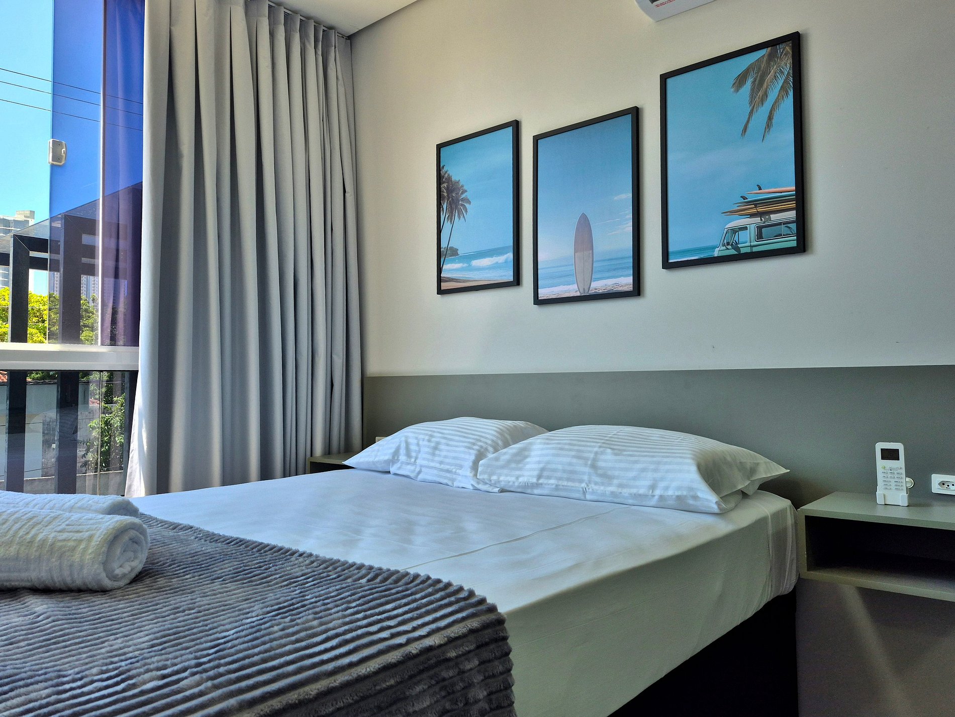 - Cama de casal com enxoval completo, ar condicionado, prateleira de cabeceira, armário com porta espelhada (de corpo inteiro), cortina com black out, mesa de apoio (ou para trabalho) e mesa para refeições com cadeiras;