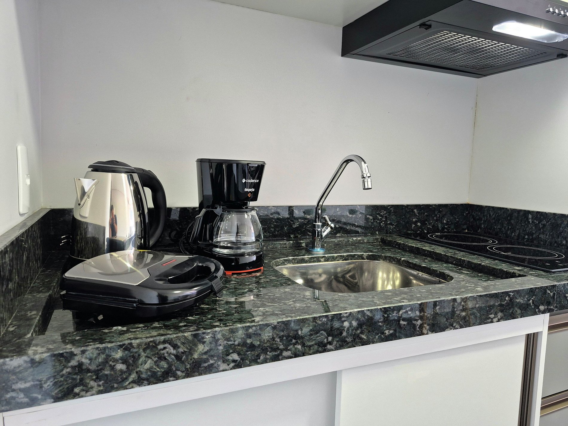 - Cozinha compacta e completa com utensílios (garfos, facas, colheres, saca rolhas) e panelas. Cafeteira, sanduicheira, chaleira elétrica. Fogão por indução, depurador de ar, micro ondas e geladeira com freezer.