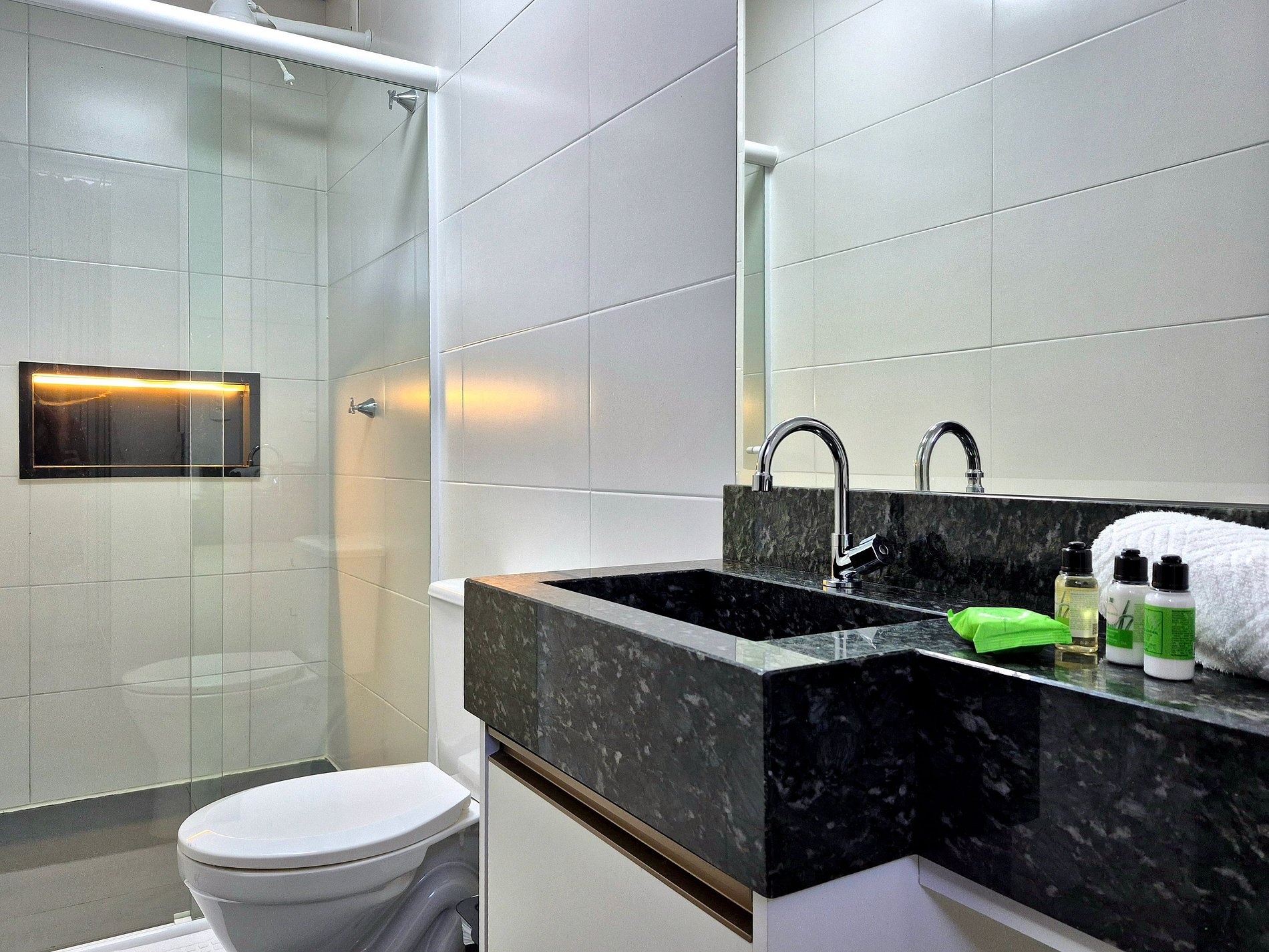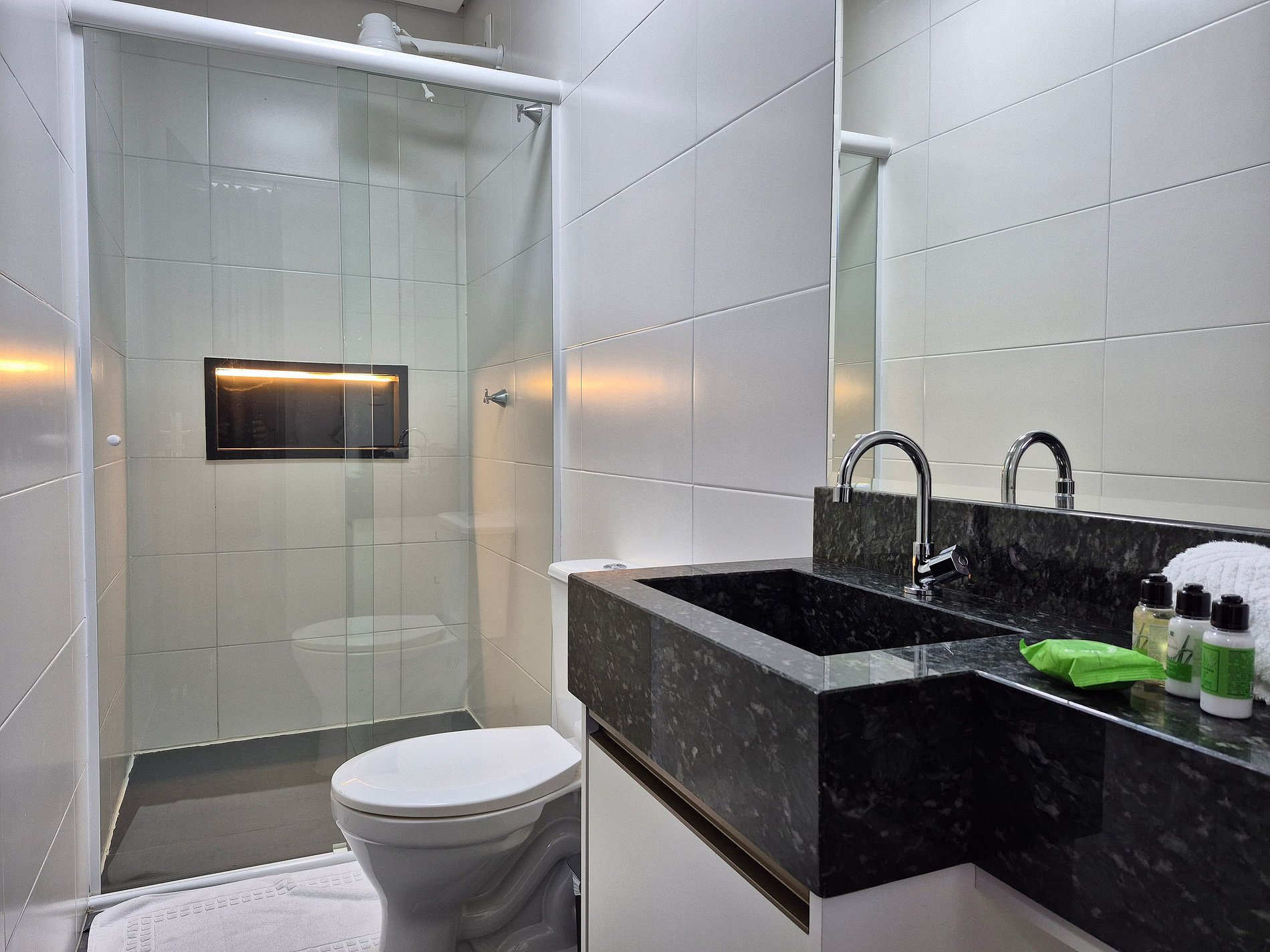 - Chuveiro elétrico; pia com armário; secador de cabelo e espelho de parede.