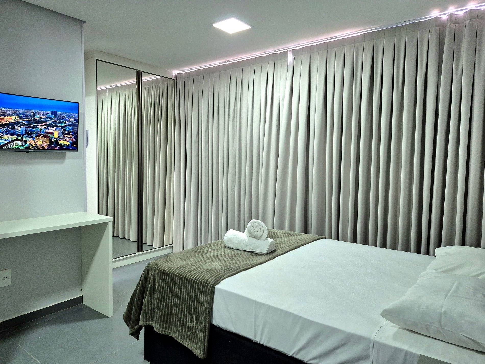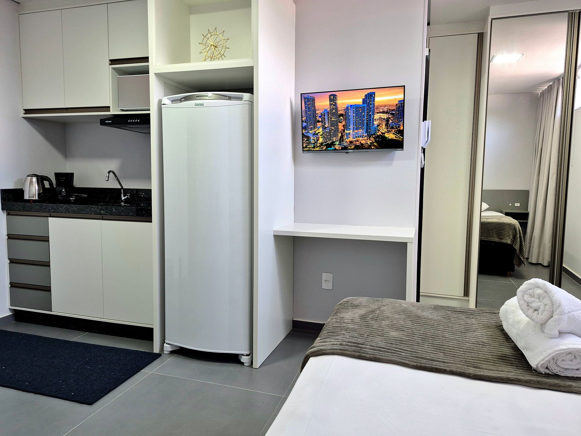 - Guarda roupas com porta espelhada; Smart TV Roku; ferro de passar;