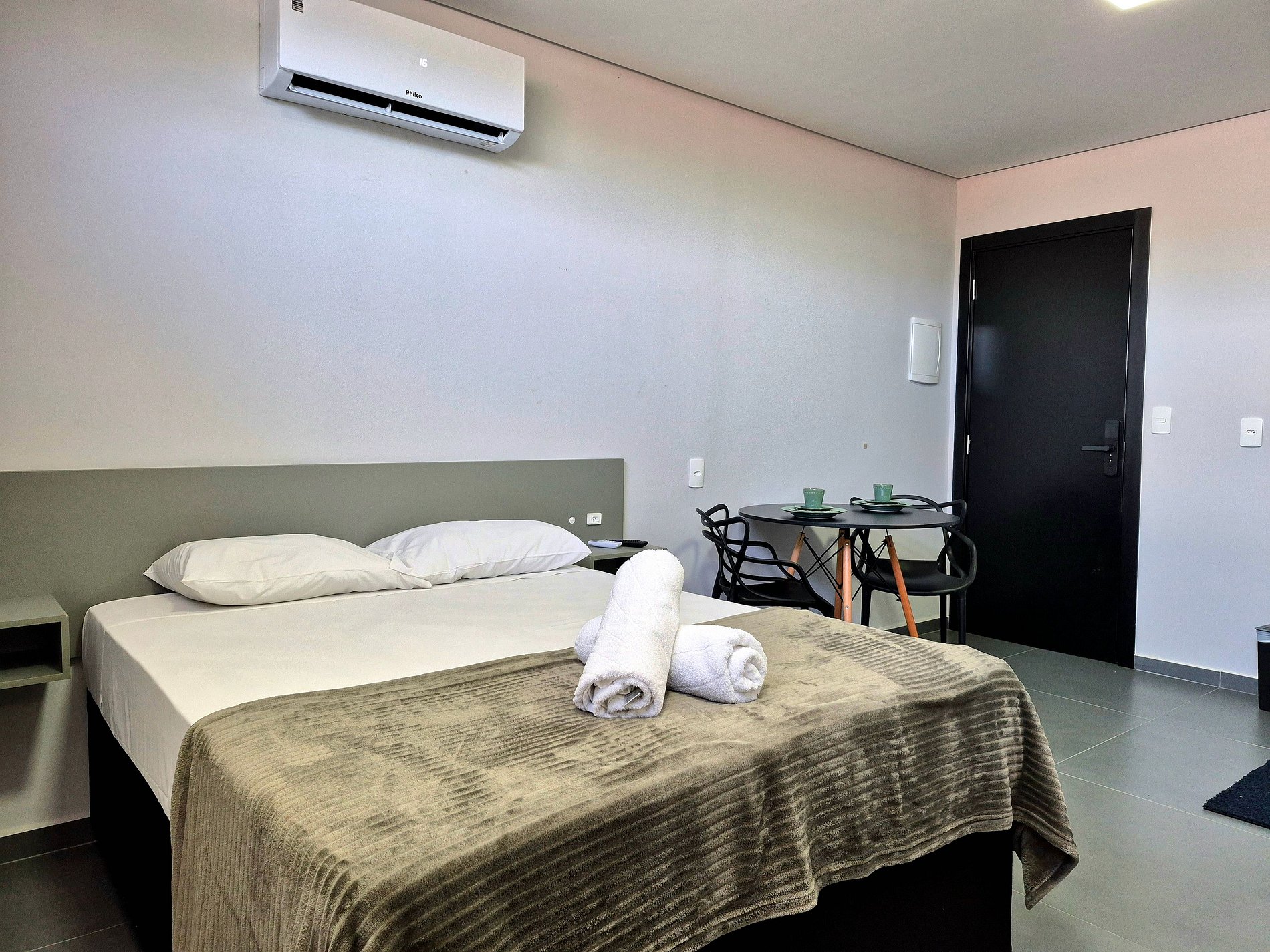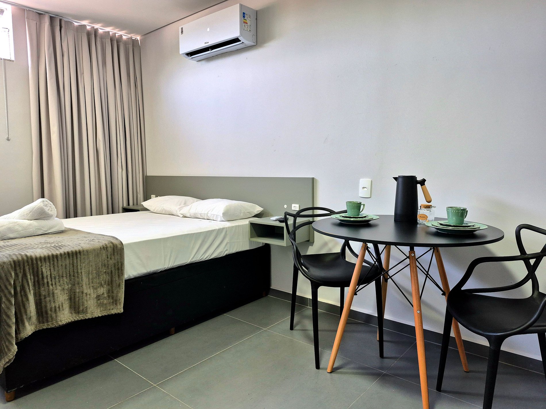 - Mesa para notebook; mesa com duas cadeiras para refeições e cortina black out.