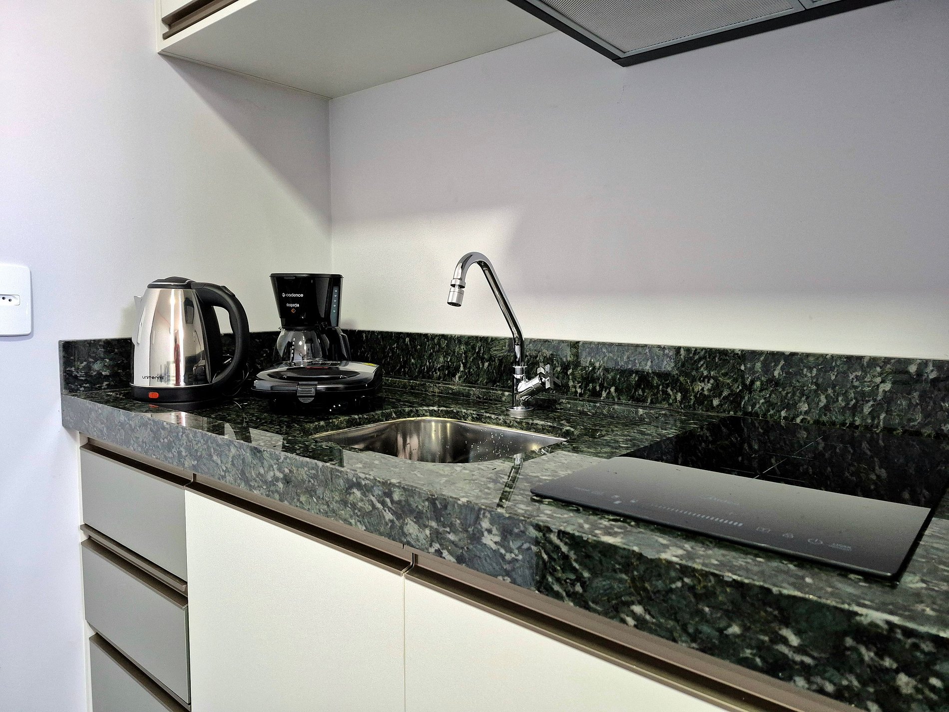 - Pia, fogão por indução, airfryer, cafeteira, sanduicheira, chaleira elétrica;