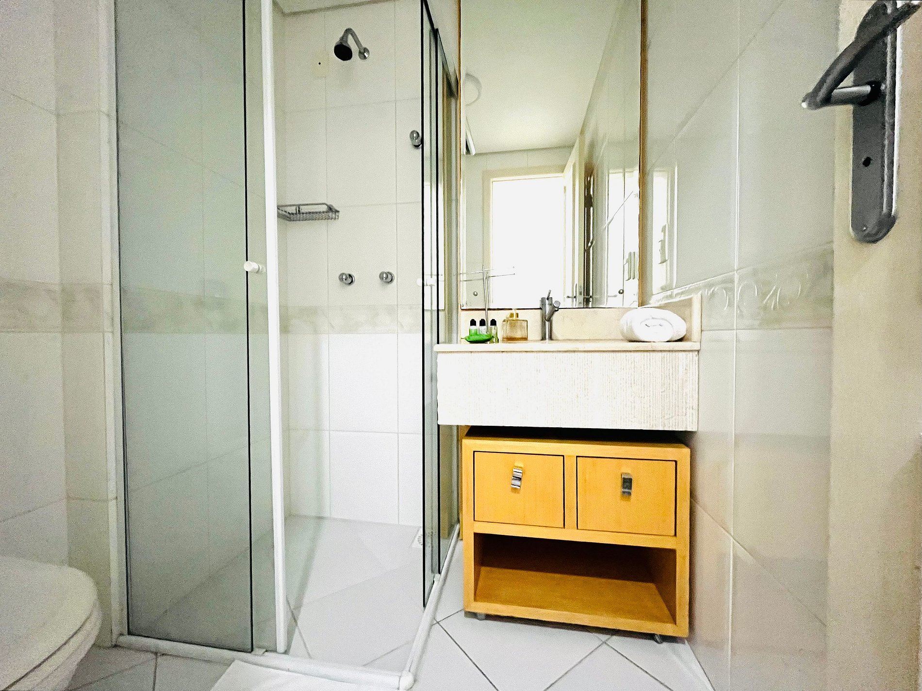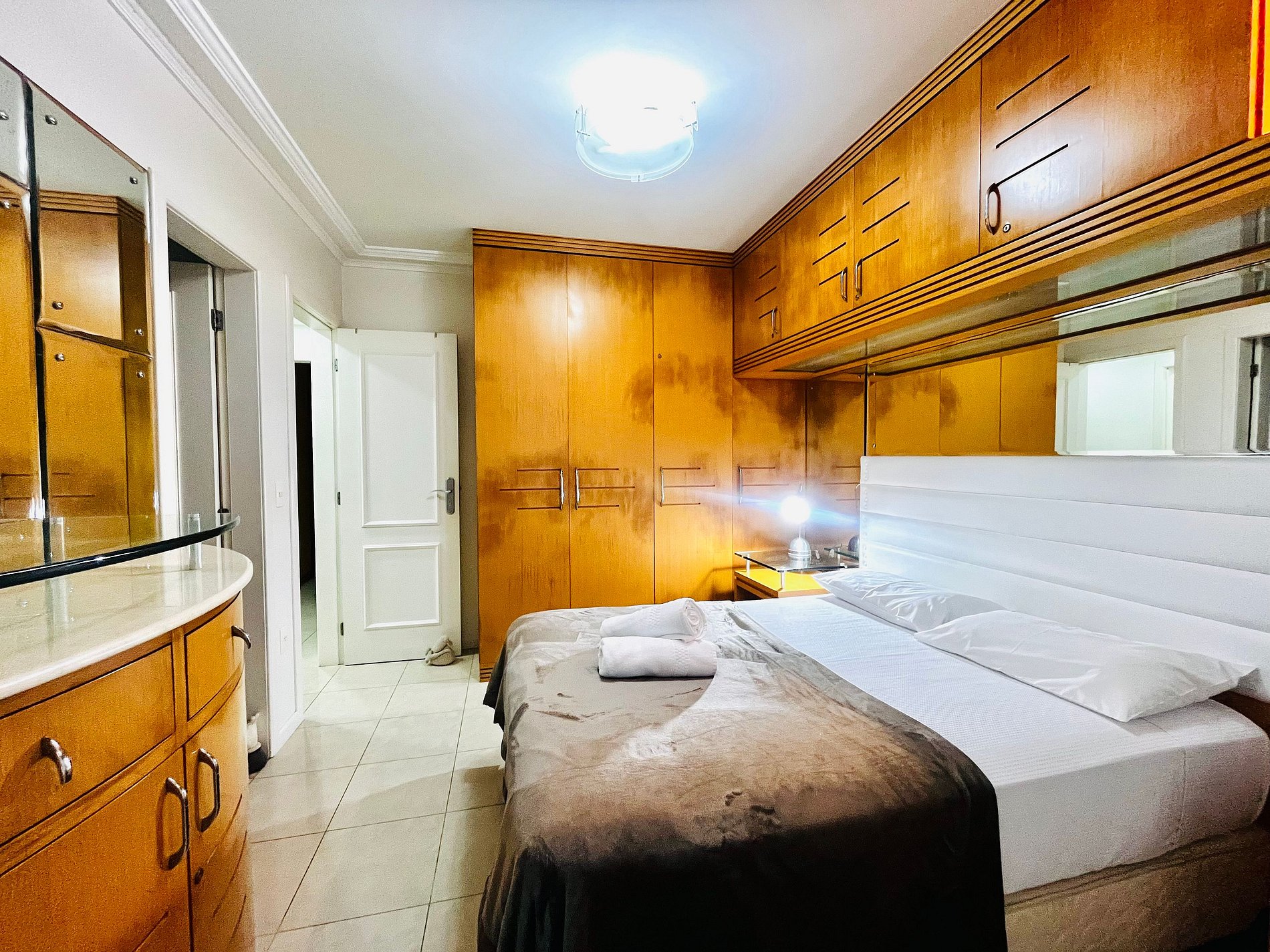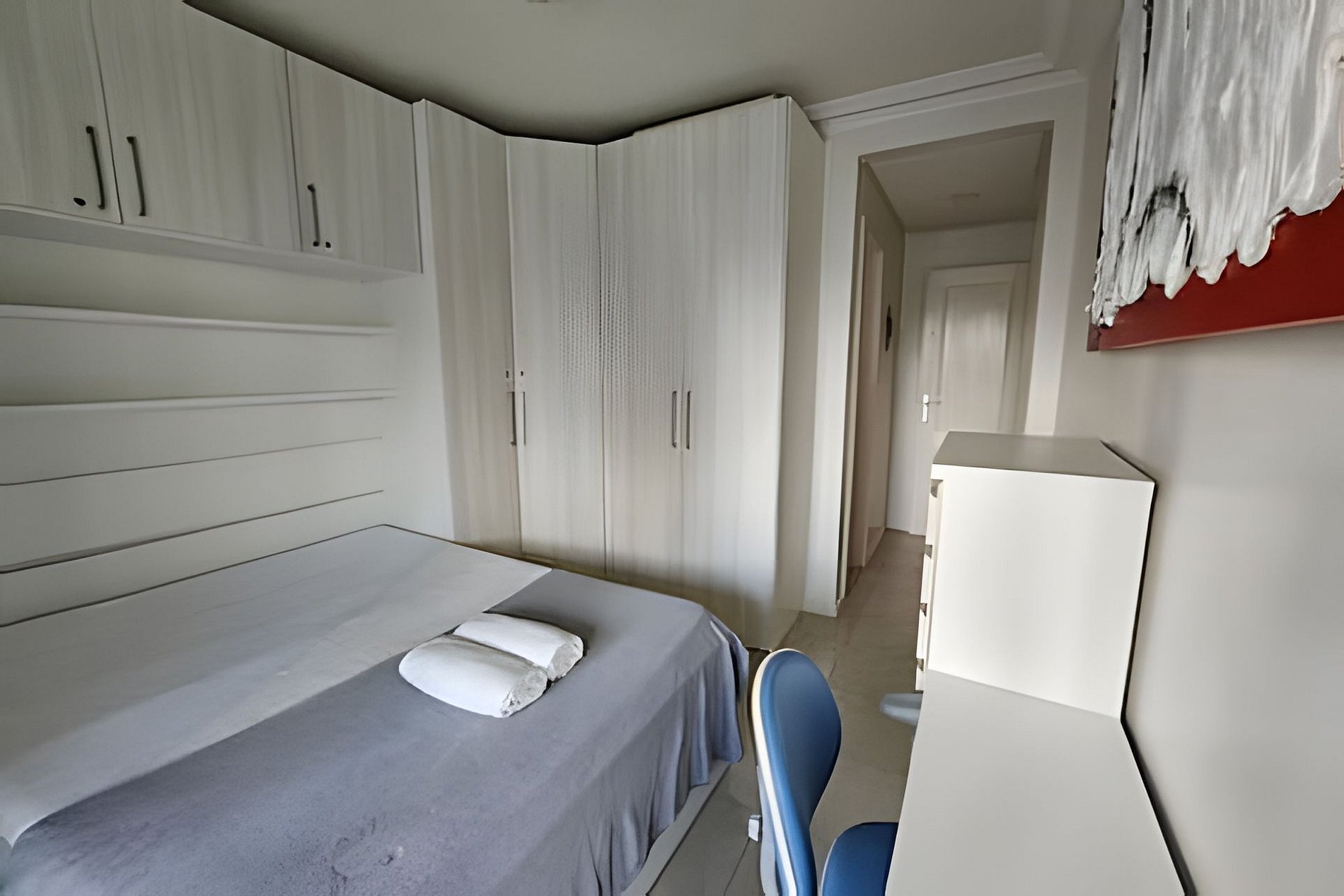 Apartamento espaçoso e muito confortável. A suíte master conta com uma cama queen size e uma deslumbrante vista para o mar. A segunda suíte possui uma cama de casal, enquanto o terceiro quarto (que também pode ser usado como escritório) dispõe de um sofá-cama de casal pequeno porém confortável. O apartamento conta ainda com uma lavanderia equipada com máquina de lavar e varal, proporcionando mais praticidade durante a estadia.