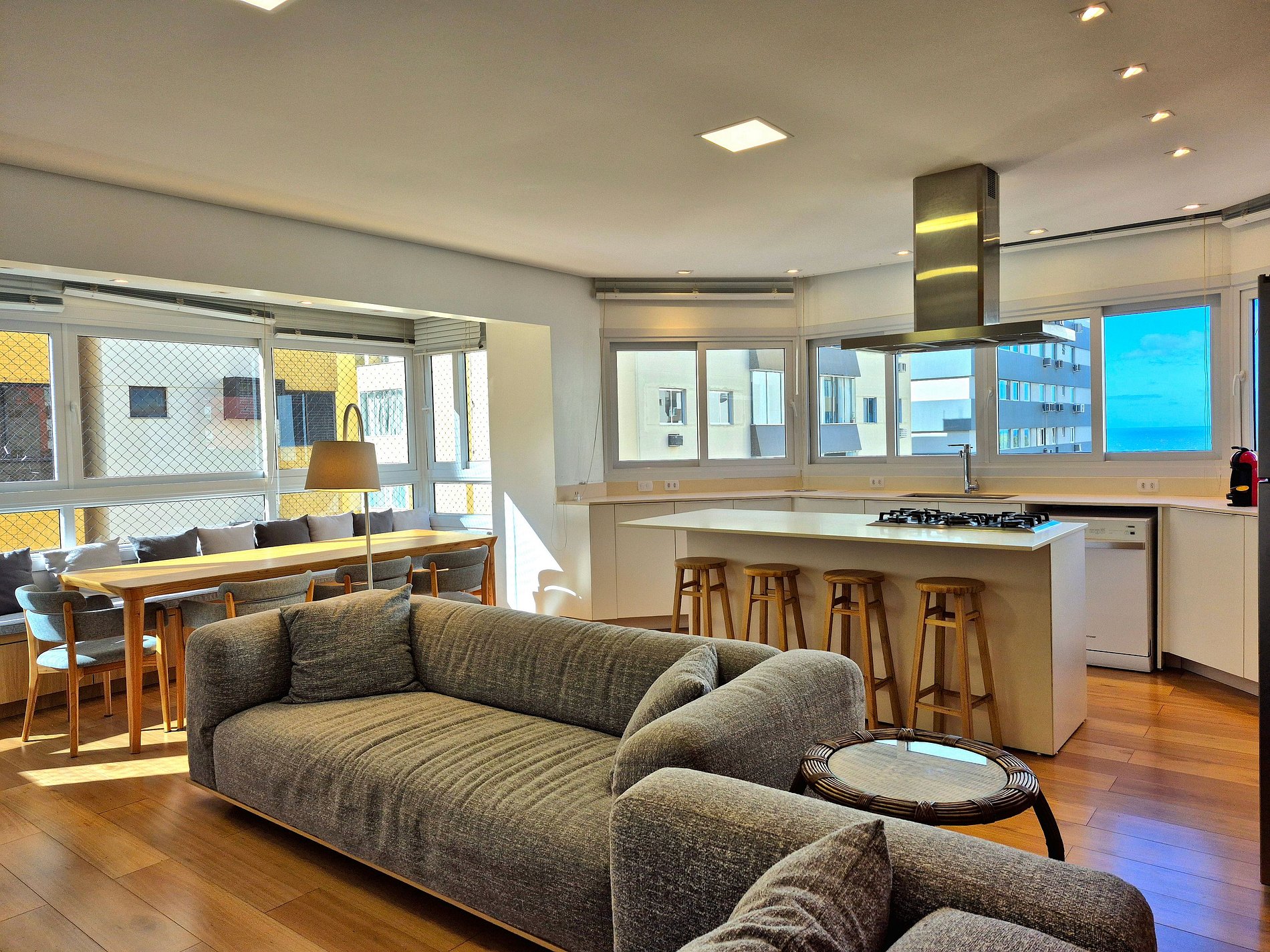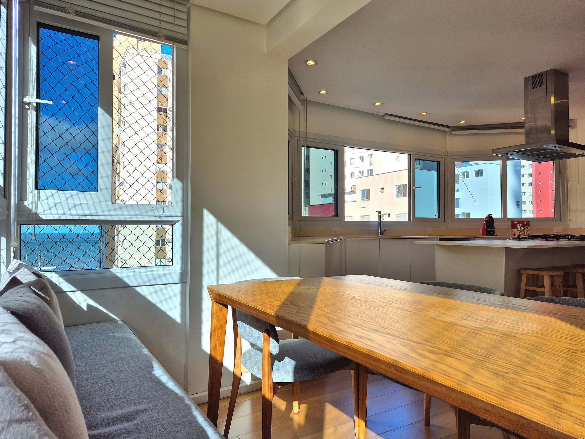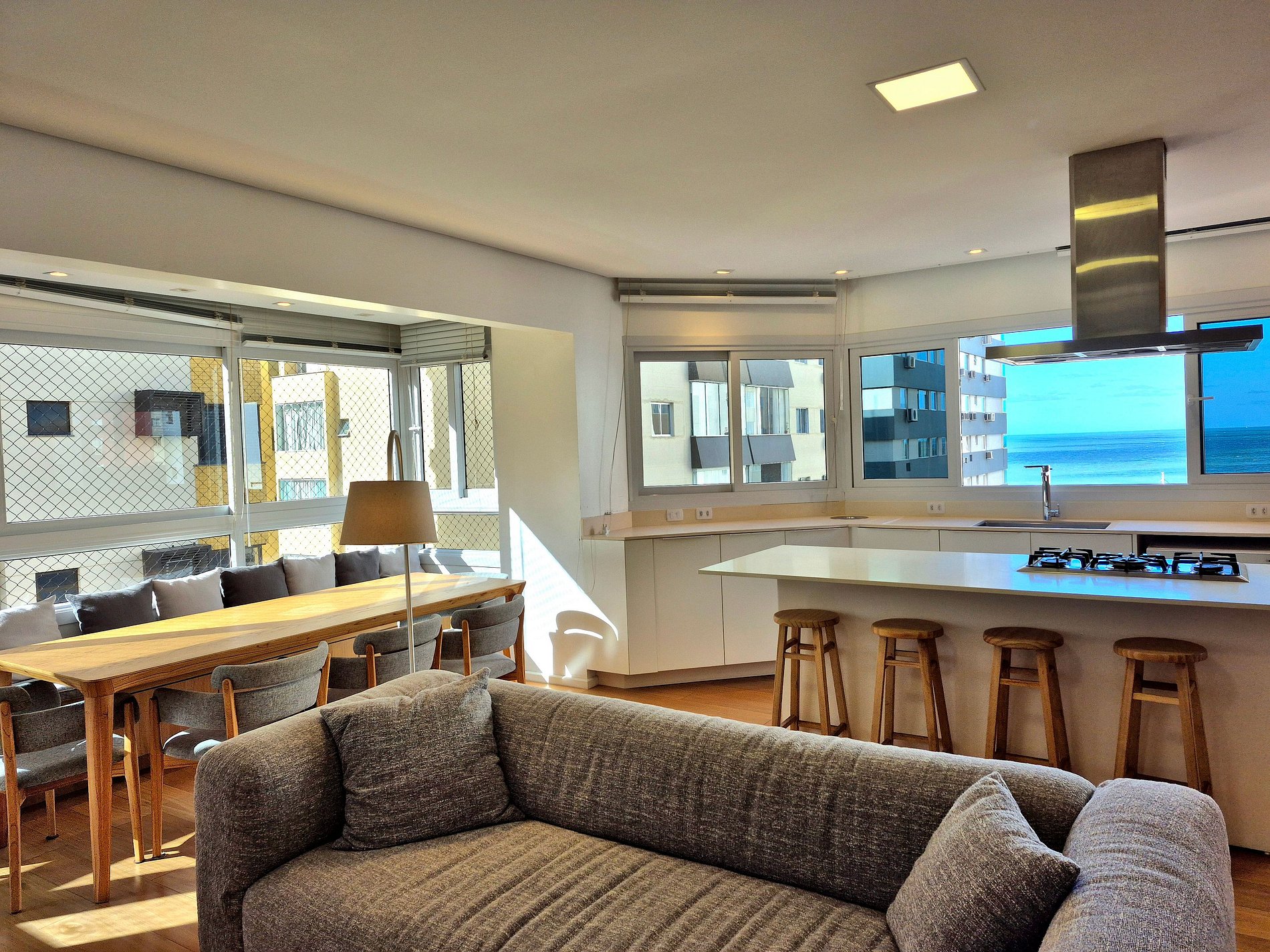 Nossa sala de jantar tem vista para o mar e possui mesa grande com cadeiras. Cozinha completa com utensílios e eletro domésticos, grande bancada e ilha central. Além das suítes, também tem um lavabo charmoso que passa imperceptível no design do apartamento. Nossa lavanderia é extremamente espaçosa com máquina de lavar, varal, e outros itens para suprir quaisquer necessidades do cotidiano.