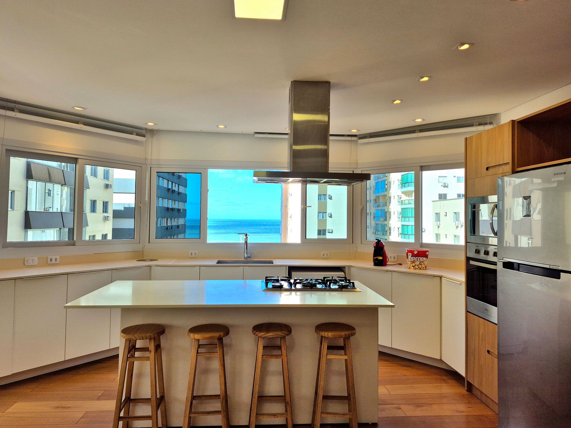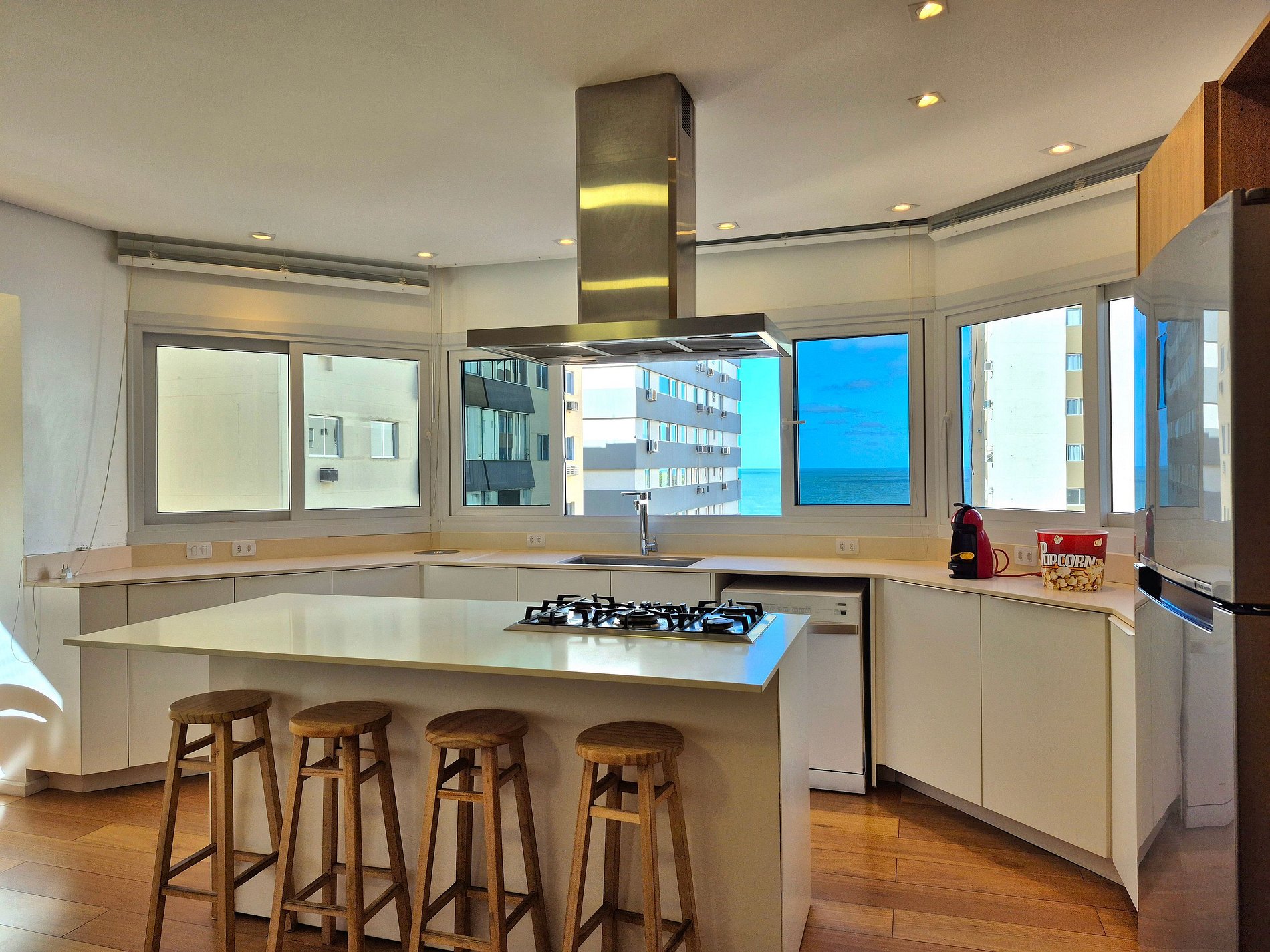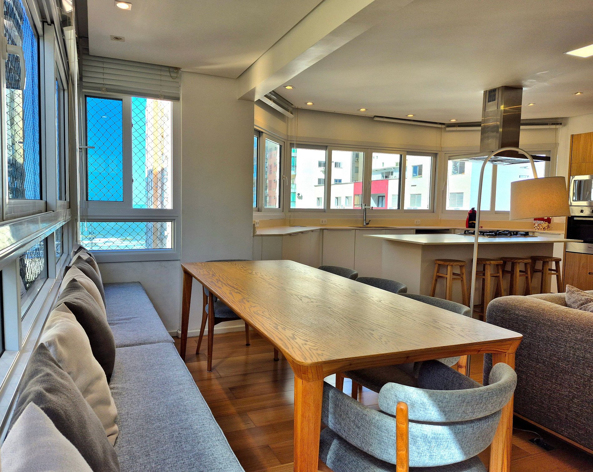 Nossa sala de jantar tem vista para o mar e possui mesa grande com cadeiras. Cozinha completa com utensílios e eletro domésticos, grande bancada e ilha central. Além das suítes, também tem um lavabo charmoso que passa imperceptível no design do apartamento. Nossa lavanderia é extremamente espaçosa com máquina de lavar, varal, e outros itens para suprir quaisquer necessidades do cotidiano.