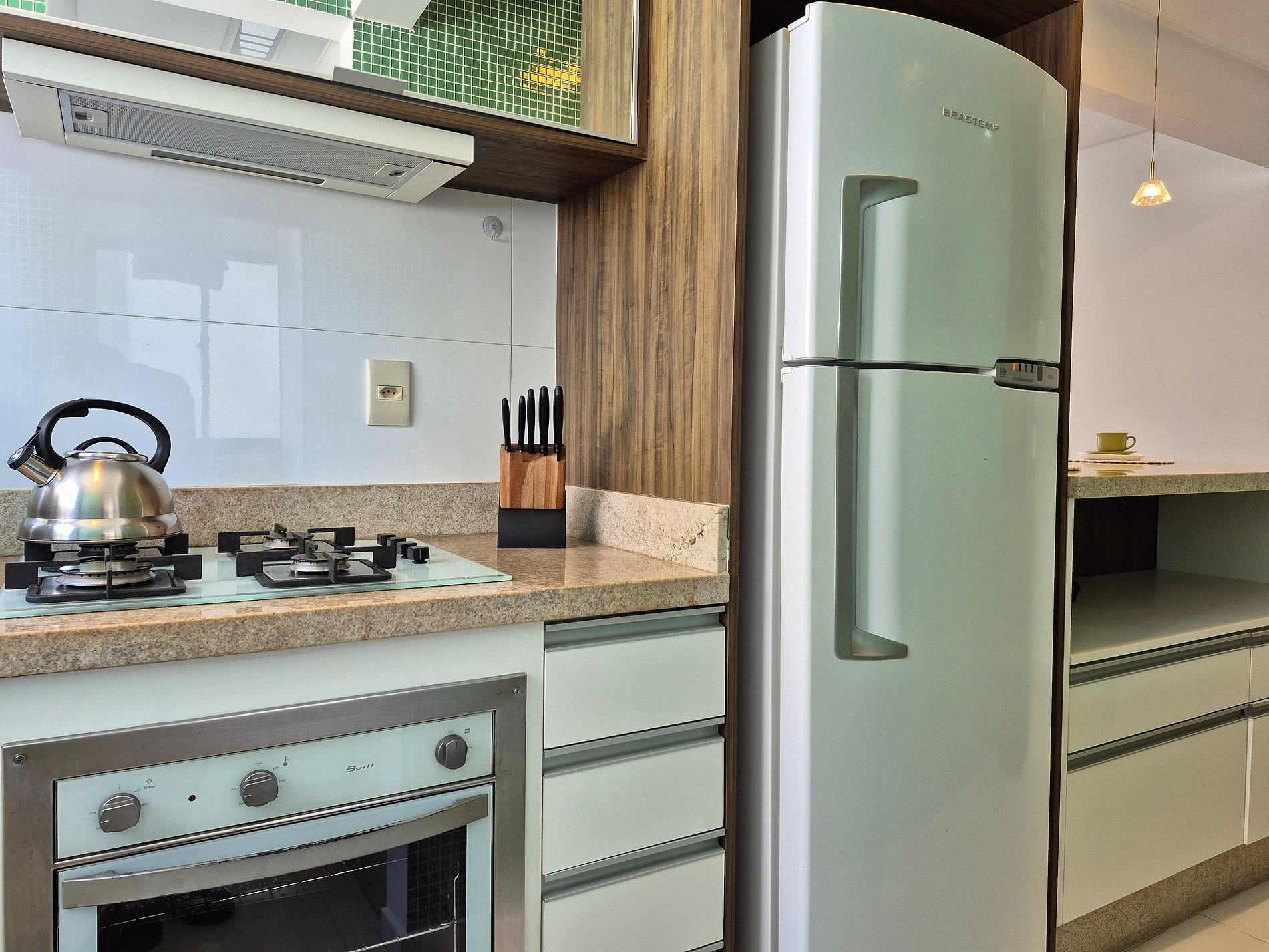 - Micro-ondas, chaleira elétrica, forno, fogão 4 bocas, cafeteira French Press, geladeira e pia com água quente/fria;