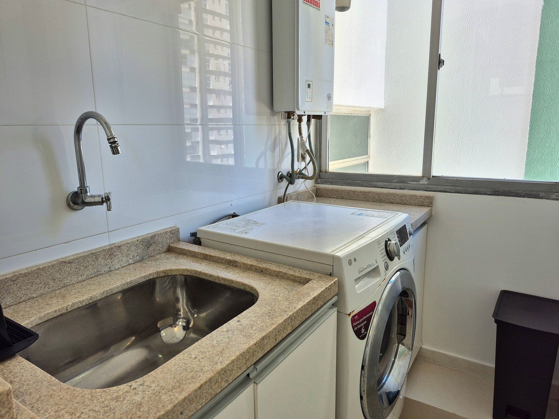 Área de serviço com máquina Lava e Seca, tanque e varal.