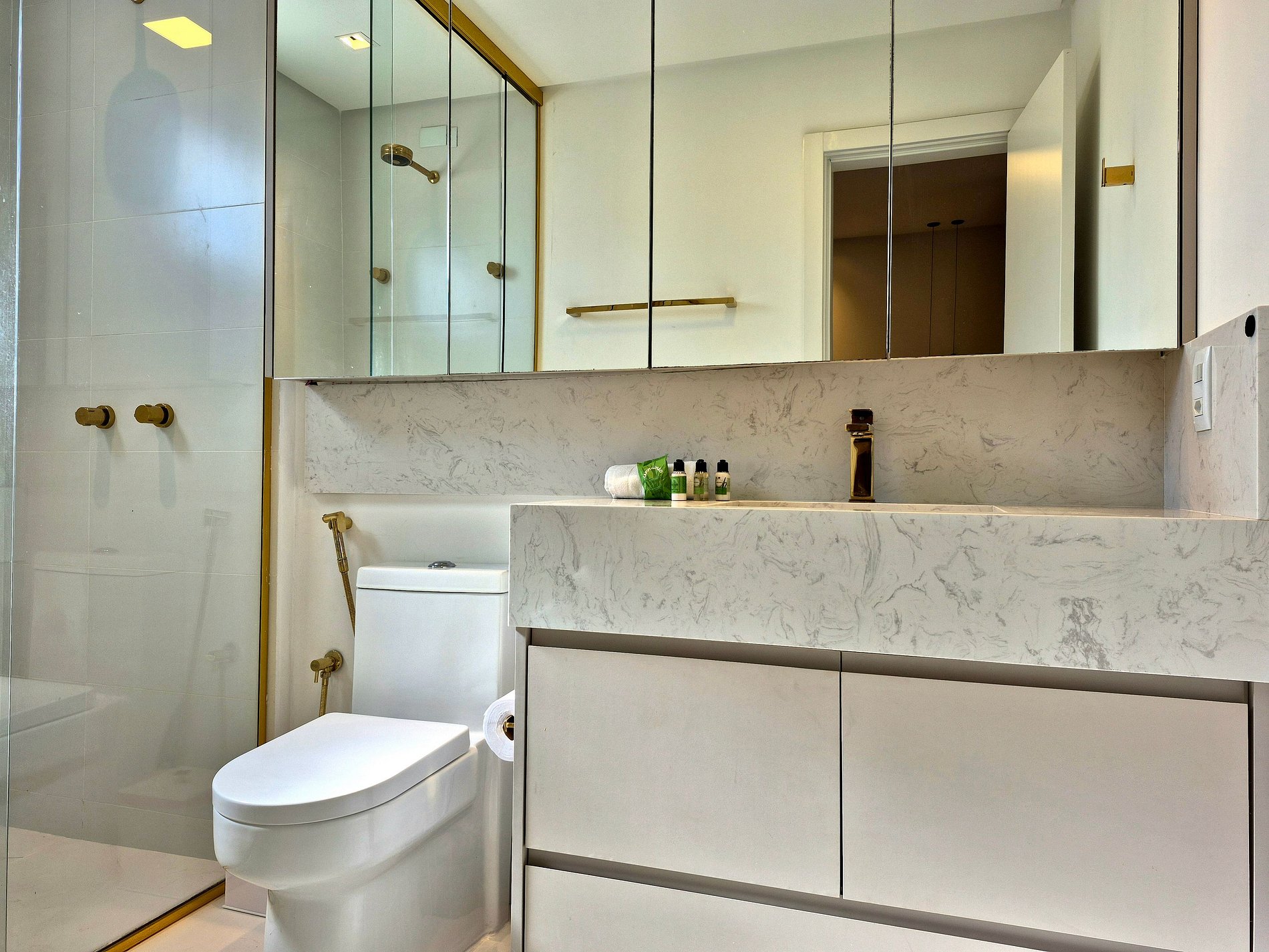 O apartamento conta com duas belas suítes muito bem planejadas! Uma das suítes destaca-se pelo acabamento em dourado, trazendo charme e requinte além do duplo chuveiro no banheiro.