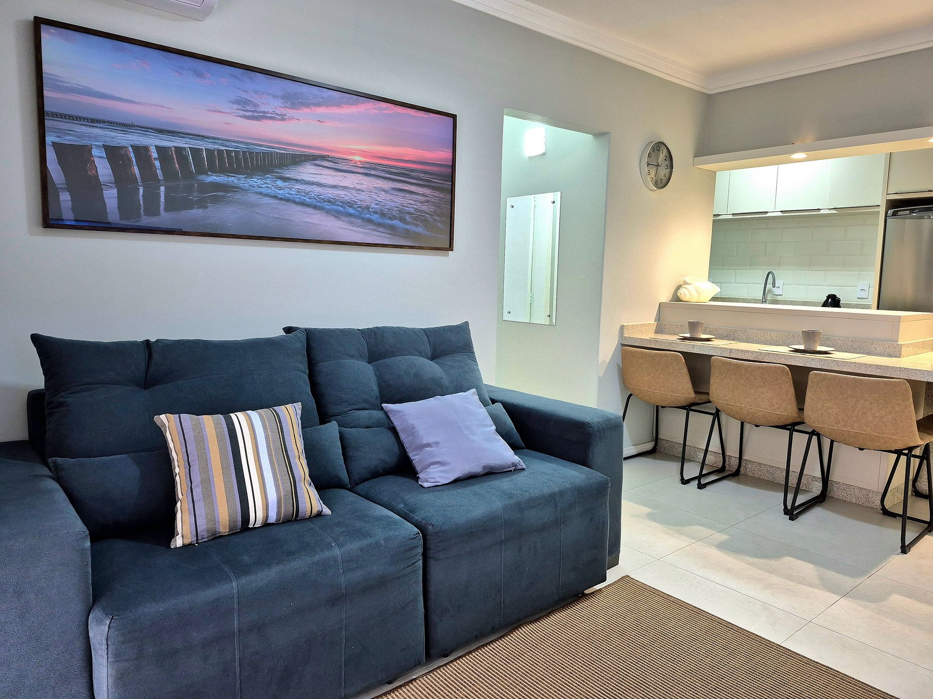 Em excelente localização, nosso apartamento possui 1 quarto com cama de casal, 1 banheiro, cozinha equipada com utensílios e eletrodomésticos, sala de estar, TV com serviço Streaming e sofá confortável para momentos de relaxamento. Contamos com uma pequena sacada para observar o movimento.