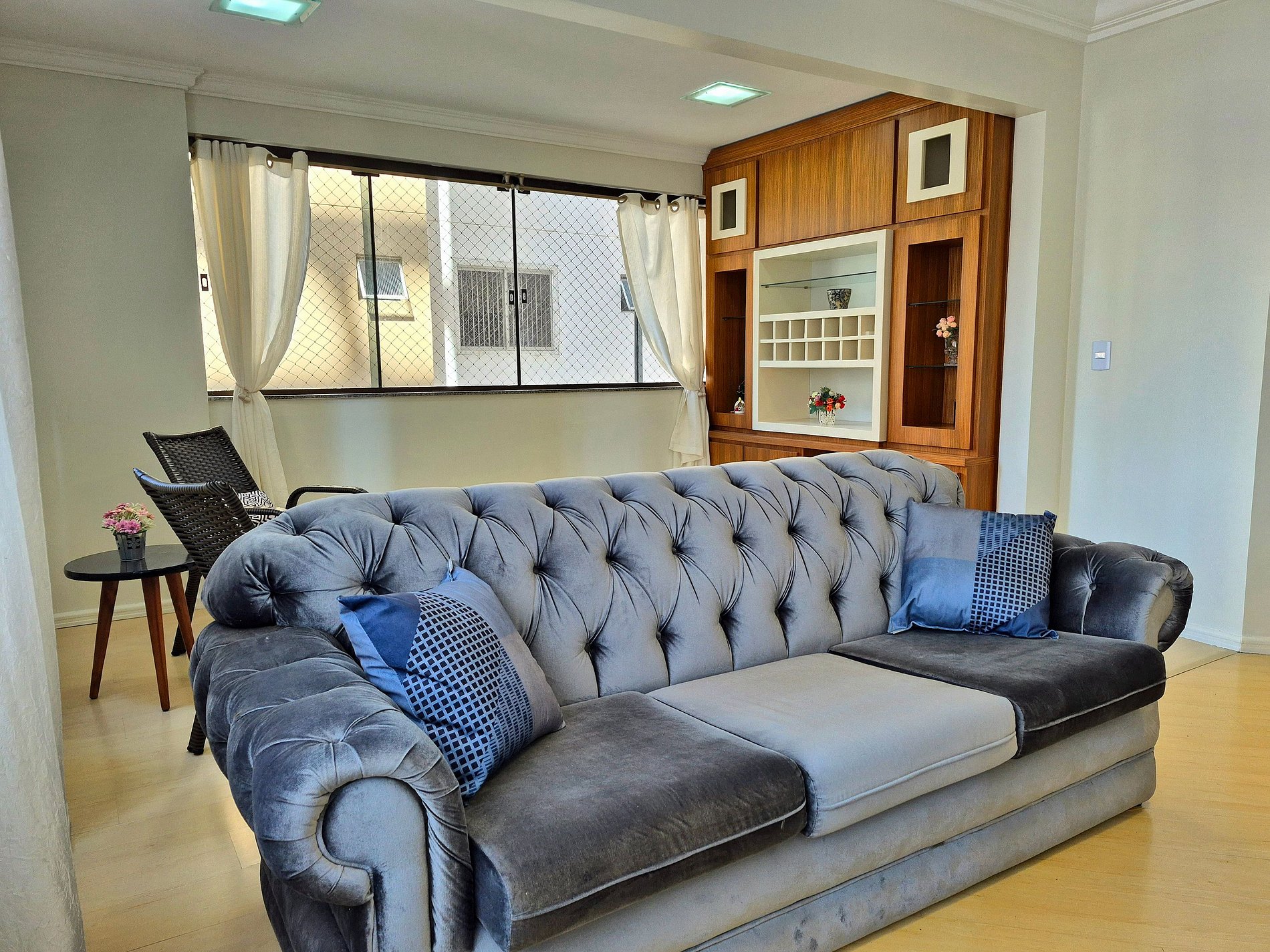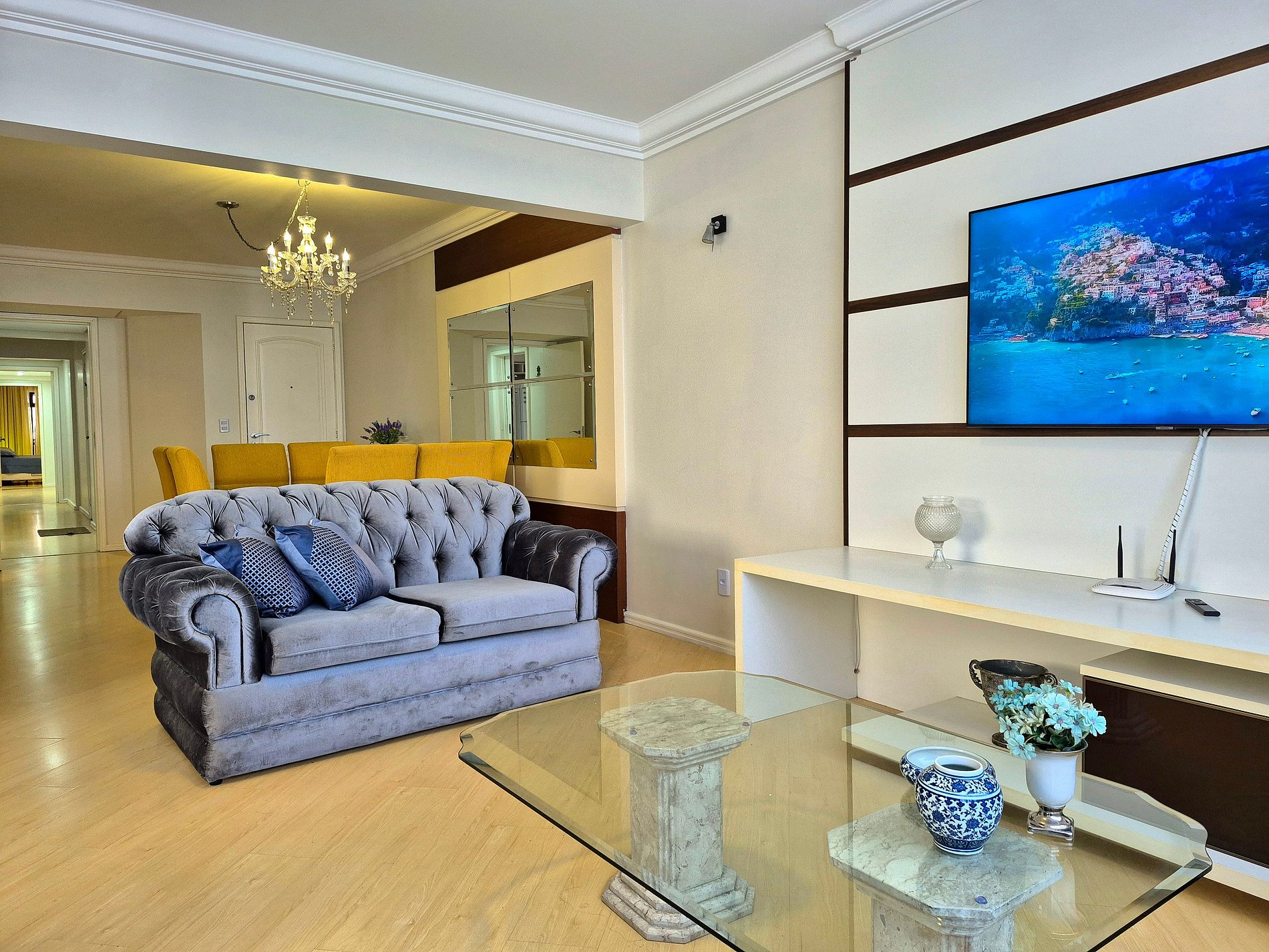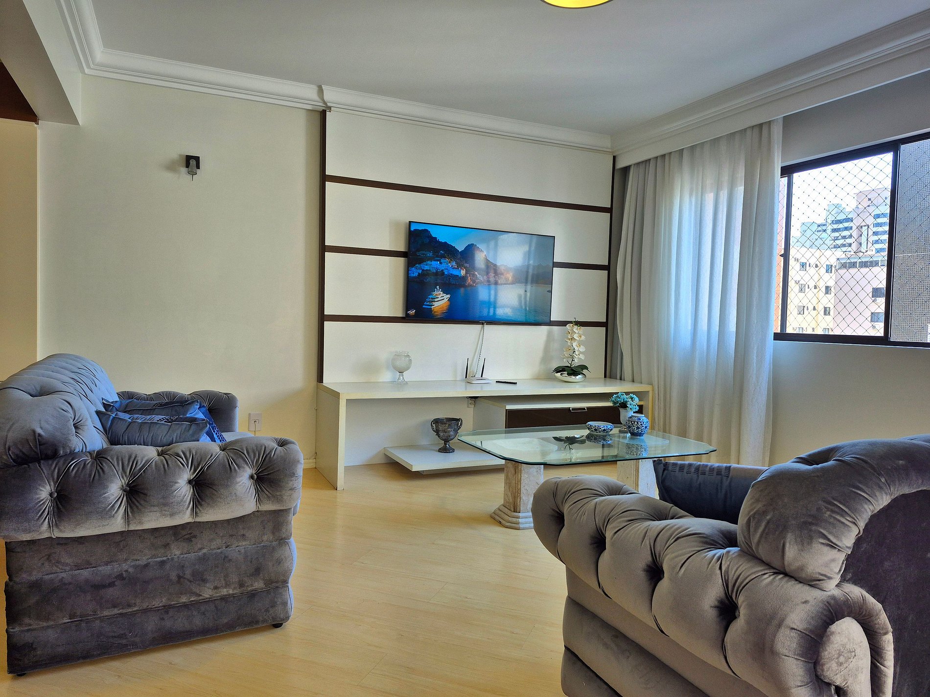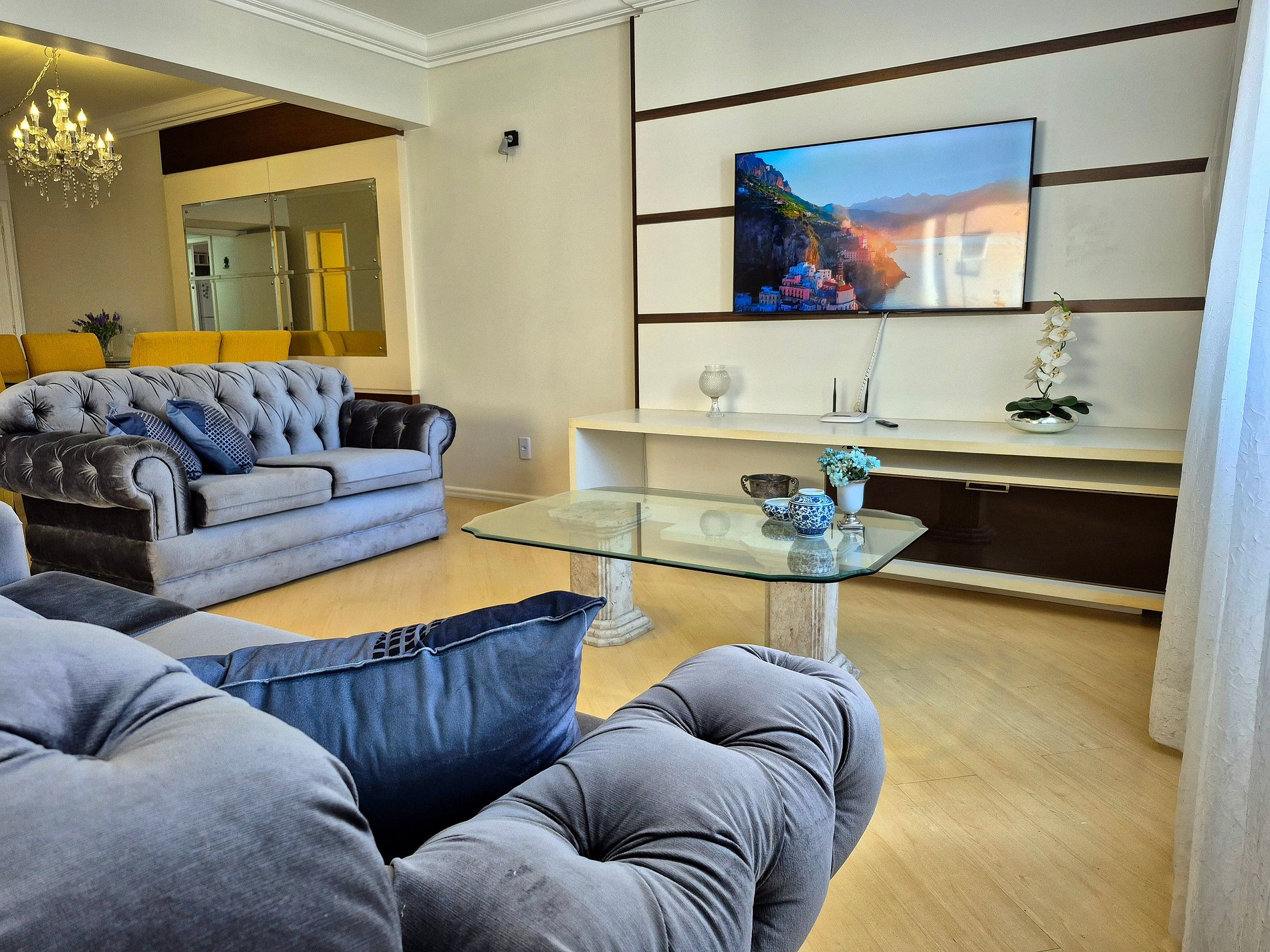 Sala de estar com Smart TV e ao lado, um espaço com cadeiras para sentar e conversar. O apartamento ainda possui mais uma sala com televisão, e espaço para relaxar ou trabalhar nas suítes de casal.