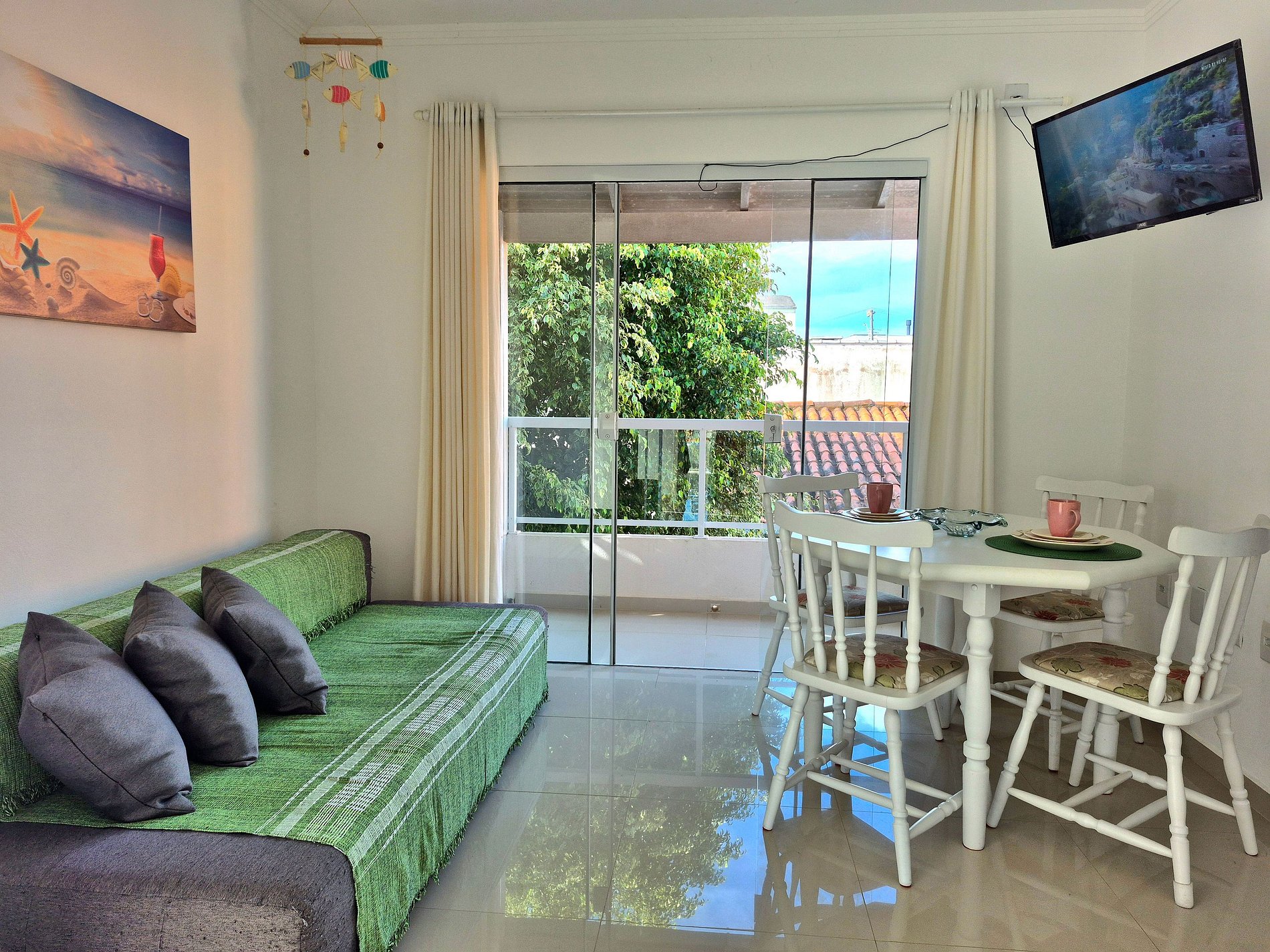 Nossa cozinha é completa com utensílios e a sala possui Smart TV, sofá e mais uma sacada, trazendo mais ventilação e iluminação pro ambiente!