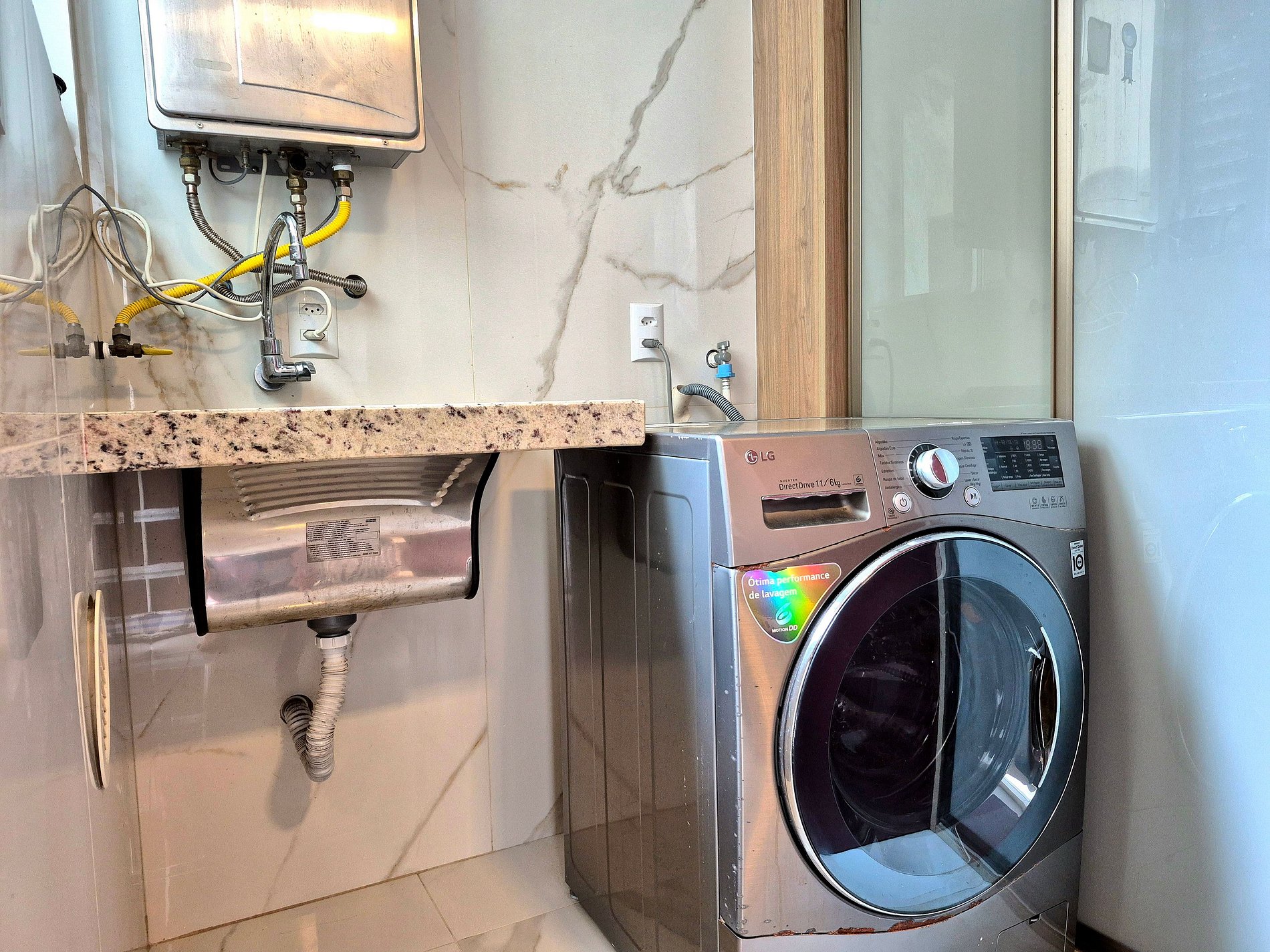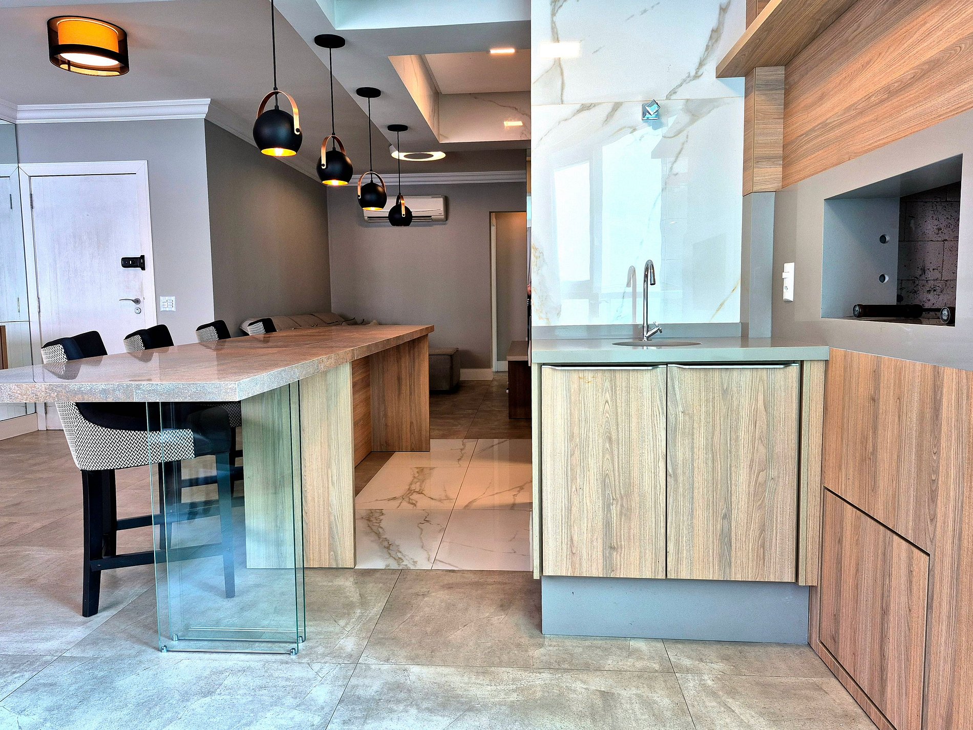 Acomodando confortavelmente até 5 pessoas, nosso apartamento possui 1 suíte com acesso a piscina, mais um quarto com cama de casal, um closet enorme com penteadeira iluminada, sala de estar com baixa iluminação e Smart TV, sala de jantar requintada, cozinha completa e área gourmet com churrasqueira a carvão.