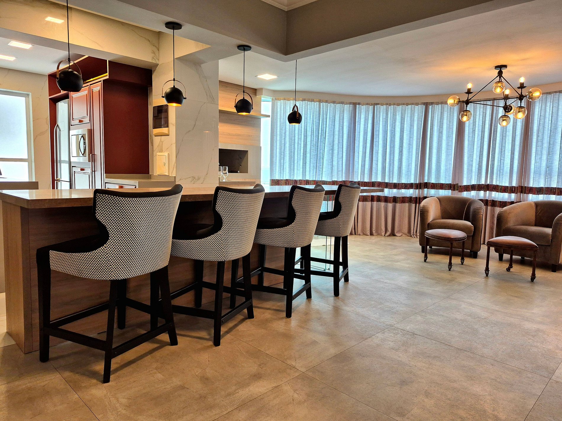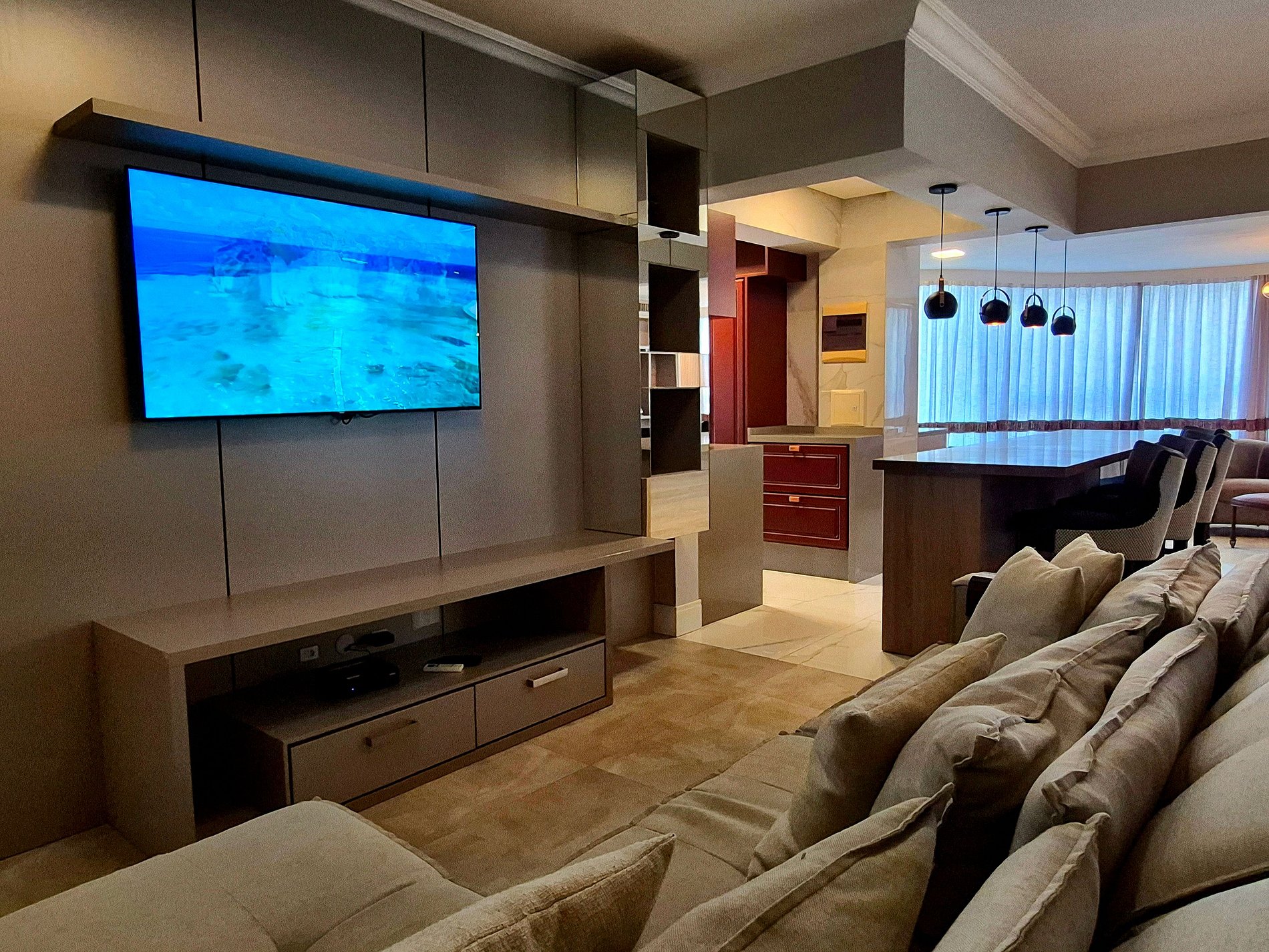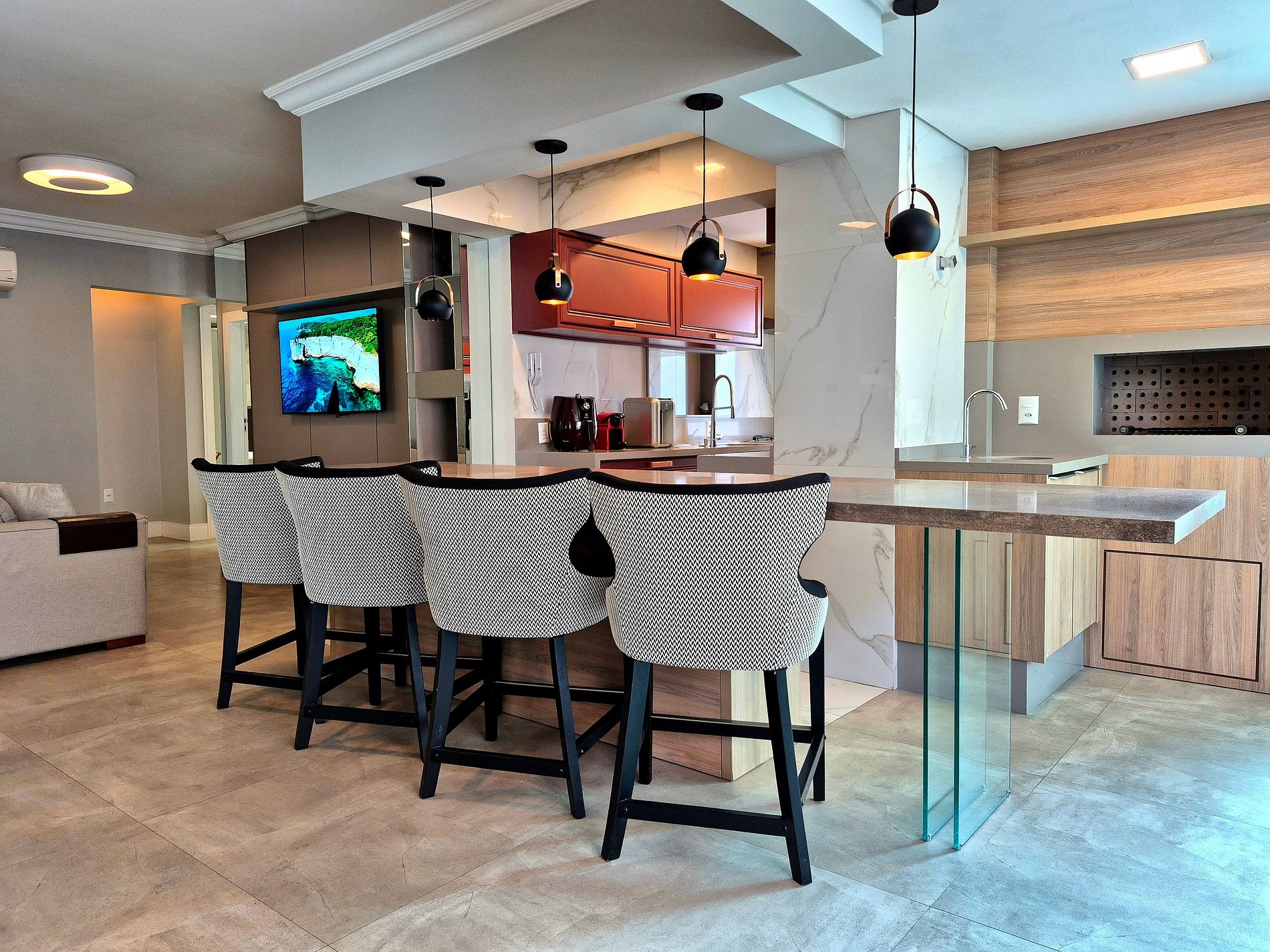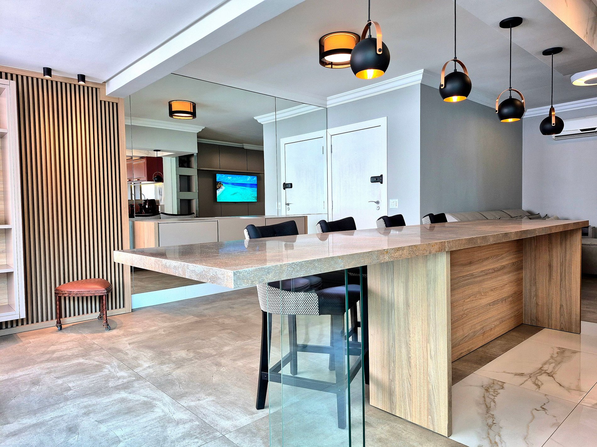 Acomodando confortavelmente até 5 pessoas, nosso apartamento possui 1 suíte com acesso a piscina, mais um quarto com cama de casal, um closet enorme com penteadeira iluminada, sala de estar com baixa iluminação e Smart TV, sala de jantar requintada, cozinha completa e área gourmet com churrasqueira a carvão.