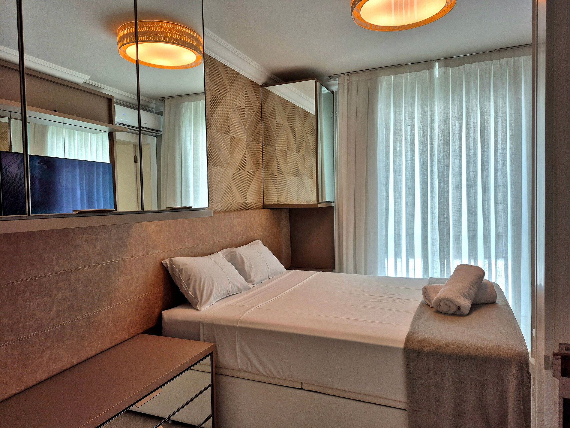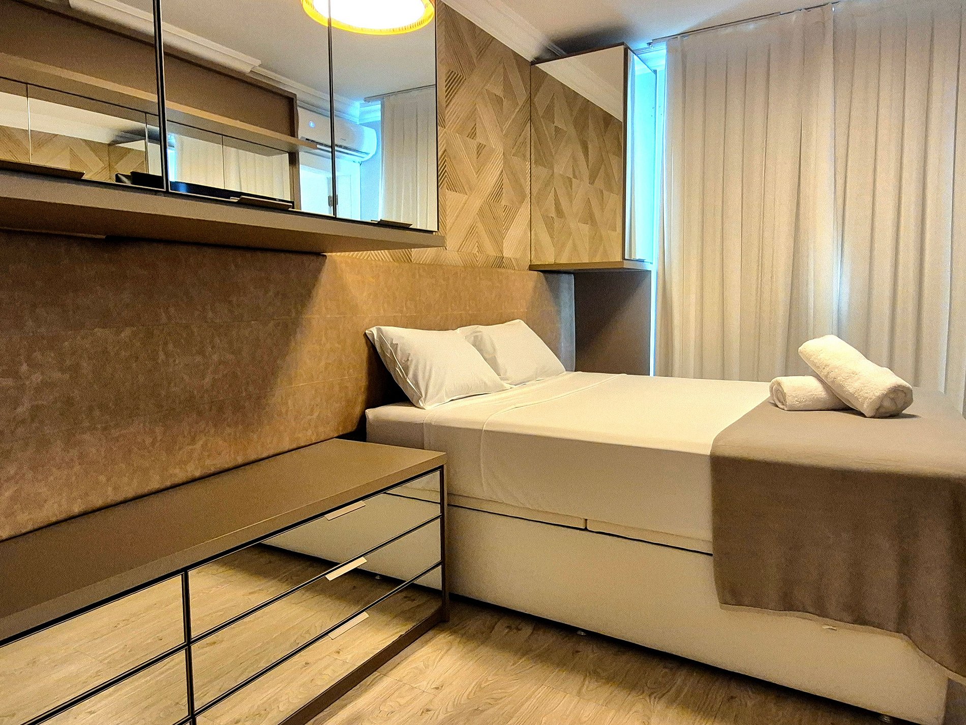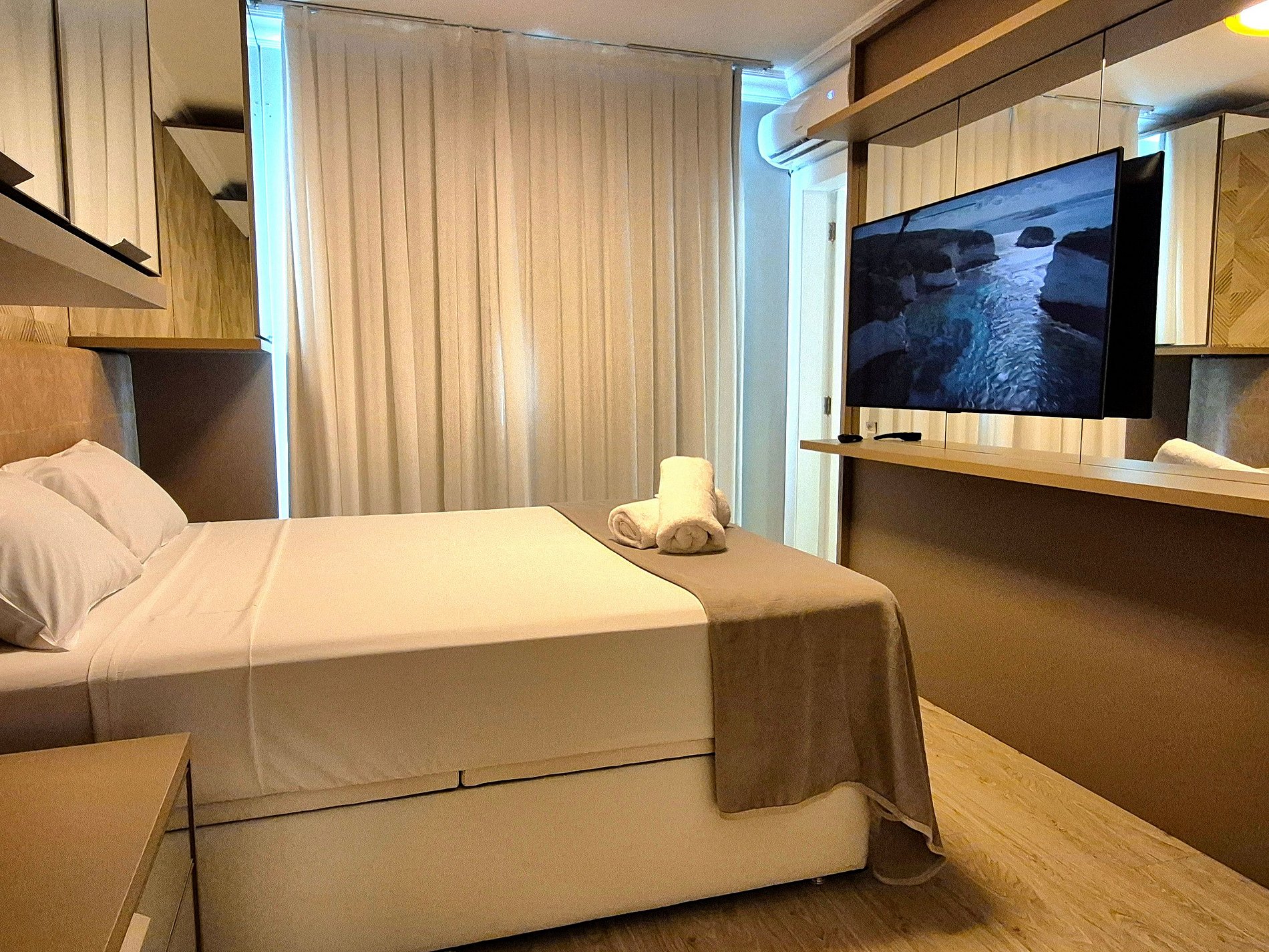 Todos os cômodos são amplos e confortáveis. Uma suíte com Smart TV, um quarto com cama de casal, closet enorme com penteadeira iluminada, trazendo mais conforto na hora de se vestir e arrumar para aproveitar a cidade, ou servindo para quarto com colchão de solteiro. Esse apartamento é perfeito para 4 pessoas em camas mas acomoda até 6, sendo estas acomodadas em 2 colchões de solteiro. Lembrando que em nosso closet é possível acomodar um colchão de solteiro tranquilamente, uma vez que neste cômodo também temos ar condicionado.