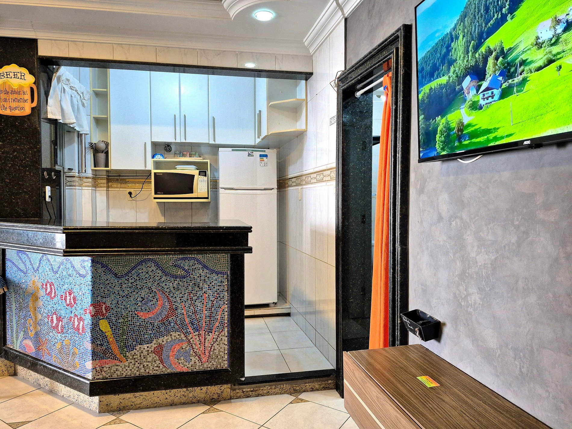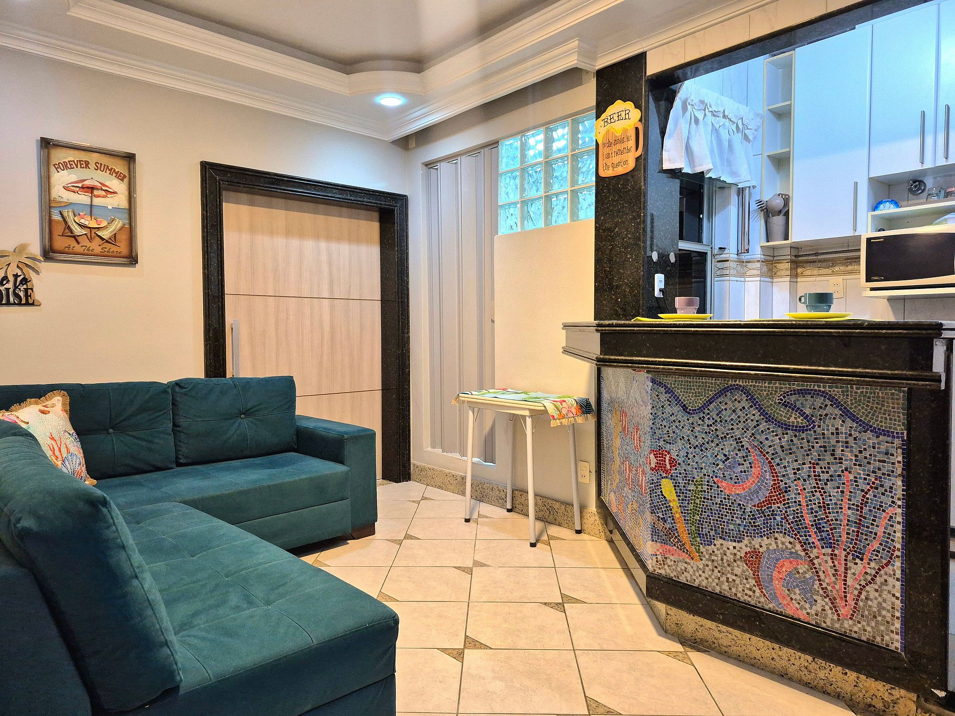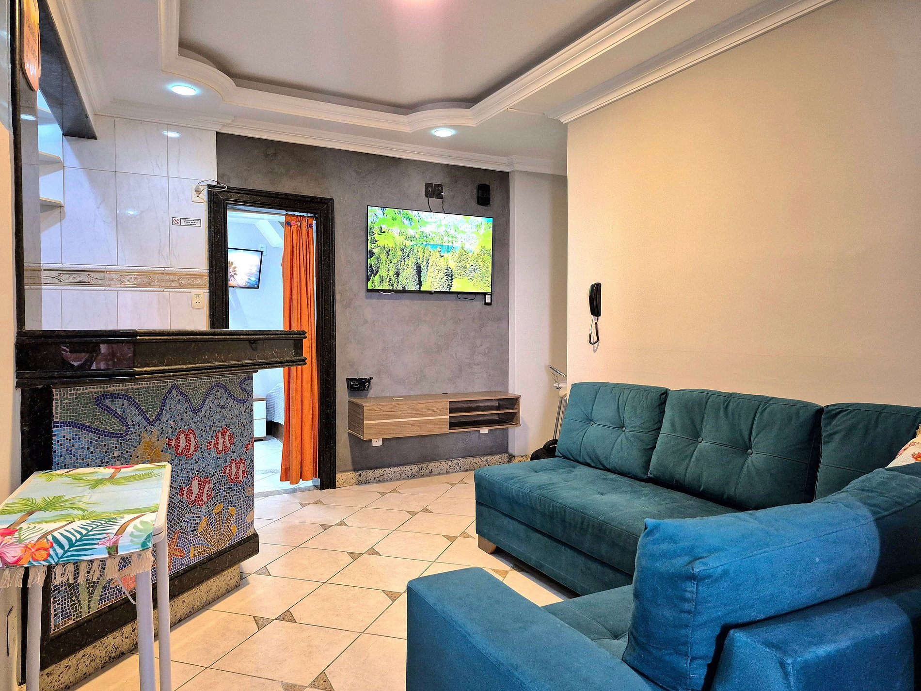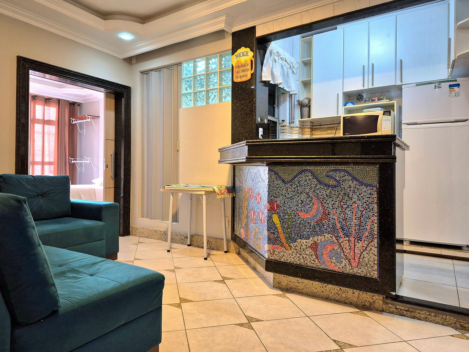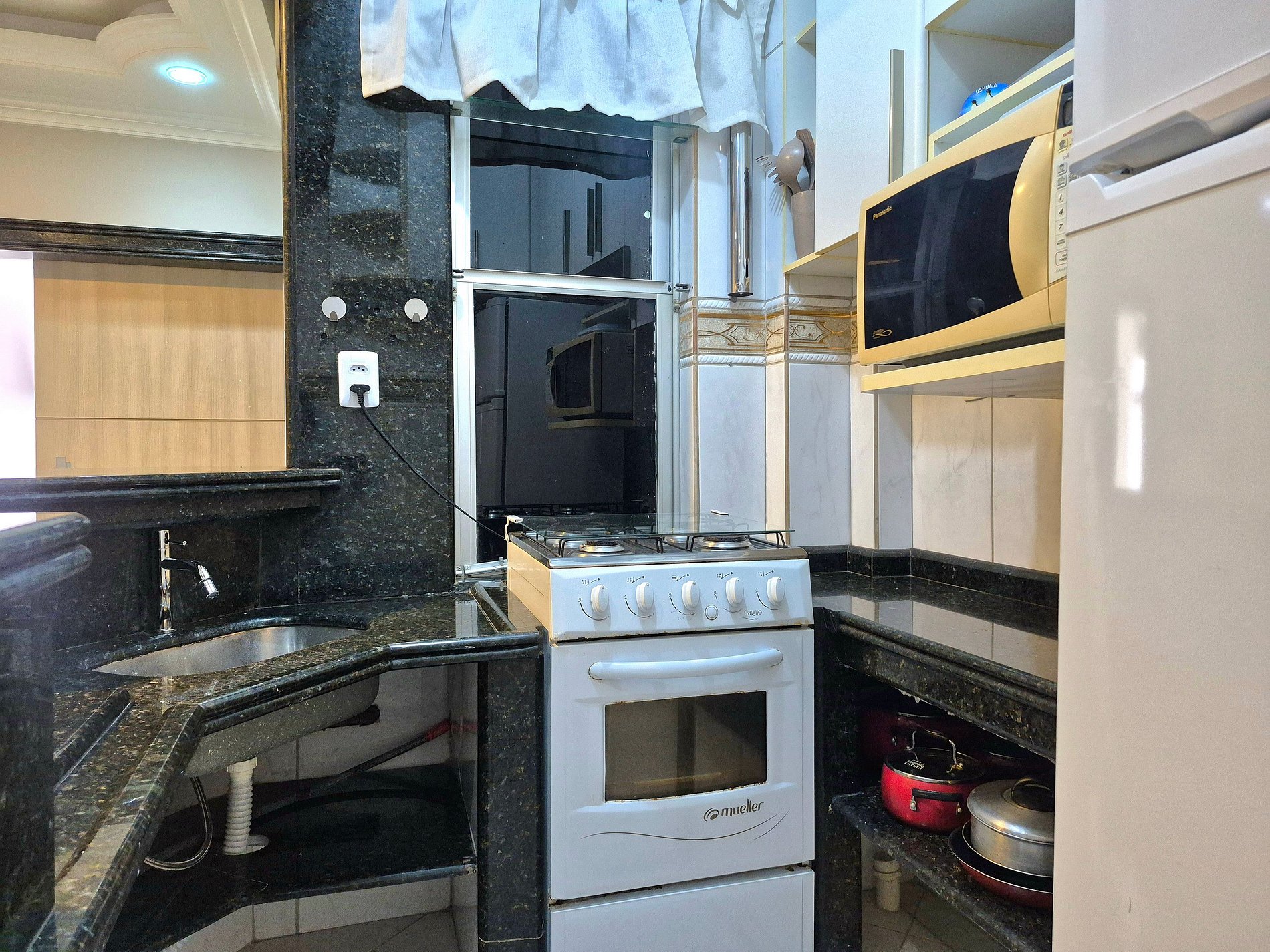 Nossa sala é aconchegante e nosso sofá acomoda muito bem para descansar ou assistir um filme! A cozinha é compacta e completa com utensílios para que você possa cozinhar se assim preferir.