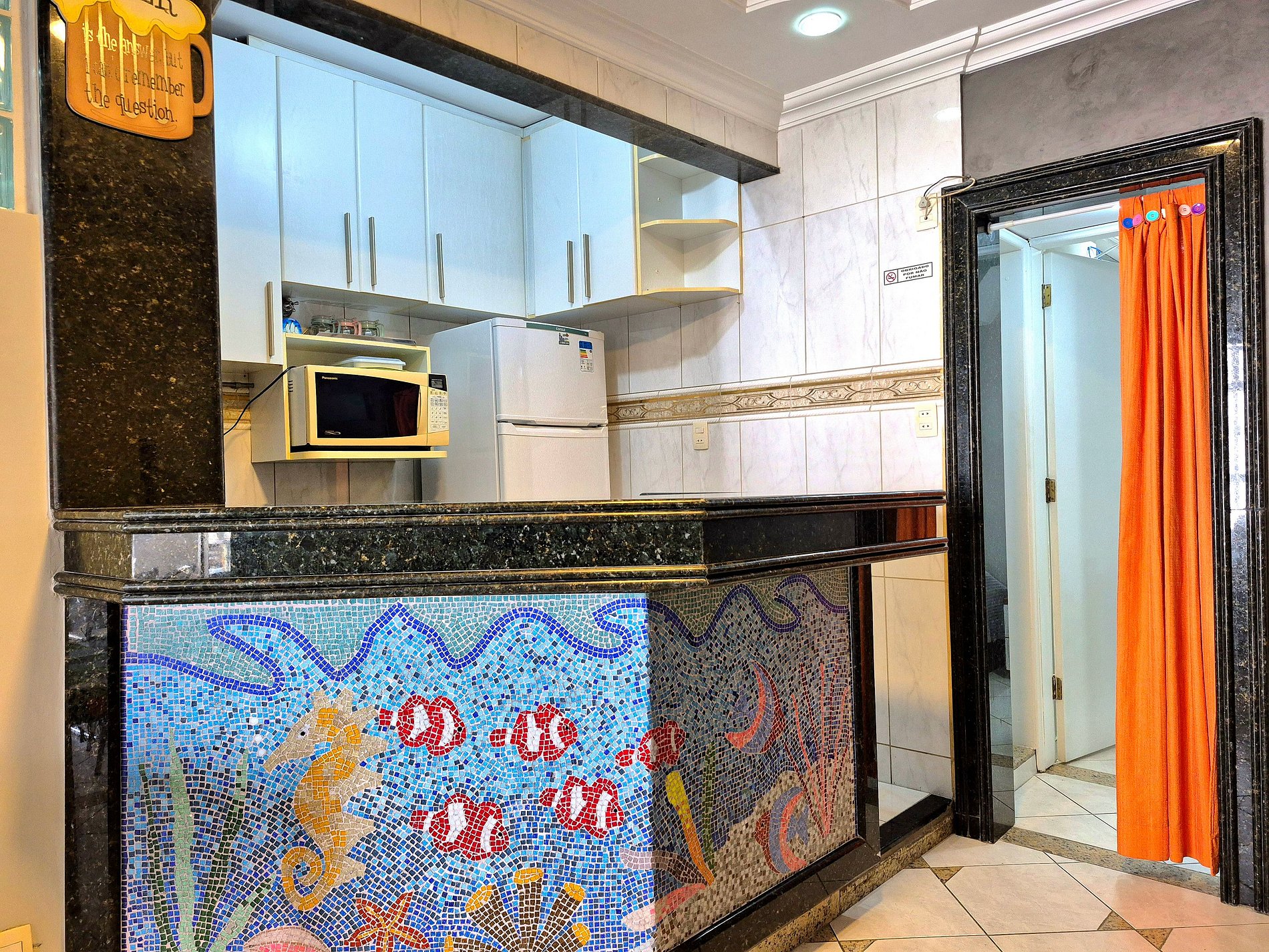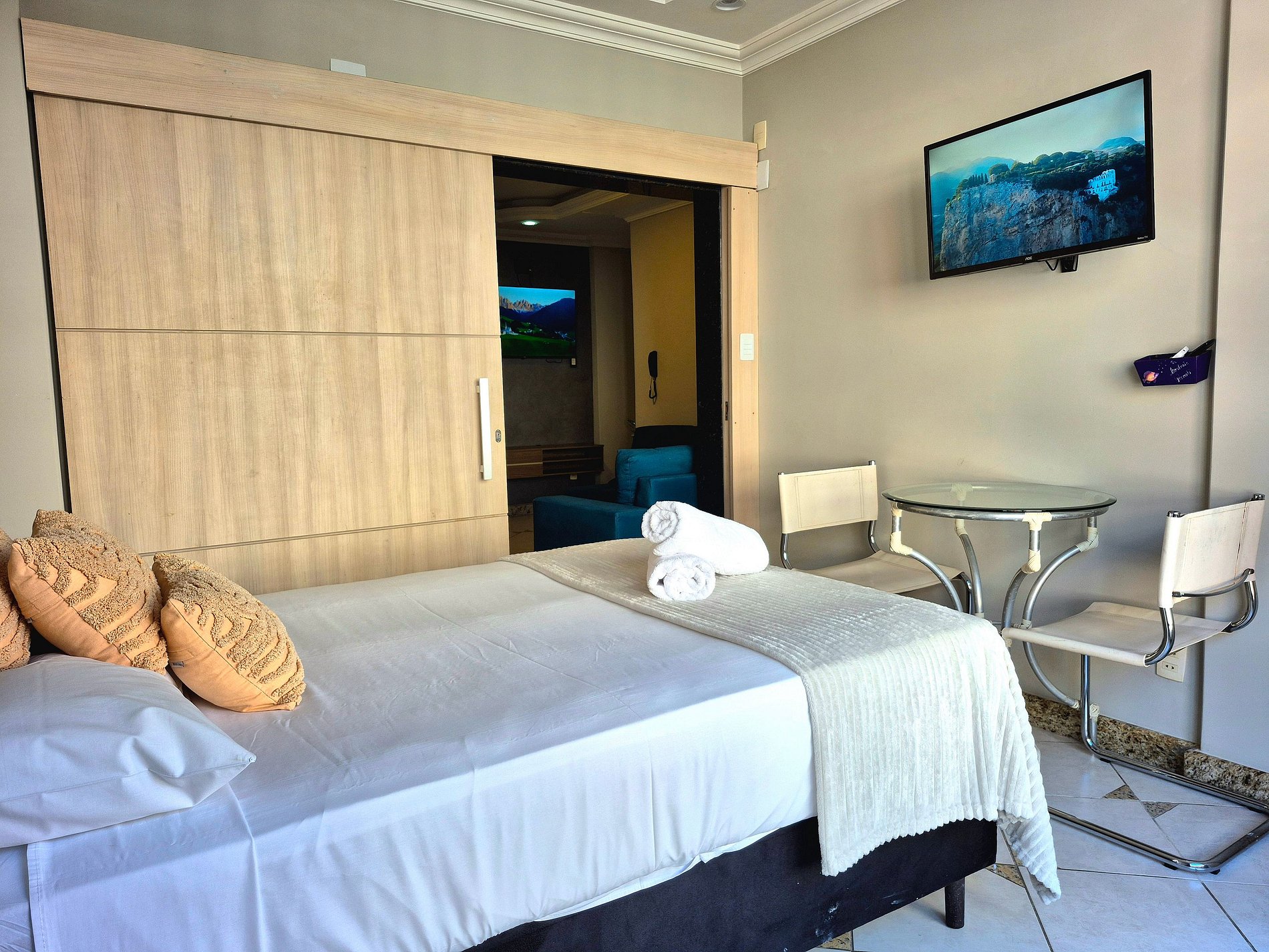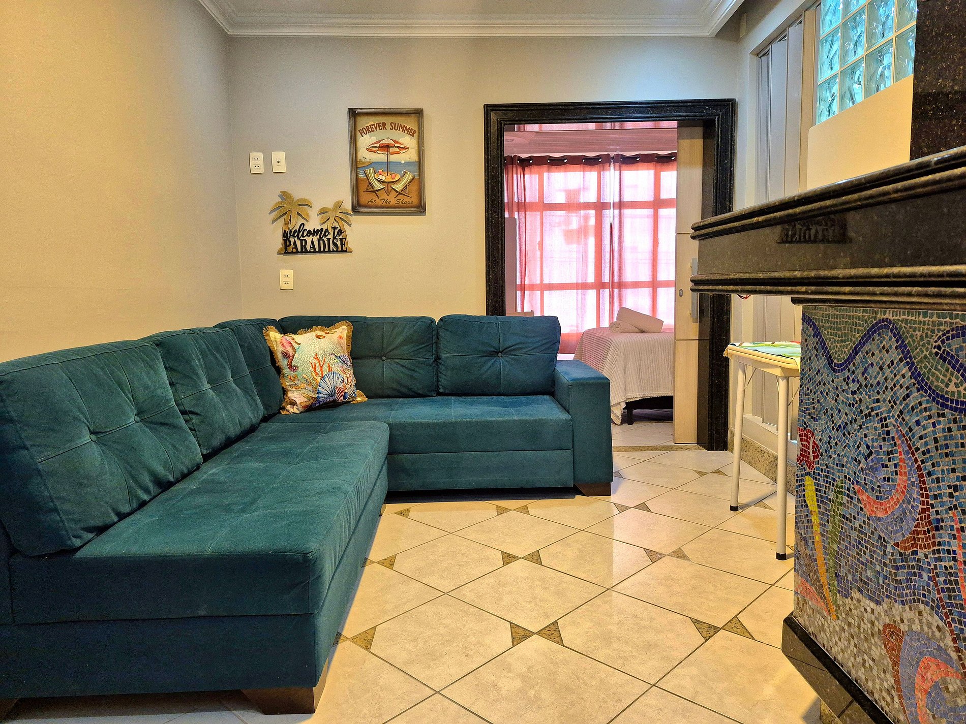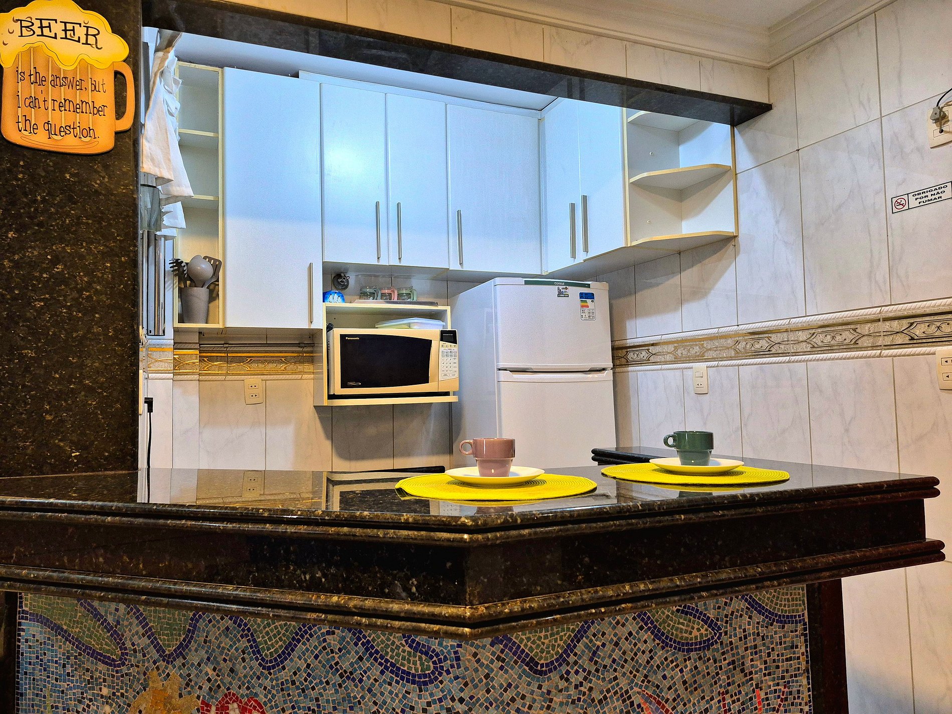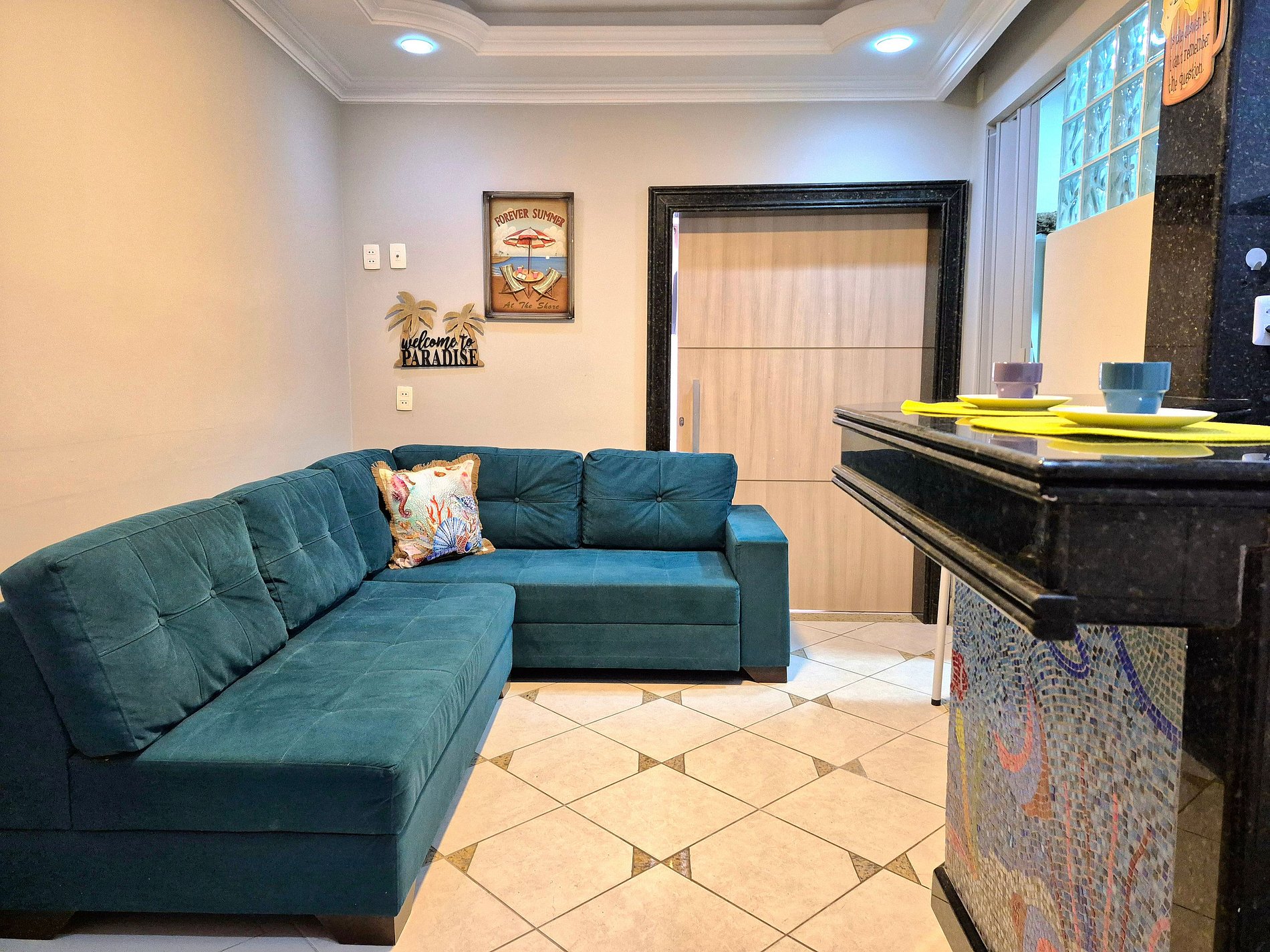 Nossa sala é aconchegante e nosso sofá acomoda muito bem para descansar ou assistir um filme! A cozinha é compacta e completa com utensílios para que você possa cozinhar se assim preferir.