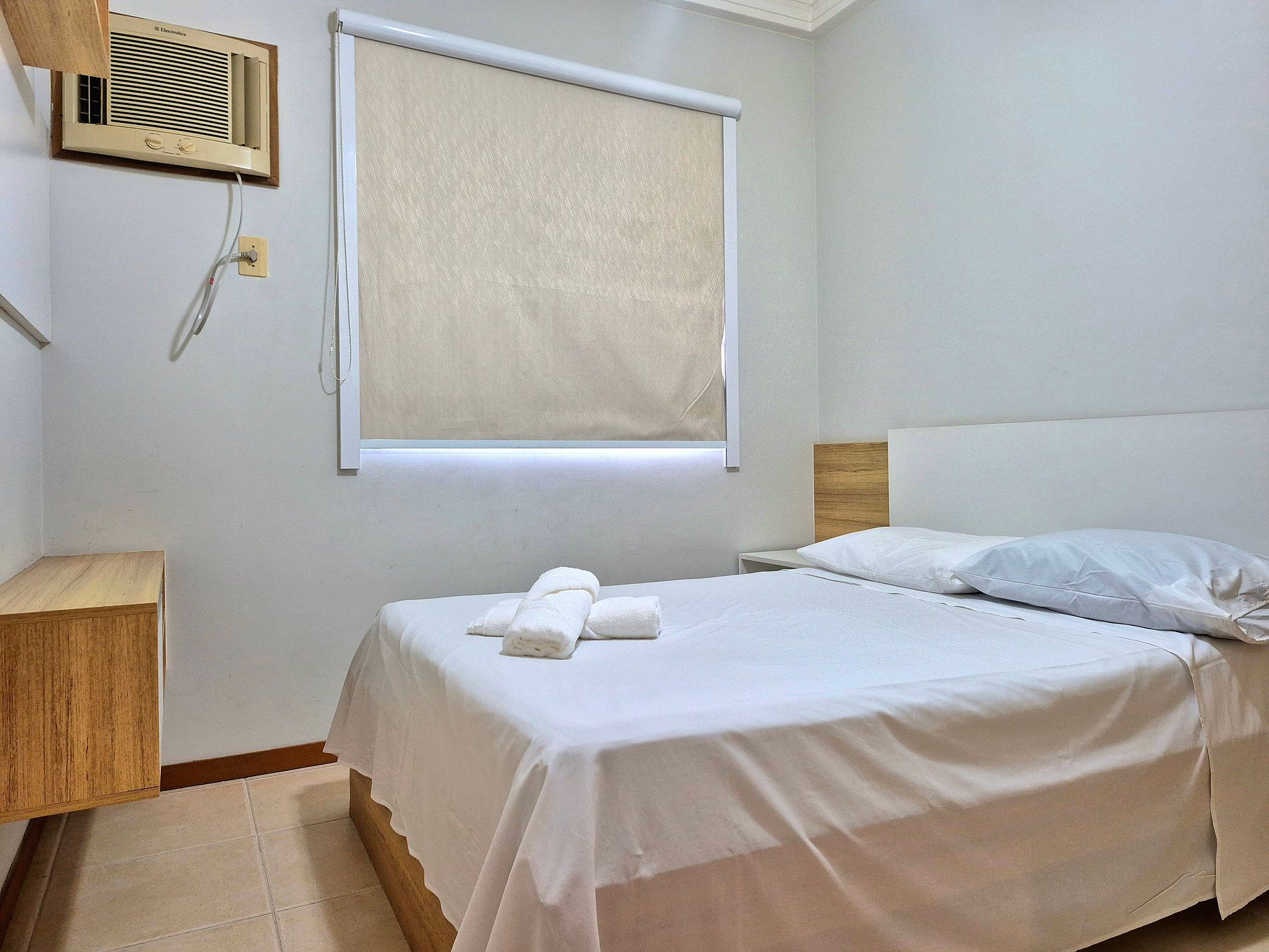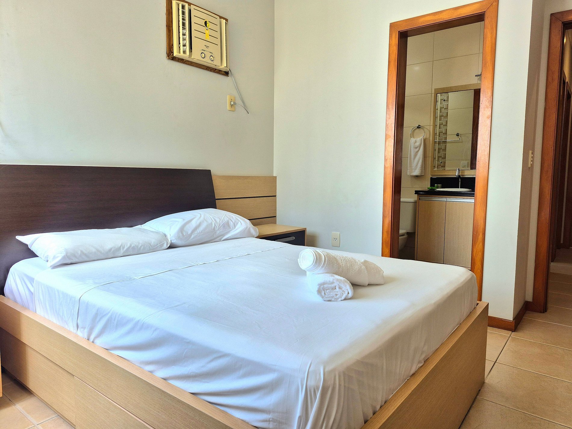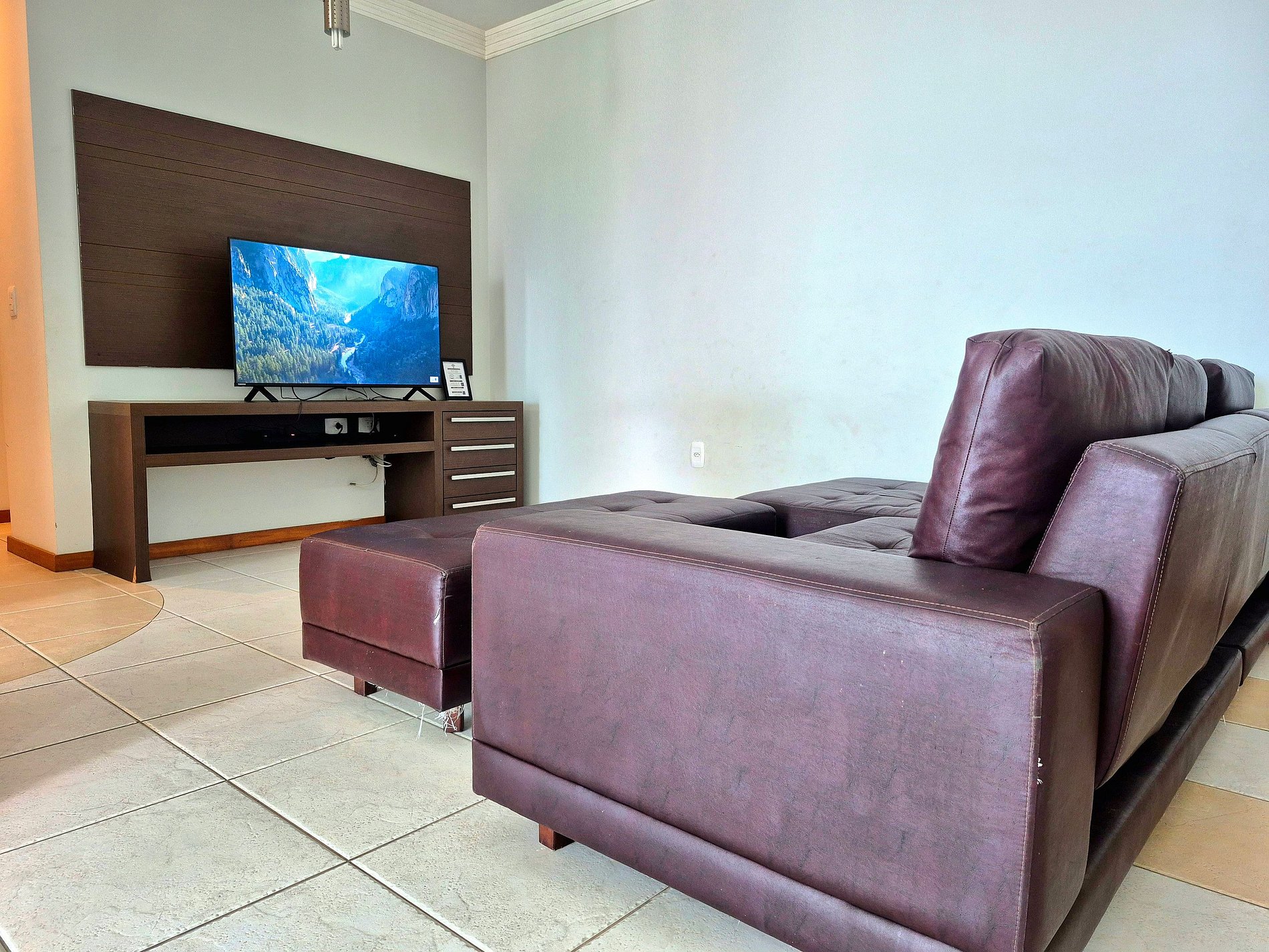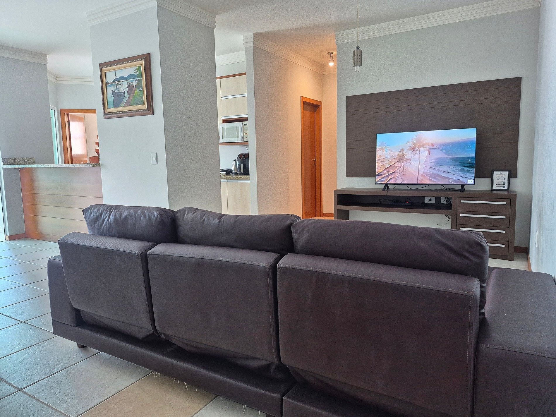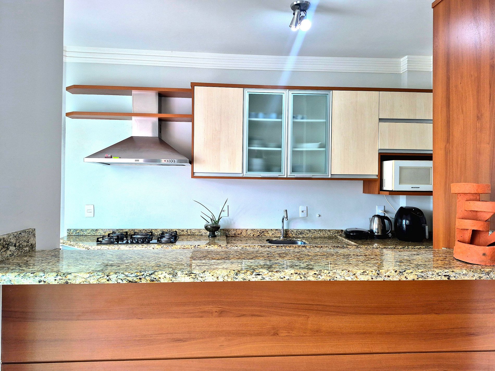 Apartamento completo, 2 quartos + 1 suíte com camas de casal e ar condicionado. Cozinha completa com utensílios e eletrodomésticos. Sala de jantar espaçosa, sala de estar com Smart TV e sacada ampla com churrasqueira a carvão.