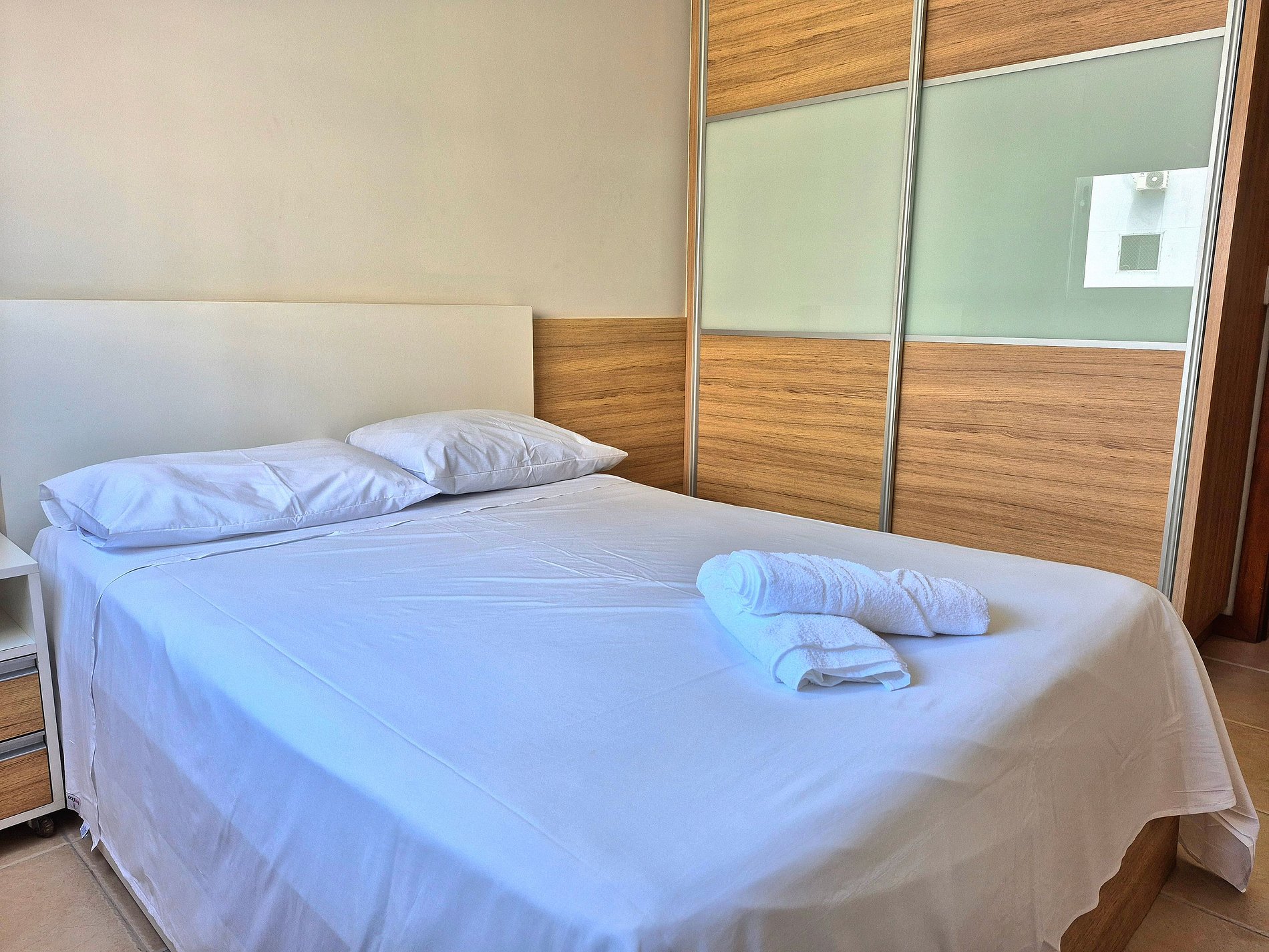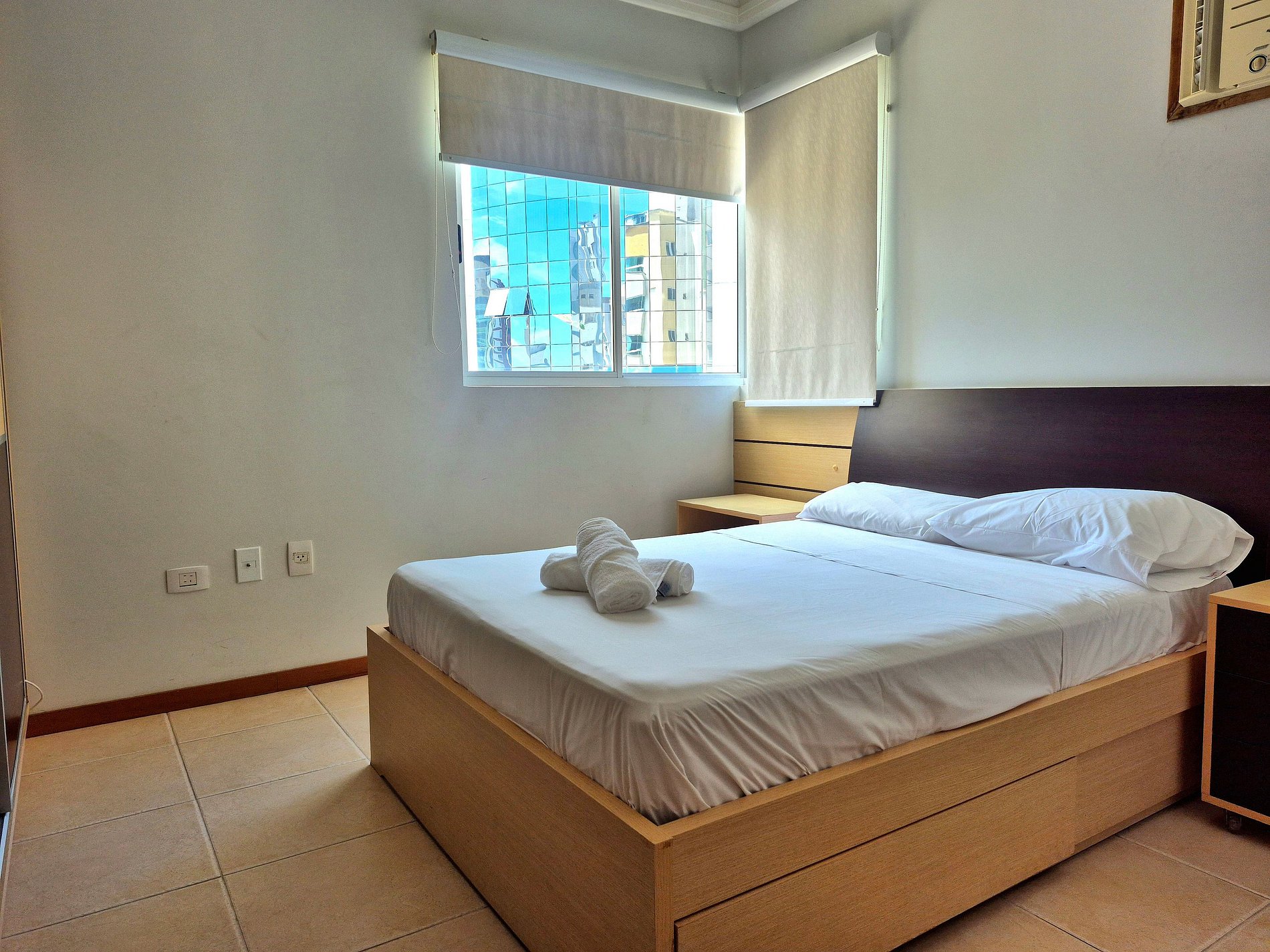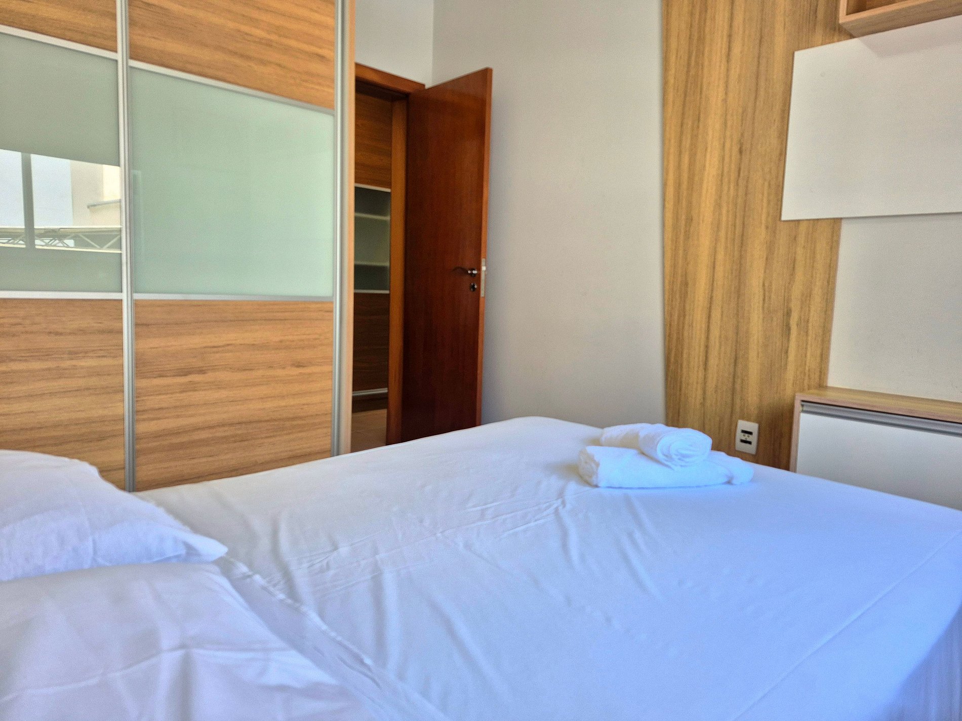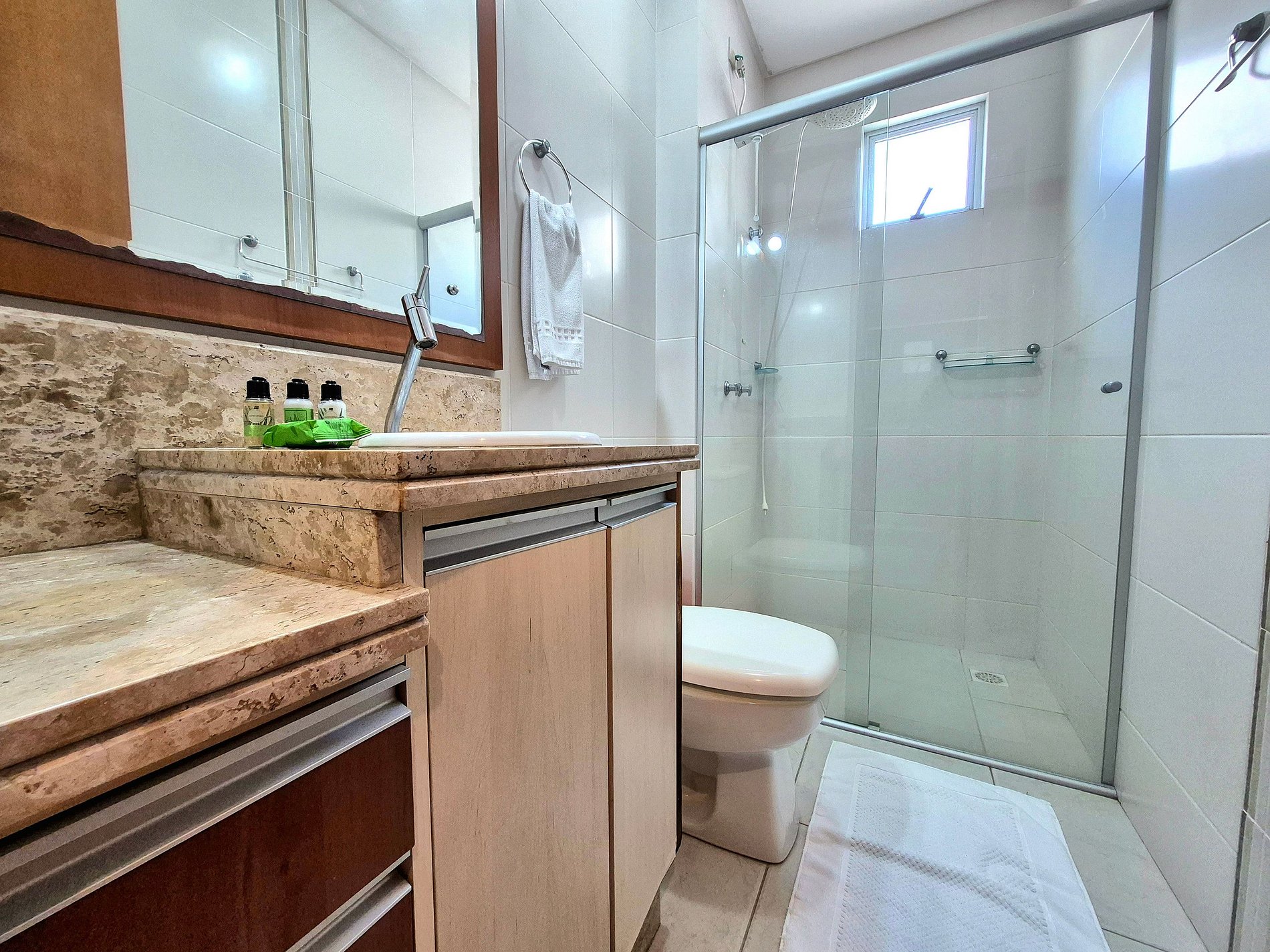 Apartamento completo, 2 quartos + 1 suíte com camas de casal e ar condicionado. Cozinha completa com utensílios e eletrodomésticos. Sala de jantar espaçosa, sala de estar com Smart TV e sacada ampla com churrasqueira a carvão.
