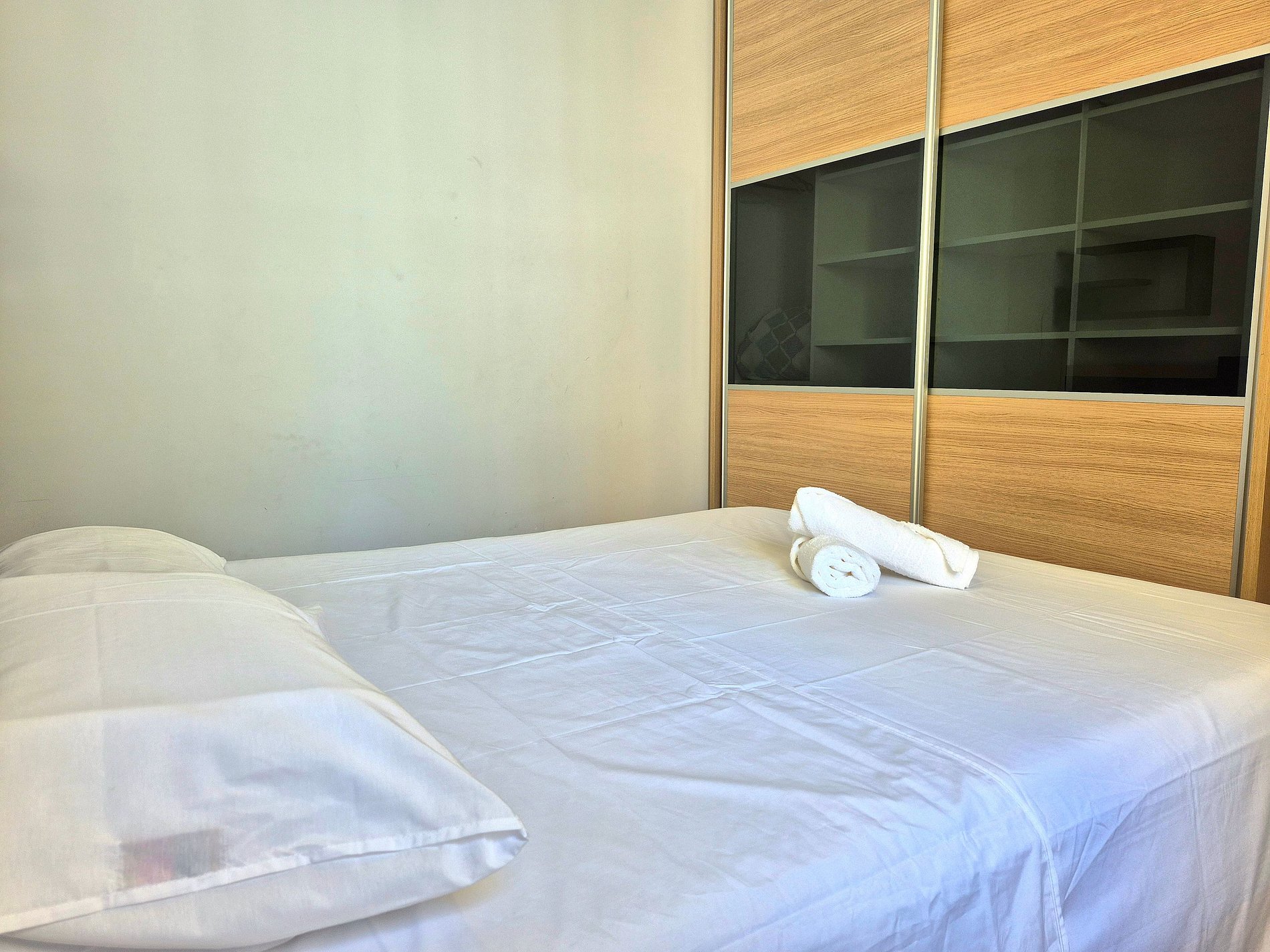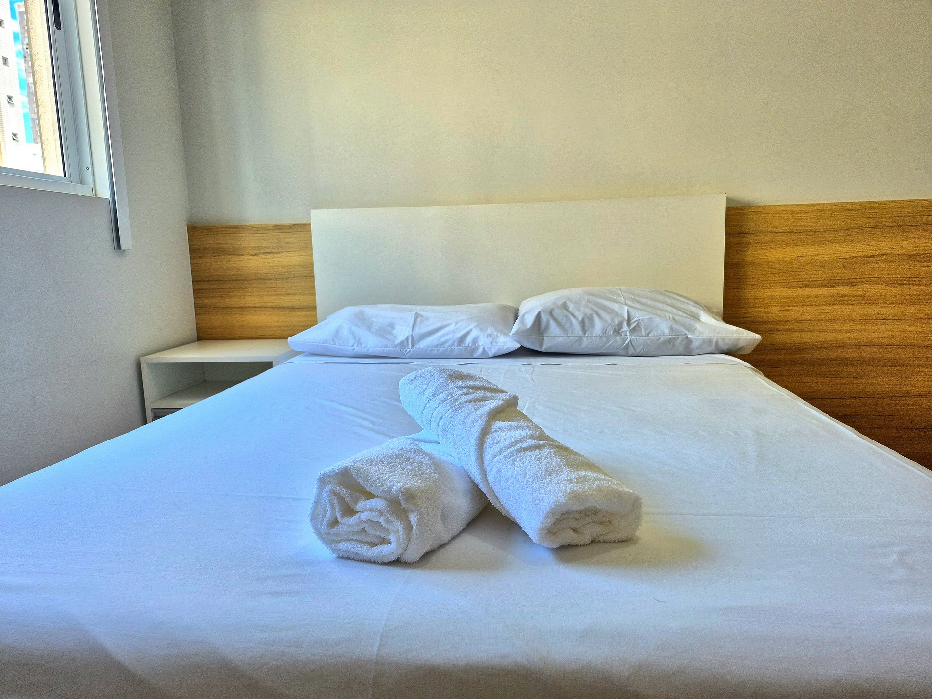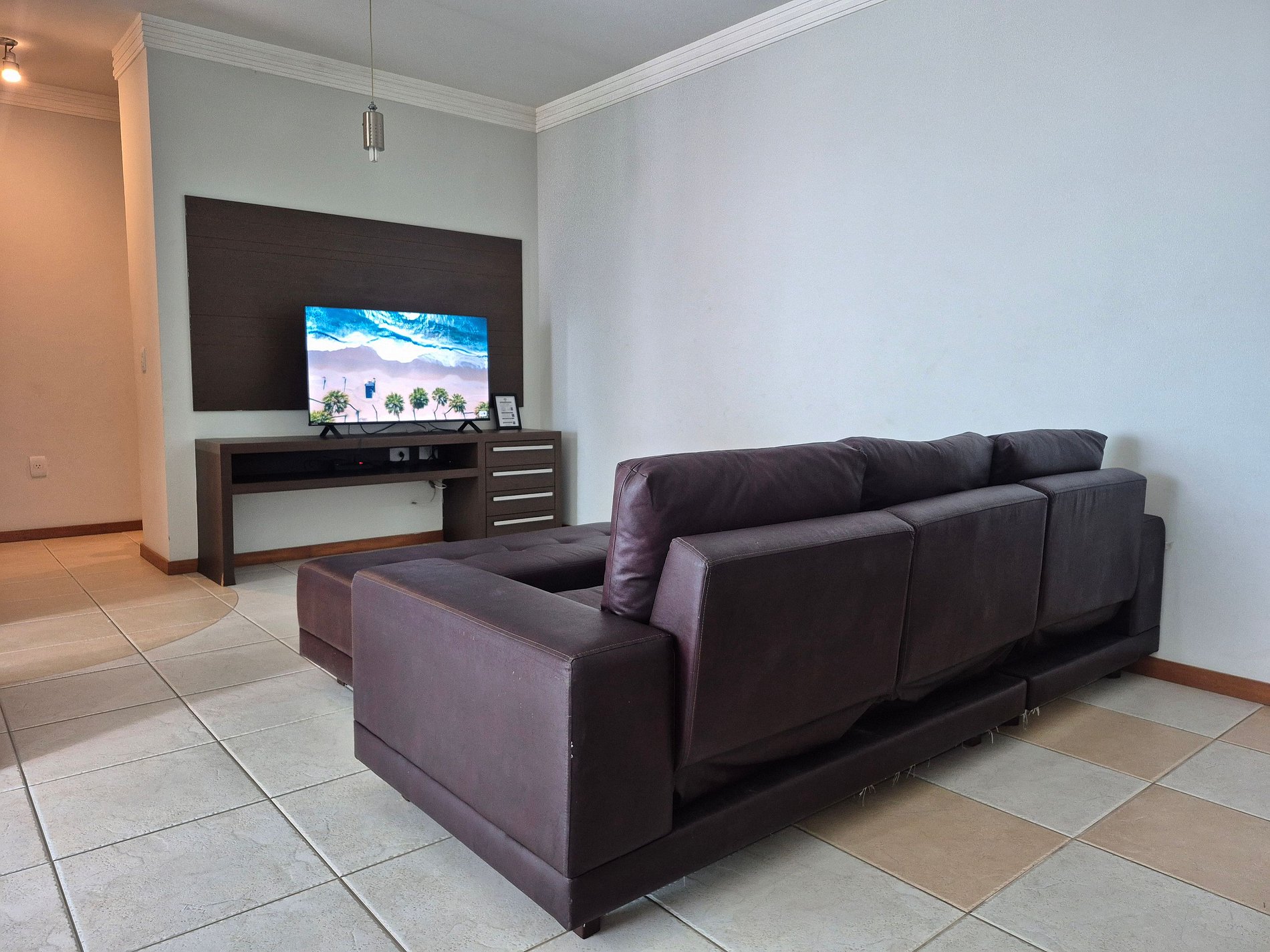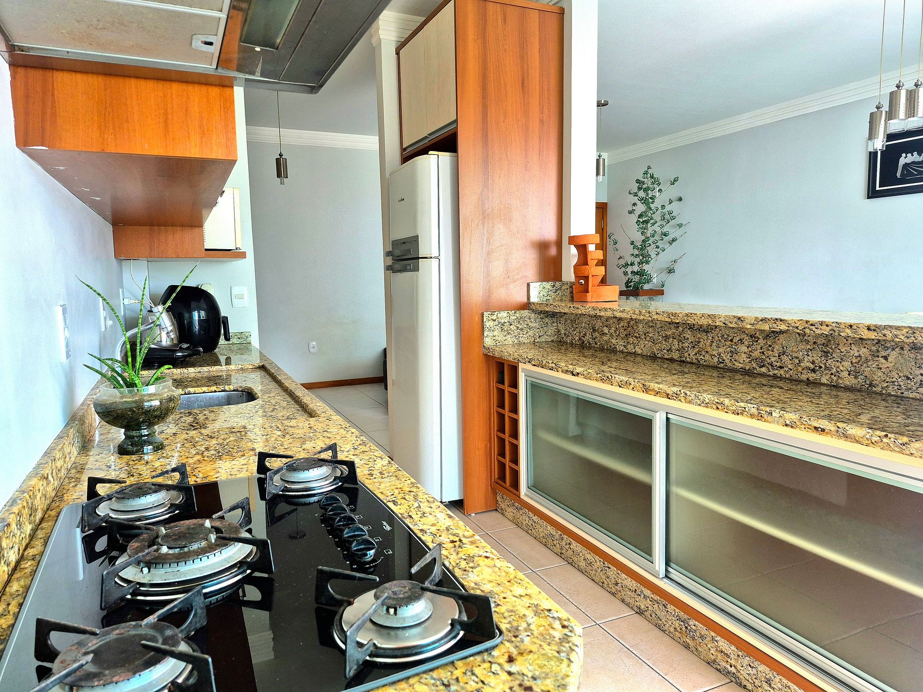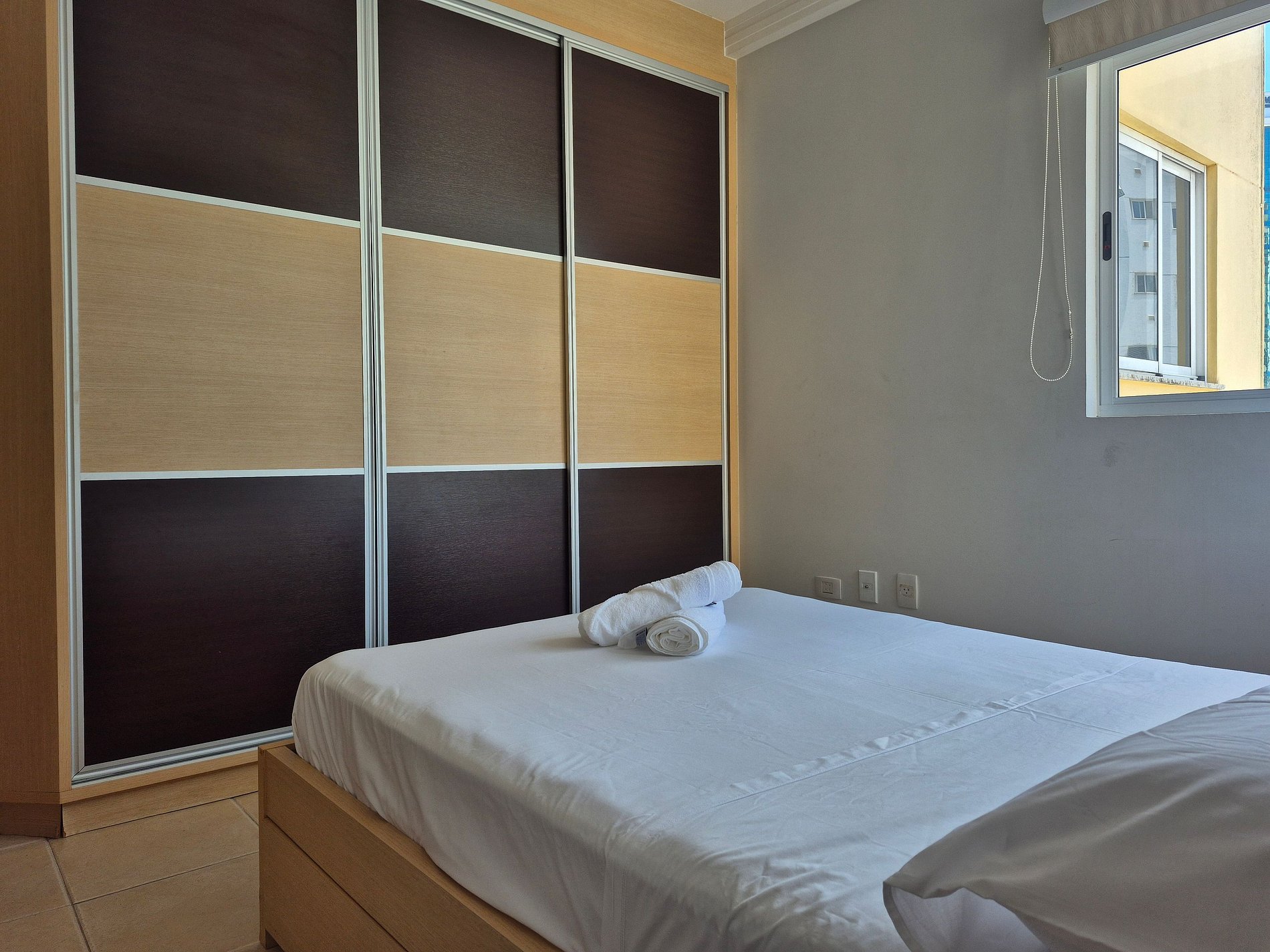 Apartamento completo, 2 quartos + 1 suíte com camas de casal e ar condicionado. Cozinha completa com utensílios e eletrodomésticos. Sala de jantar espaçosa, sala de estar com Smart TV e sacada ampla com churrasqueira a carvão.