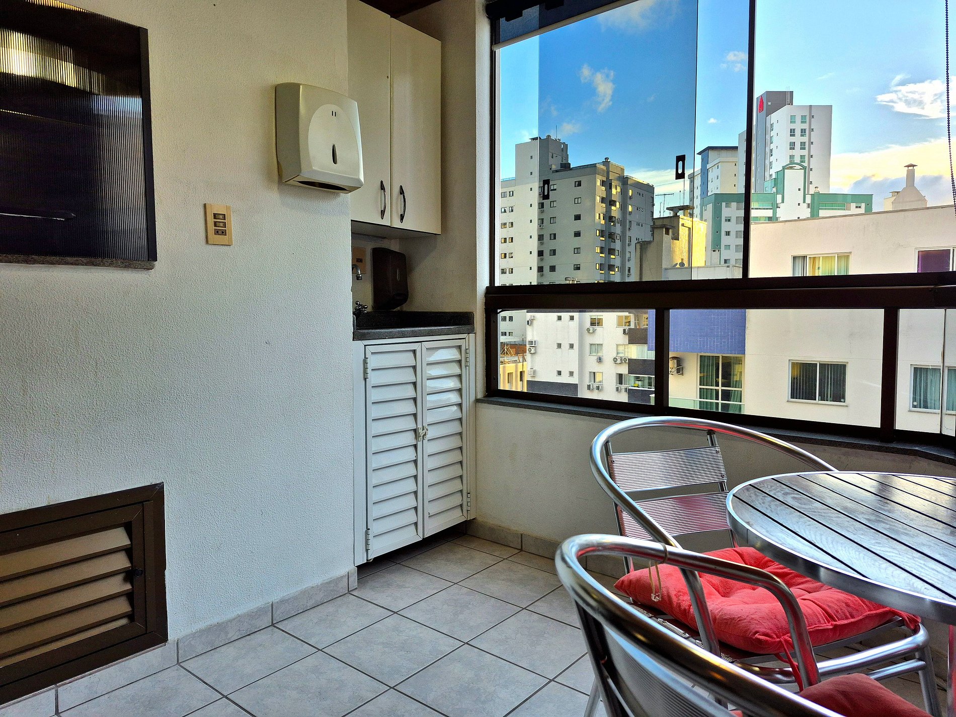O charme é nossa sacada com churrasqueira a carvão e mesa com cadeiras para momentos de confraternização.