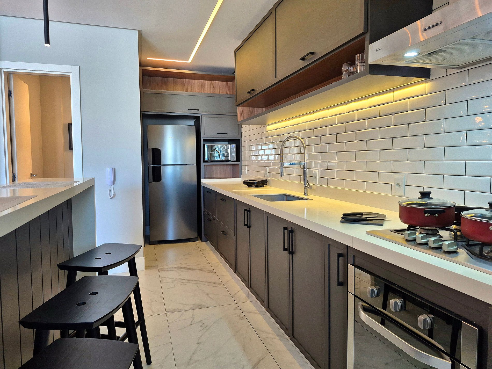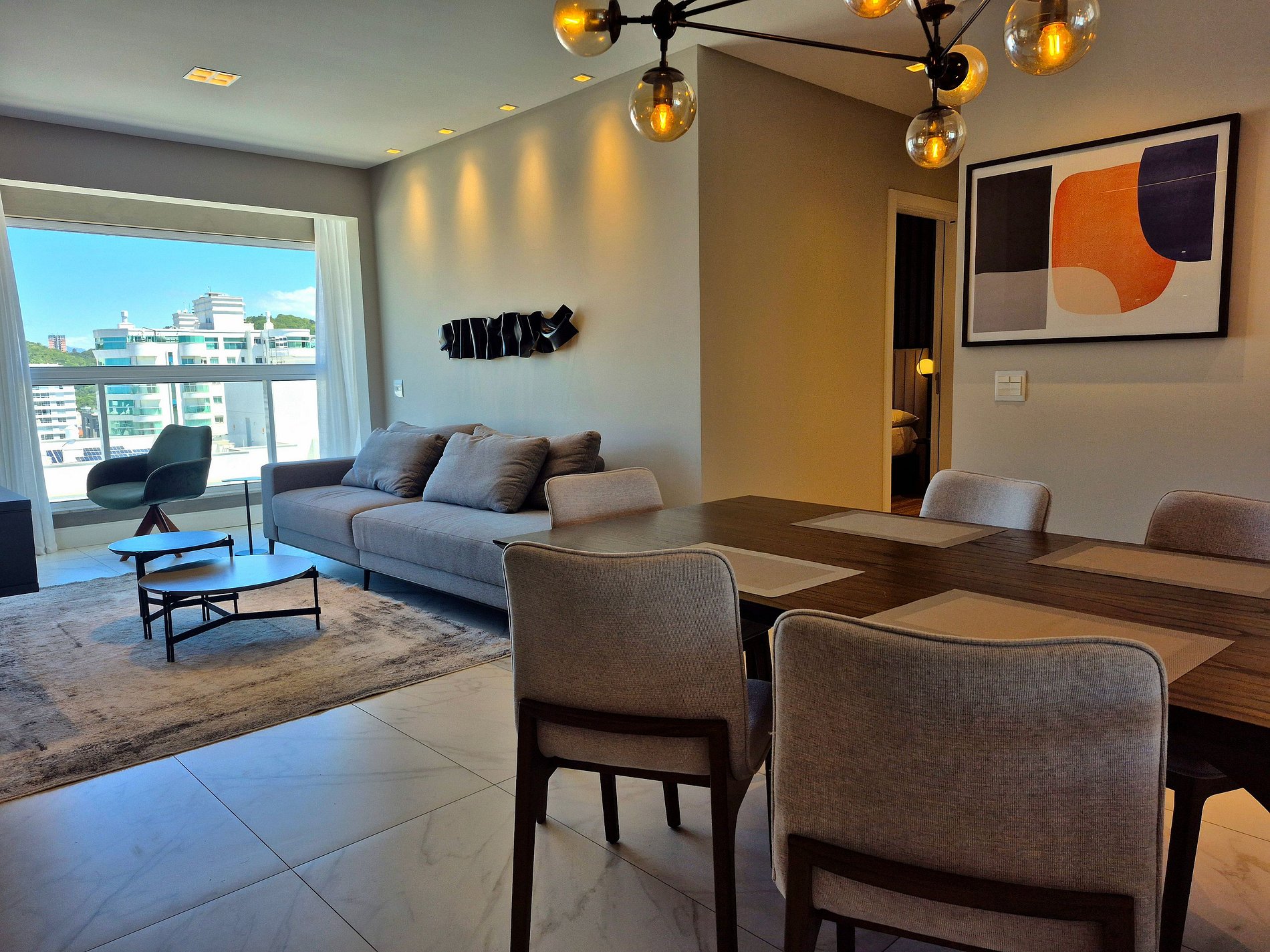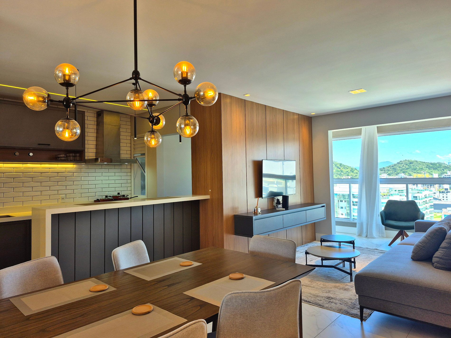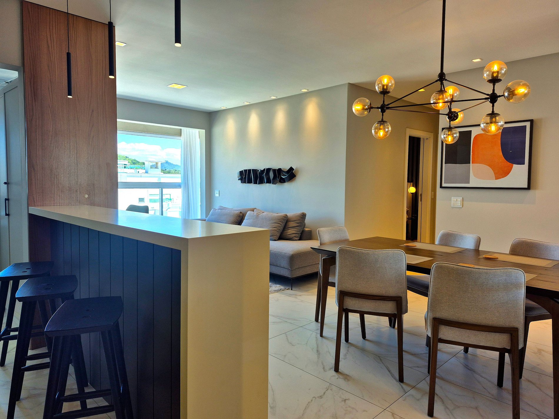 Apartamento novo, planejado e decorado. São 2 suítes de casal, um lavabo, cozinha gourmet completa. Sala de jantar e sala de estar. Em localização privilegiada na praia Brava, próximo aos principais restaurantes da região com vista para o mar, a poucos metros da areia da praia Brava!