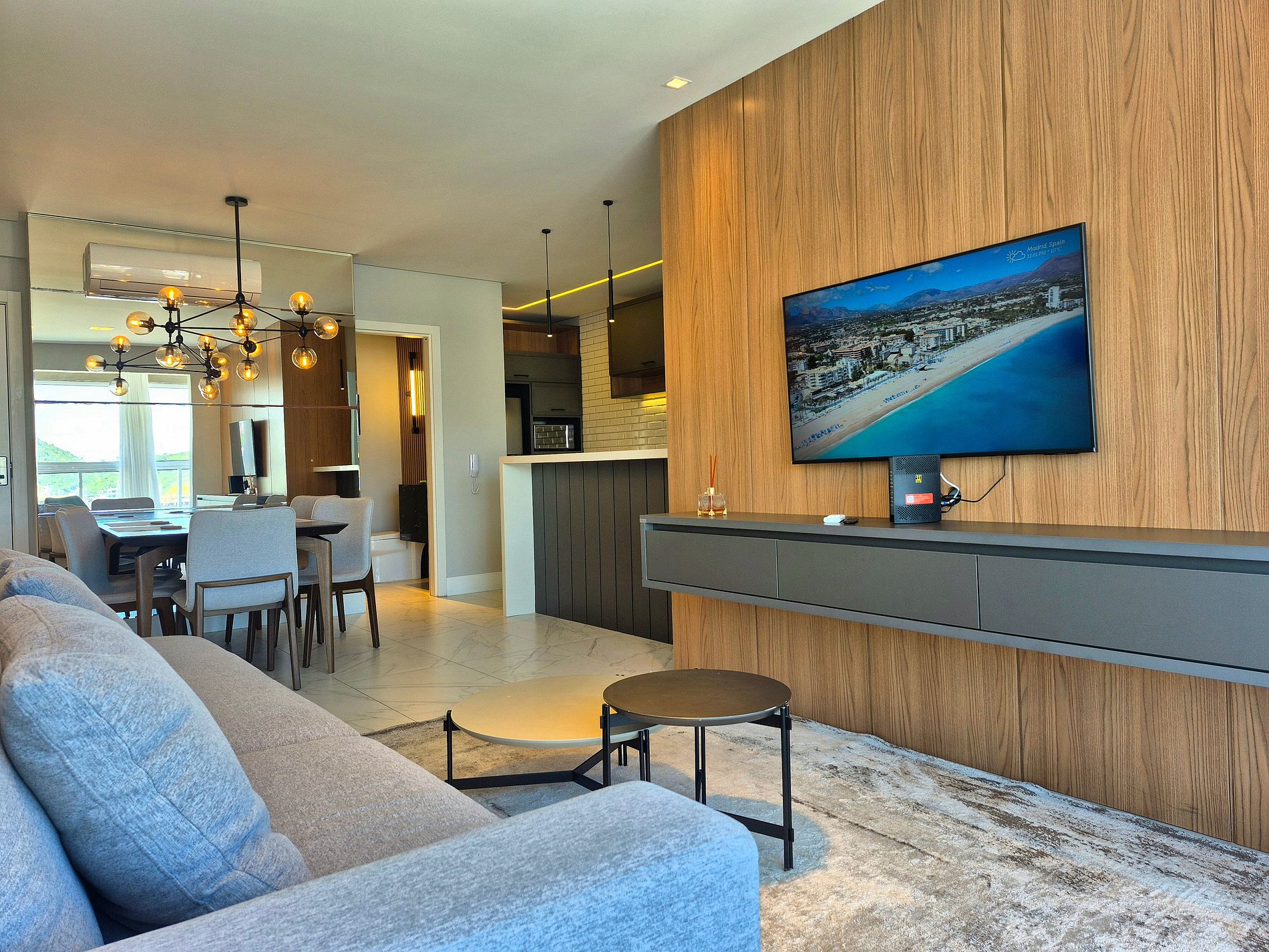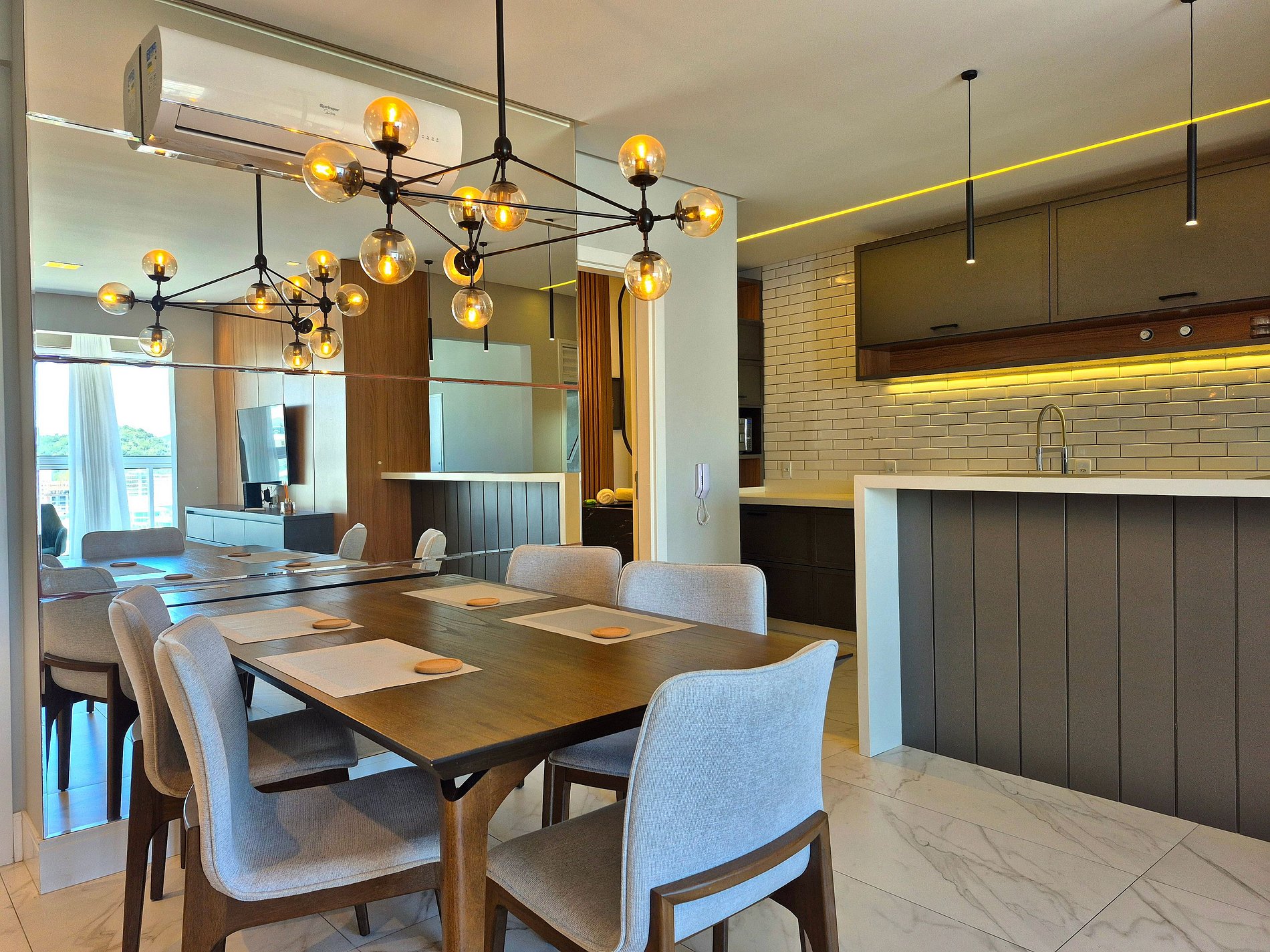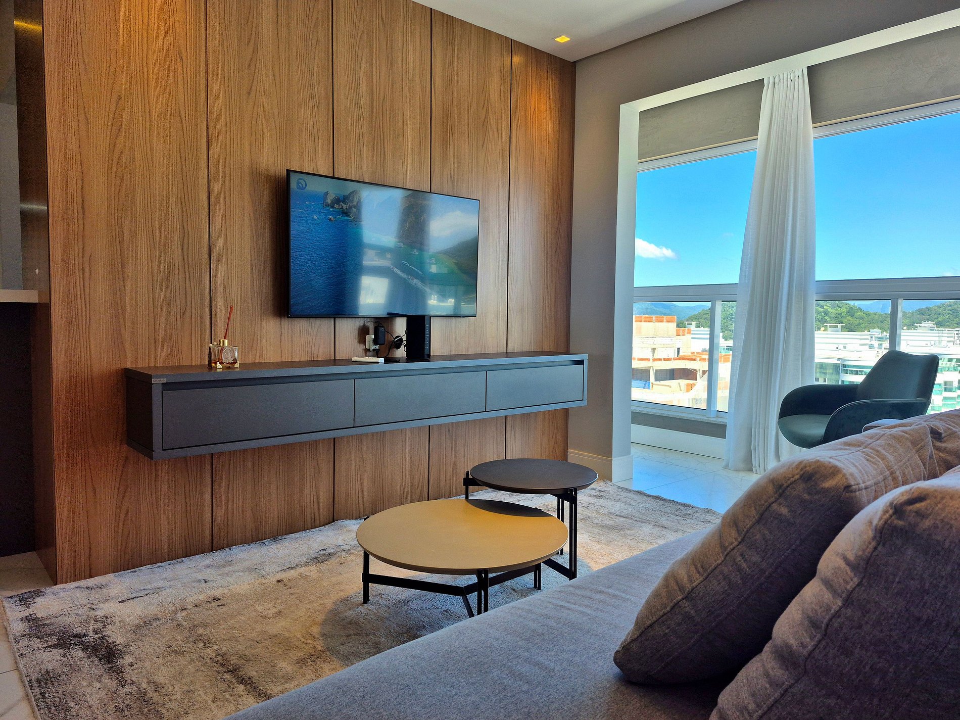 Apartamento novo, planejado e decorado. São 2 suítes de casal, um lavabo, cozinha gourmet completa. Sala de jantar e sala de estar. Em localização privilegiada na praia Brava, próximo aos principais restaurantes da região com vista para o mar, a poucos metros da areia da praia Brava!