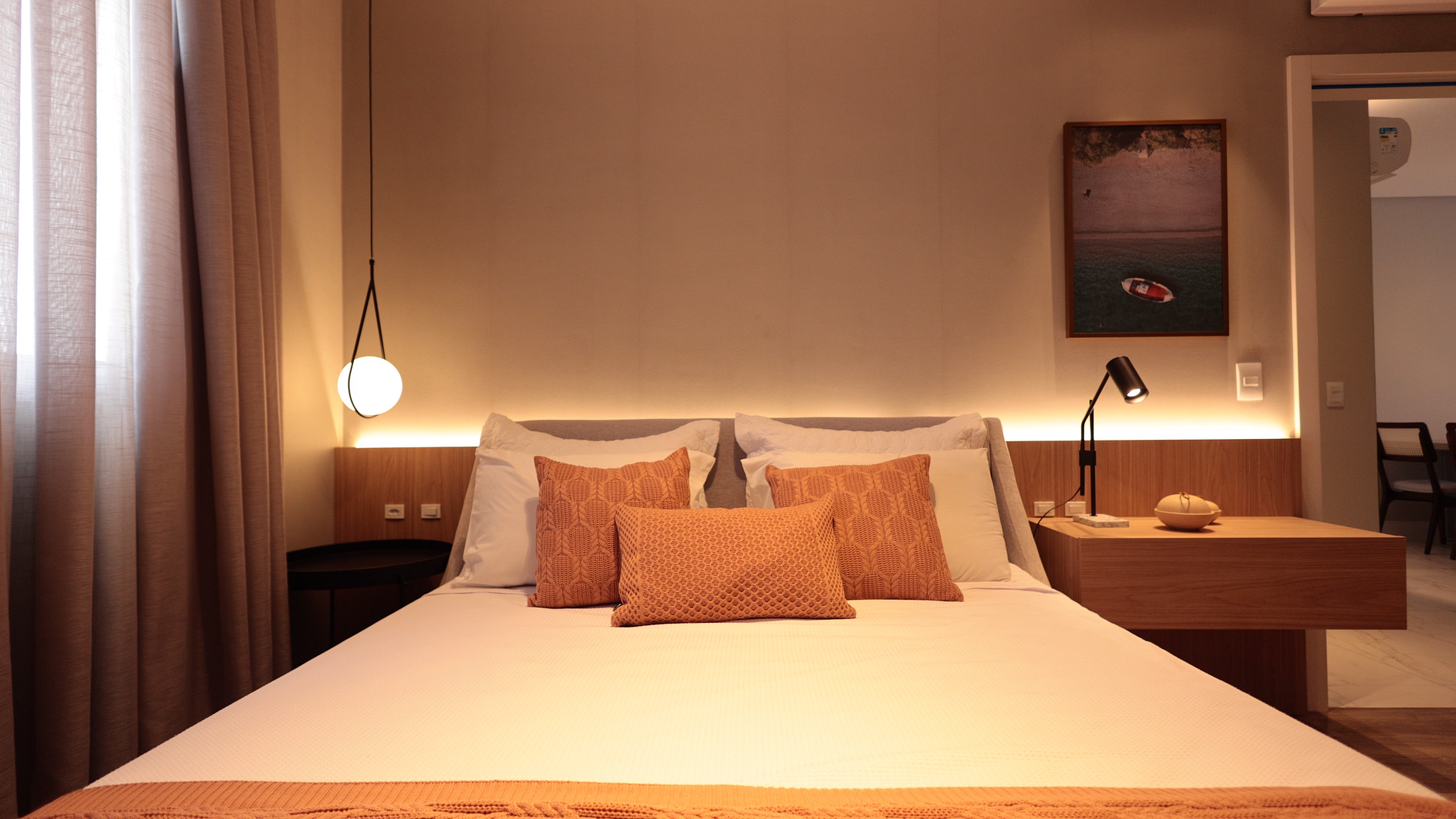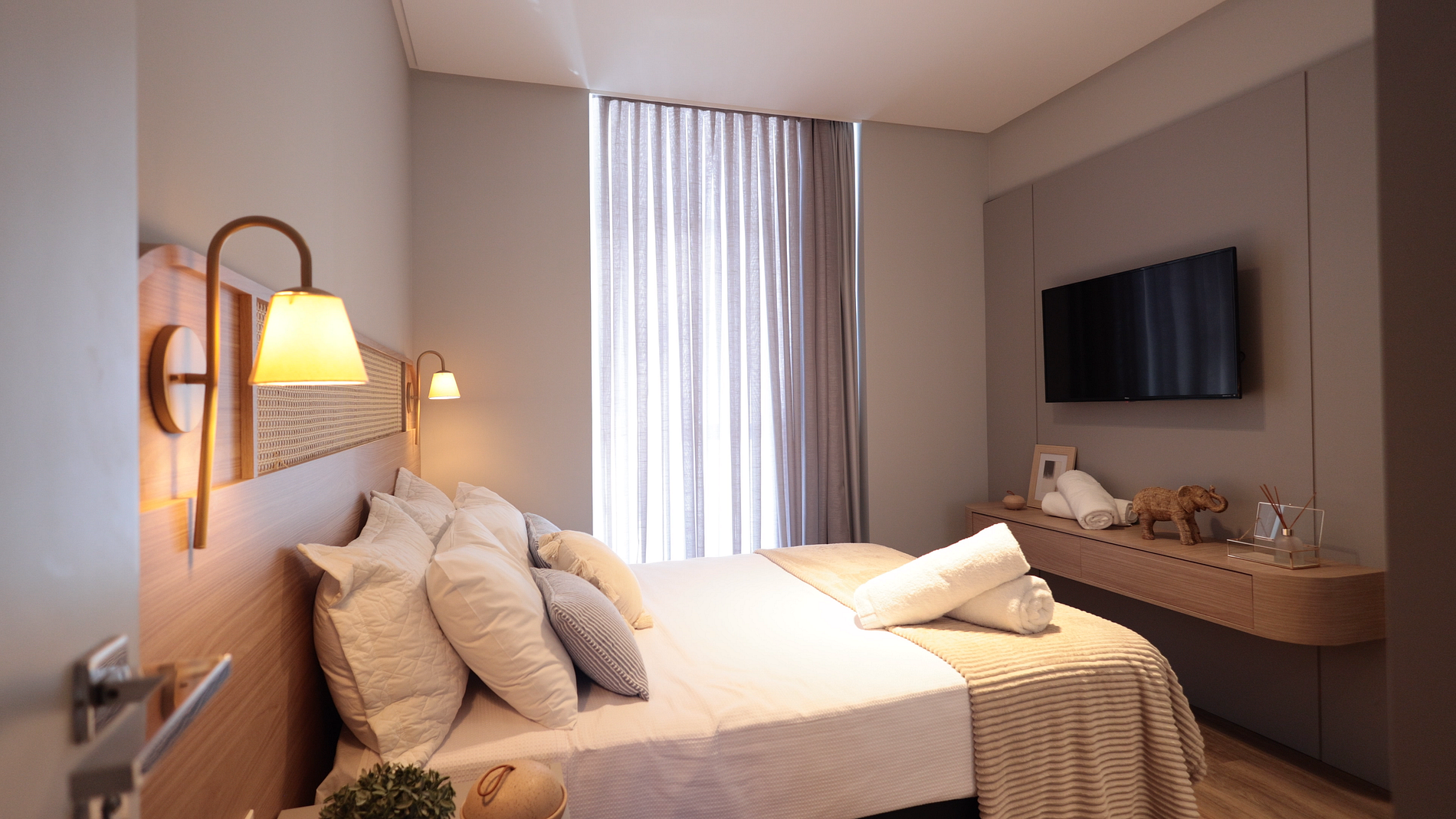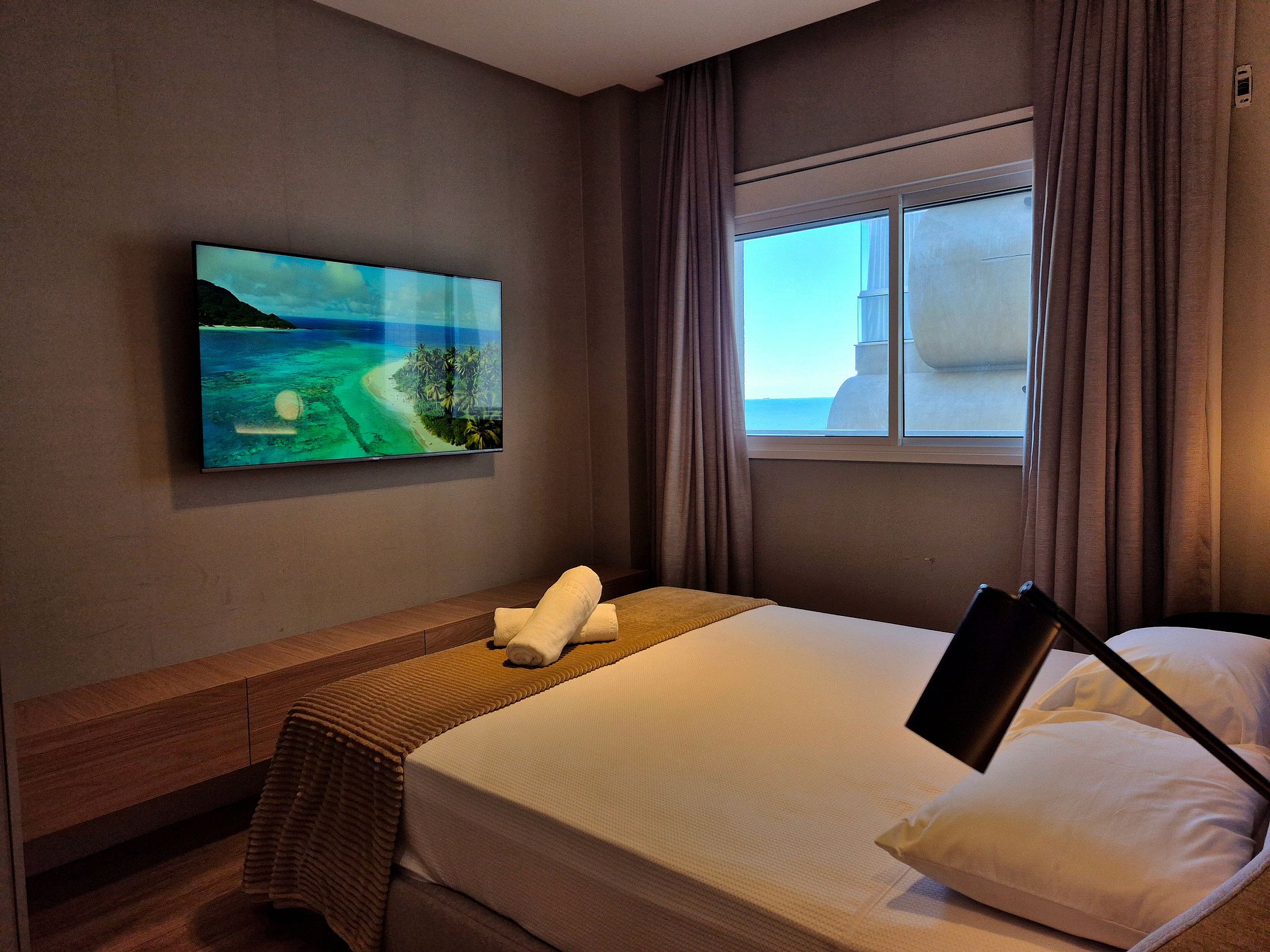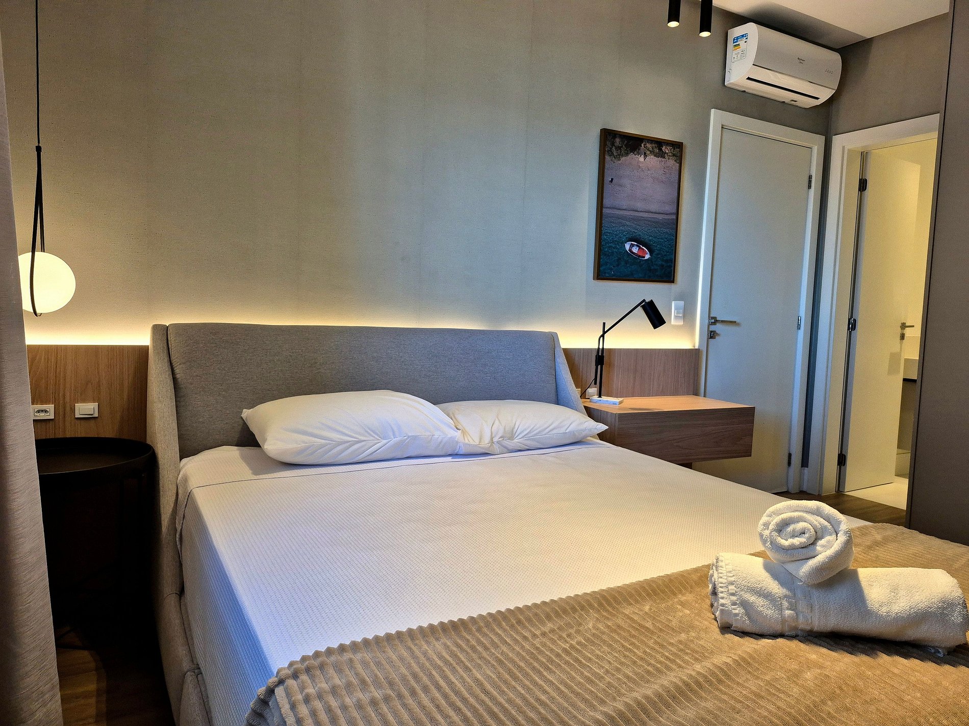 Desfrute da Praia Brava em um apartamento sofisticado, a poucos metros do mar, em condomínio de alto padrão. São 2 suítes confortáveis, ambas com cama de casal, armário, ar-condicionado e Smart TV, garantindo privacidade e comodidade.