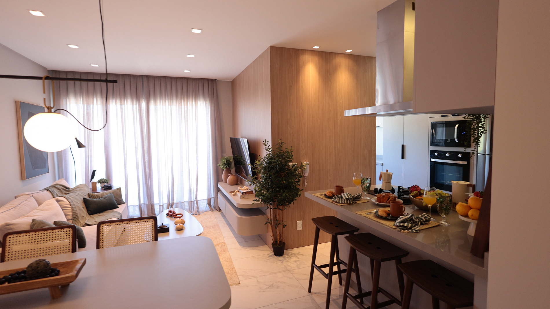 A sala é aconchegante, com sofá e Smart TV, integrada à sala de jantar em um ambiente moderno e funcional. A cozinha é completa, equipada com utensílios e eletrodomésticos para o dia a dia, além de área de serviço que traz mais praticidade à estadia.