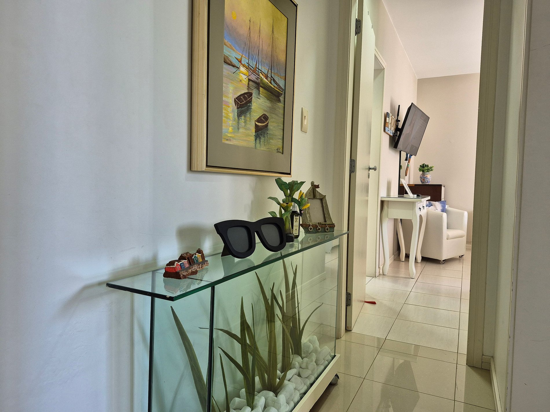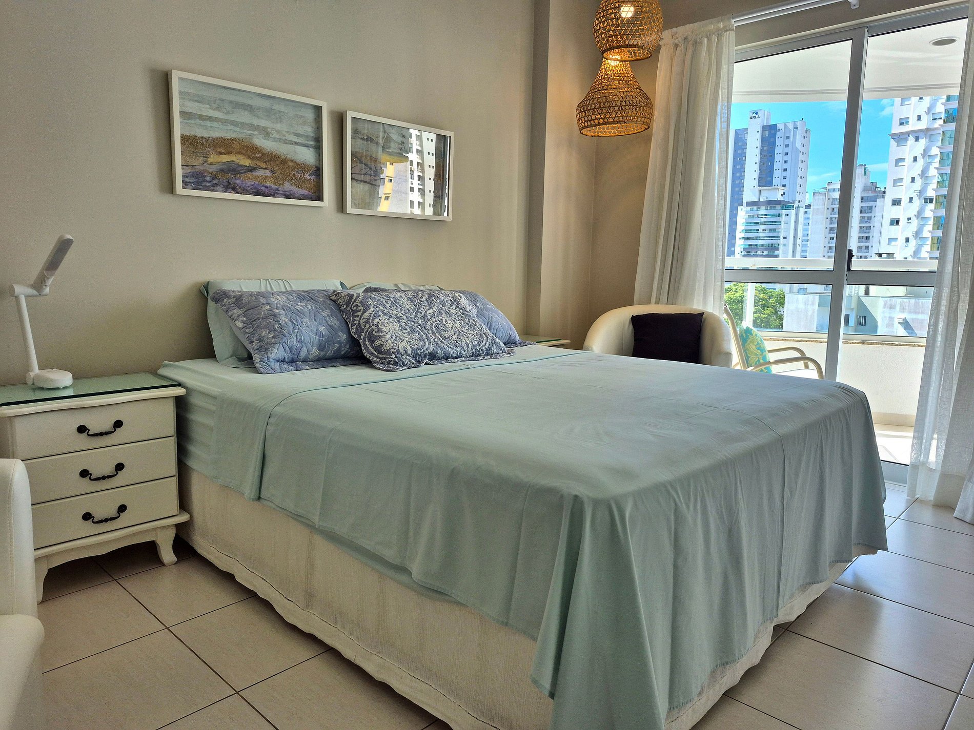 Cozinha espaçosa e completa, sala confortável com Smart TV, sacada com churrasqueira e vista arborizada no centro de BC, pertinho da Barra Norte.
