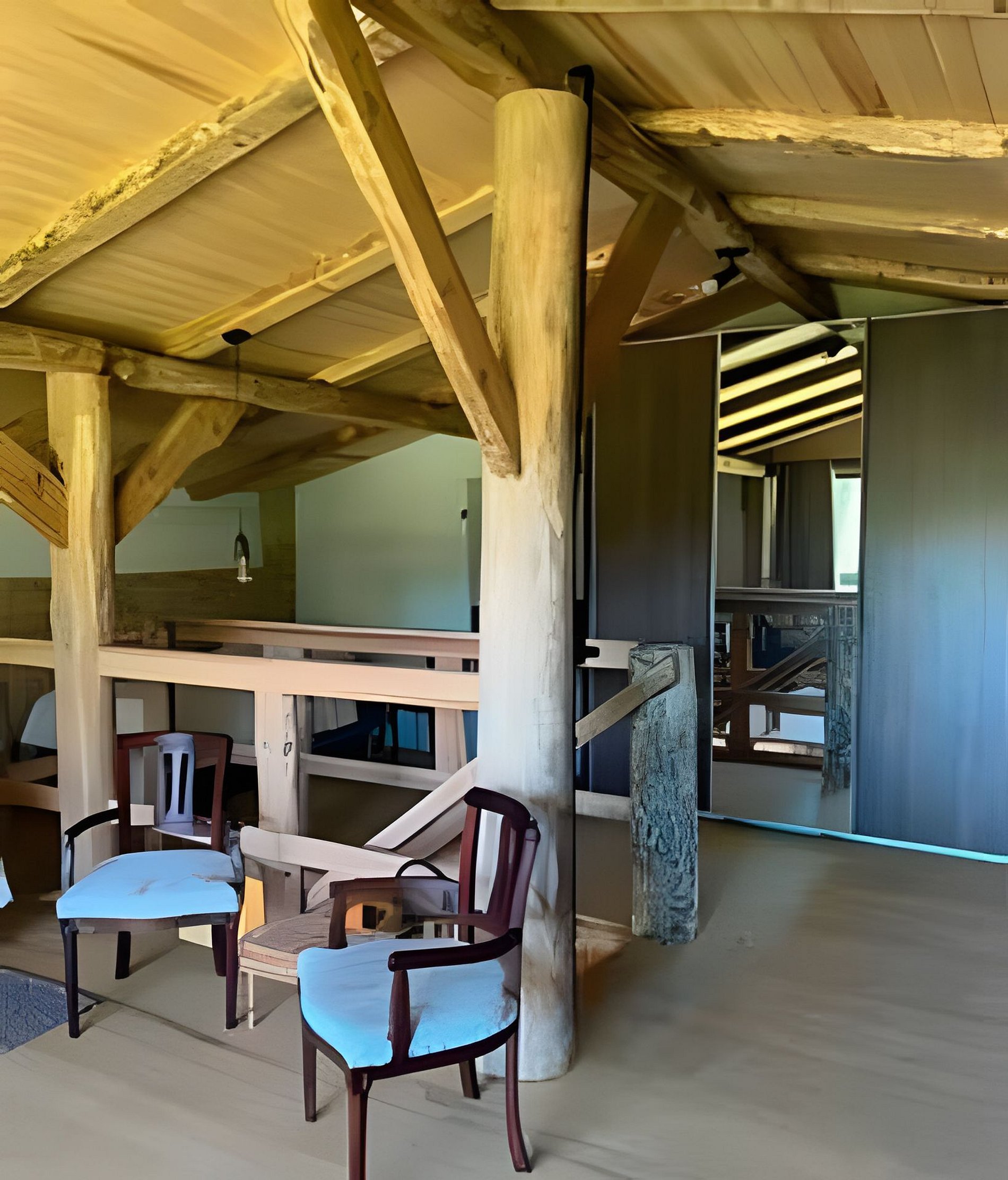 Nosso chalé tem área coberta com churrasqueira e mesas externas, a cozinha dispõe torneira elétrica, fogão a gás e à lenha; está integrada à sala com lareira. No mezanino temos 1 cama Box de casal, três camas Box de solteiro e 2 colchões se houver necessidade para acomodação.