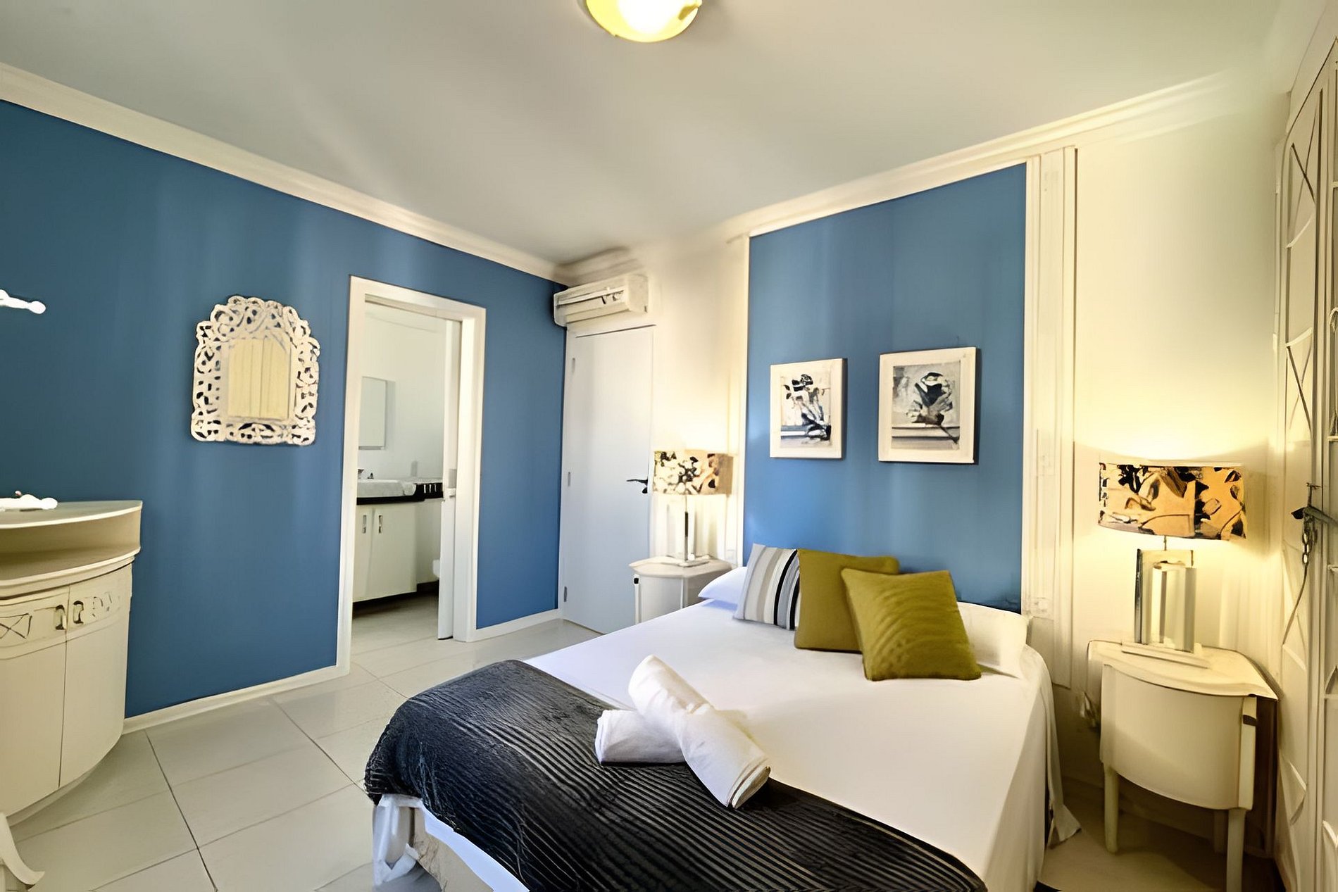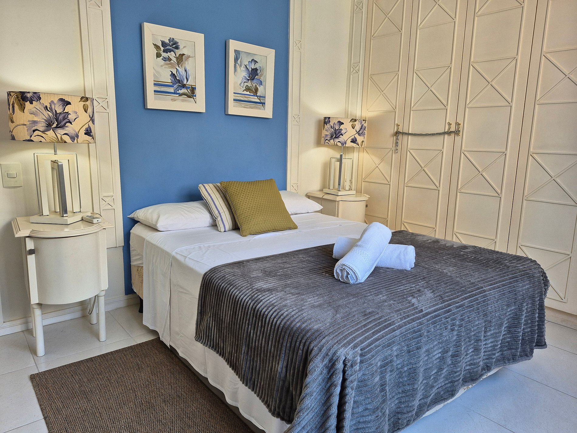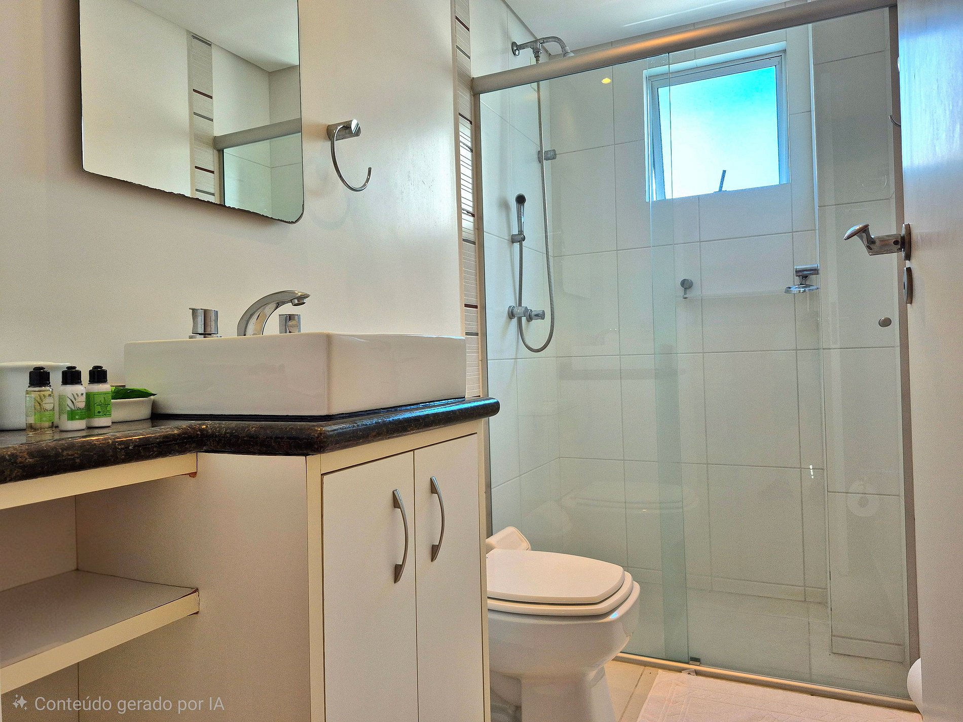 - 1 suíte com ar condicionado, guarda roupa, abajur de cabeceira, cama de casal e banheiro completo com chuveiro;