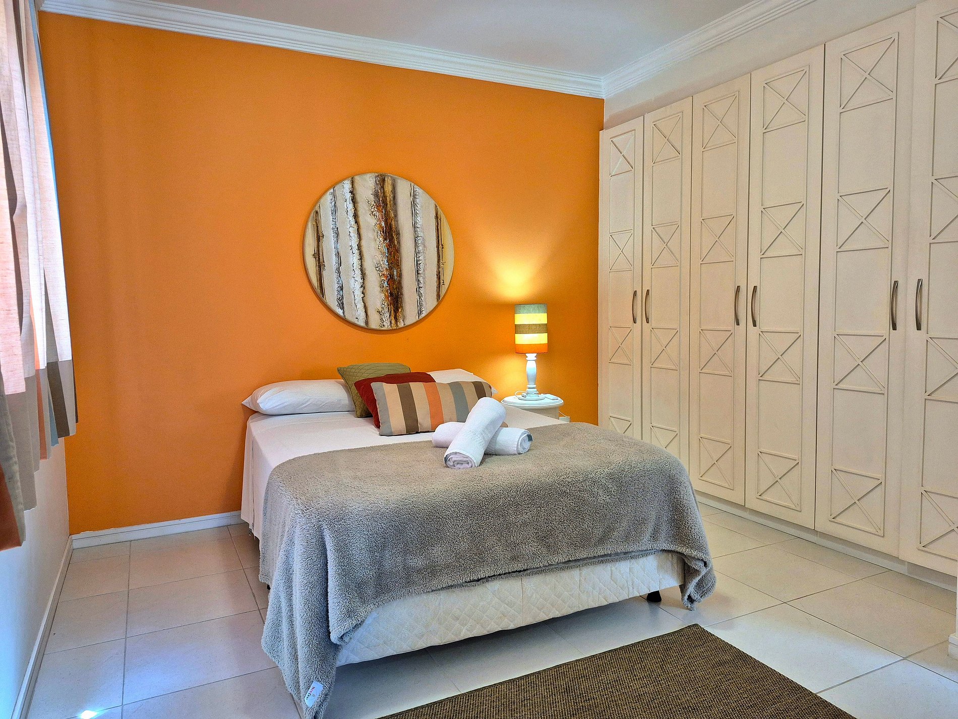 - 1 suíte com ar condicionado, guarda roupa, abajur de cabeceira, gaveteiro, cama de casal e banheiro completo com chuveiro;