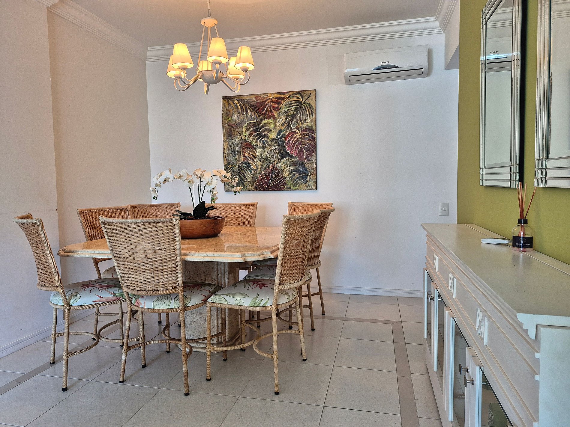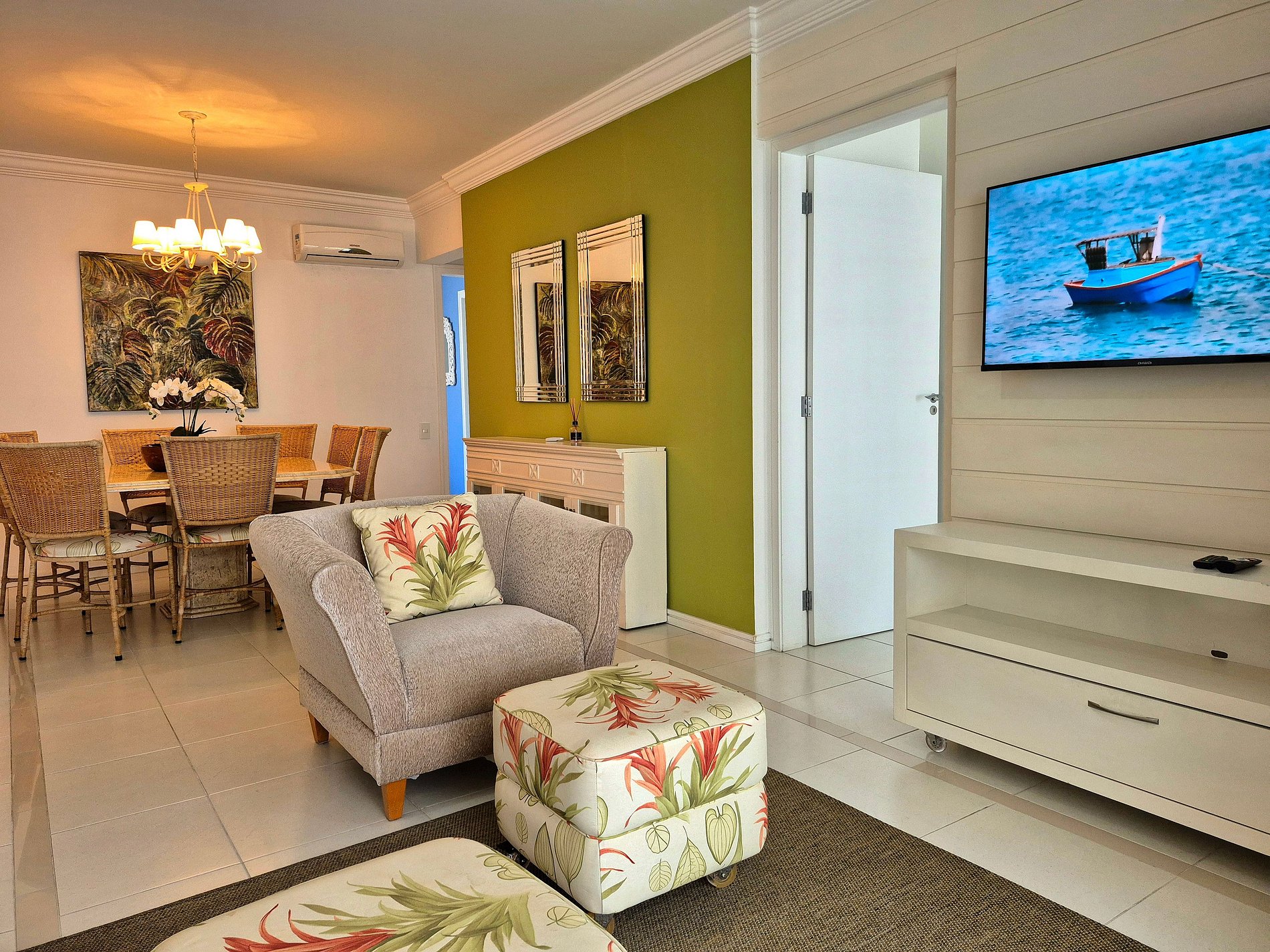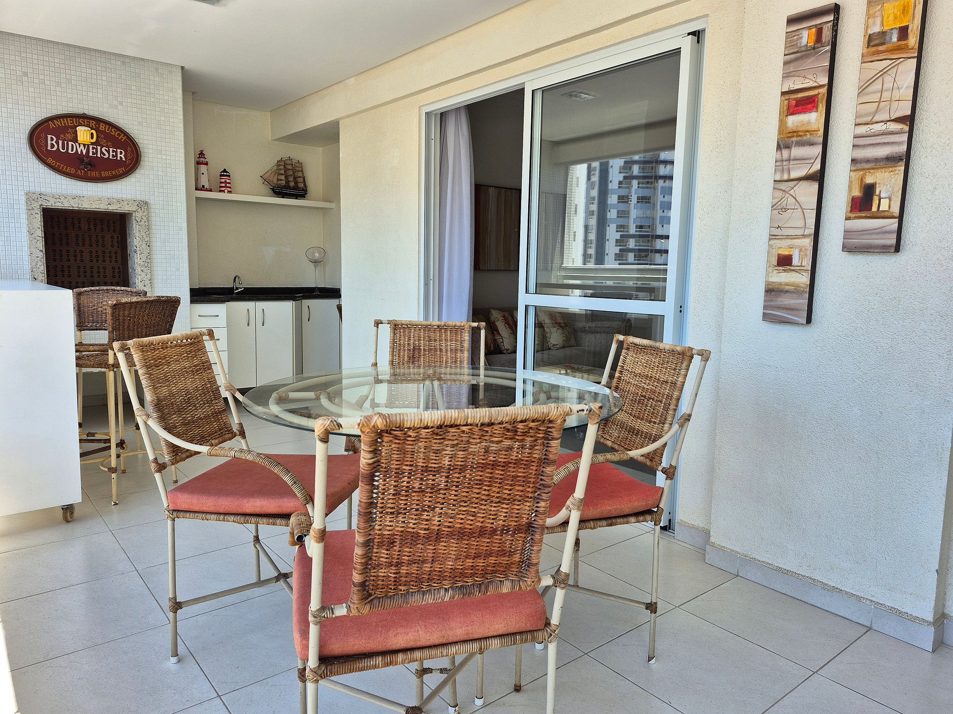 Ar condicionado nos cômodos, cozinha completa com utensílios e eletrodomésticos, 2 suítes com camas de casal, sala com Smart TV, sala de jantar, varanda/sacada bem iluminada com churrasqueira a carvão e lavabo, área de serviço com máquina de lavar.