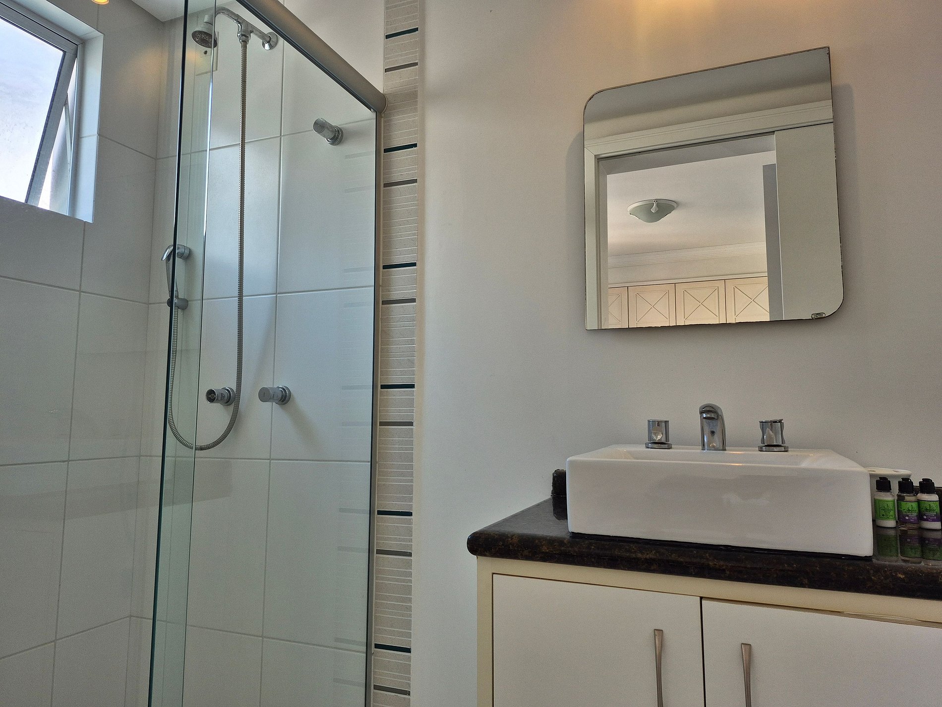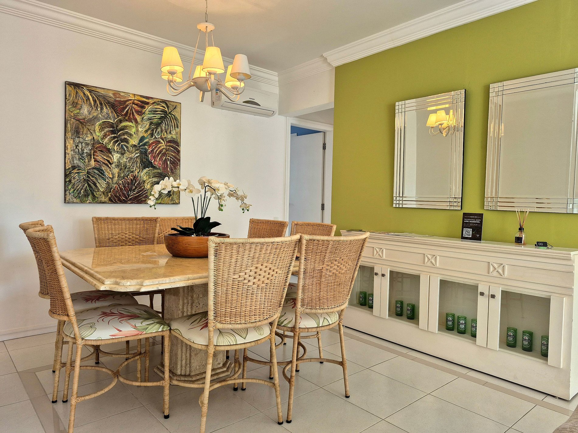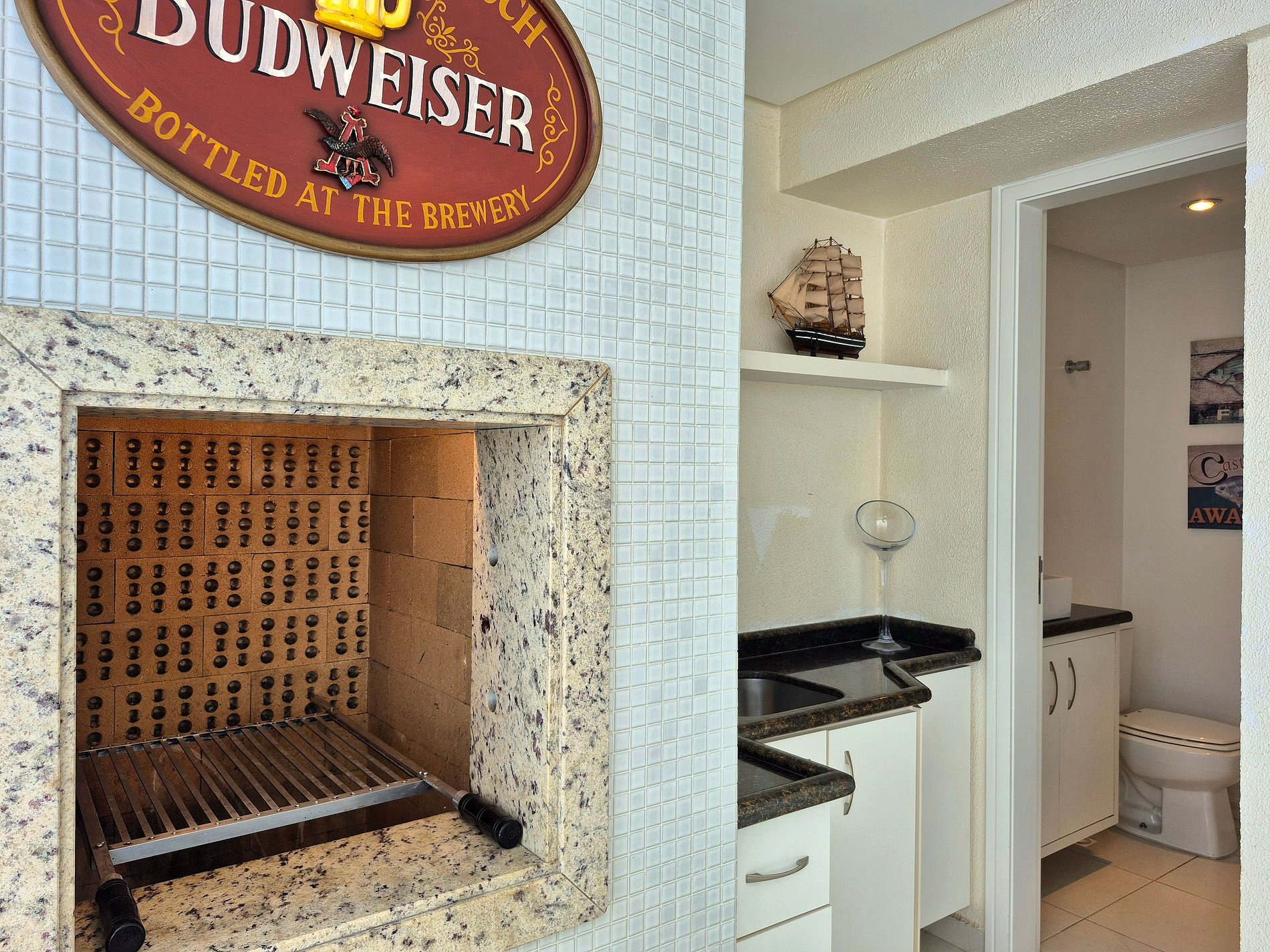 Ar condicionado nos cômodos, cozinha completa com utensílios e eletrodomésticos, 2 suítes com camas de casal, sala com Smart TV, sala de jantar, varanda/sacada bem iluminada com churrasqueira a carvão e lavabo, área de serviço com máquina de lavar.