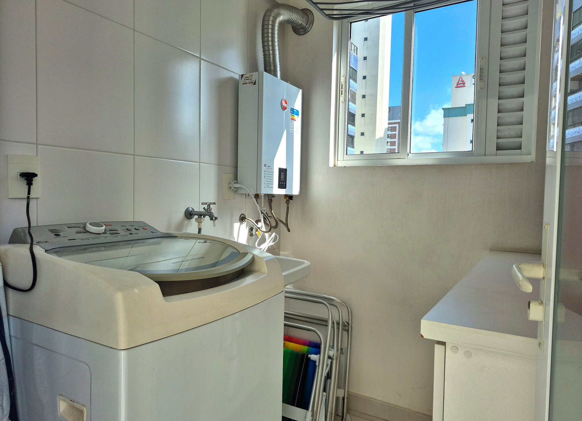 - Área de serviço/lavanderia com máquina de lavar, varal para secar roupas. Móvel planejado e armário.