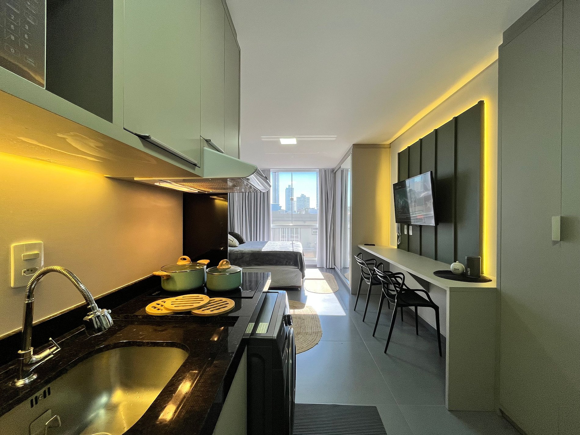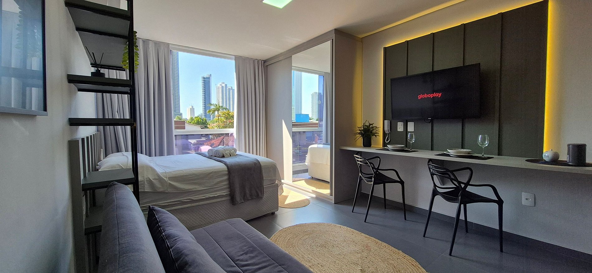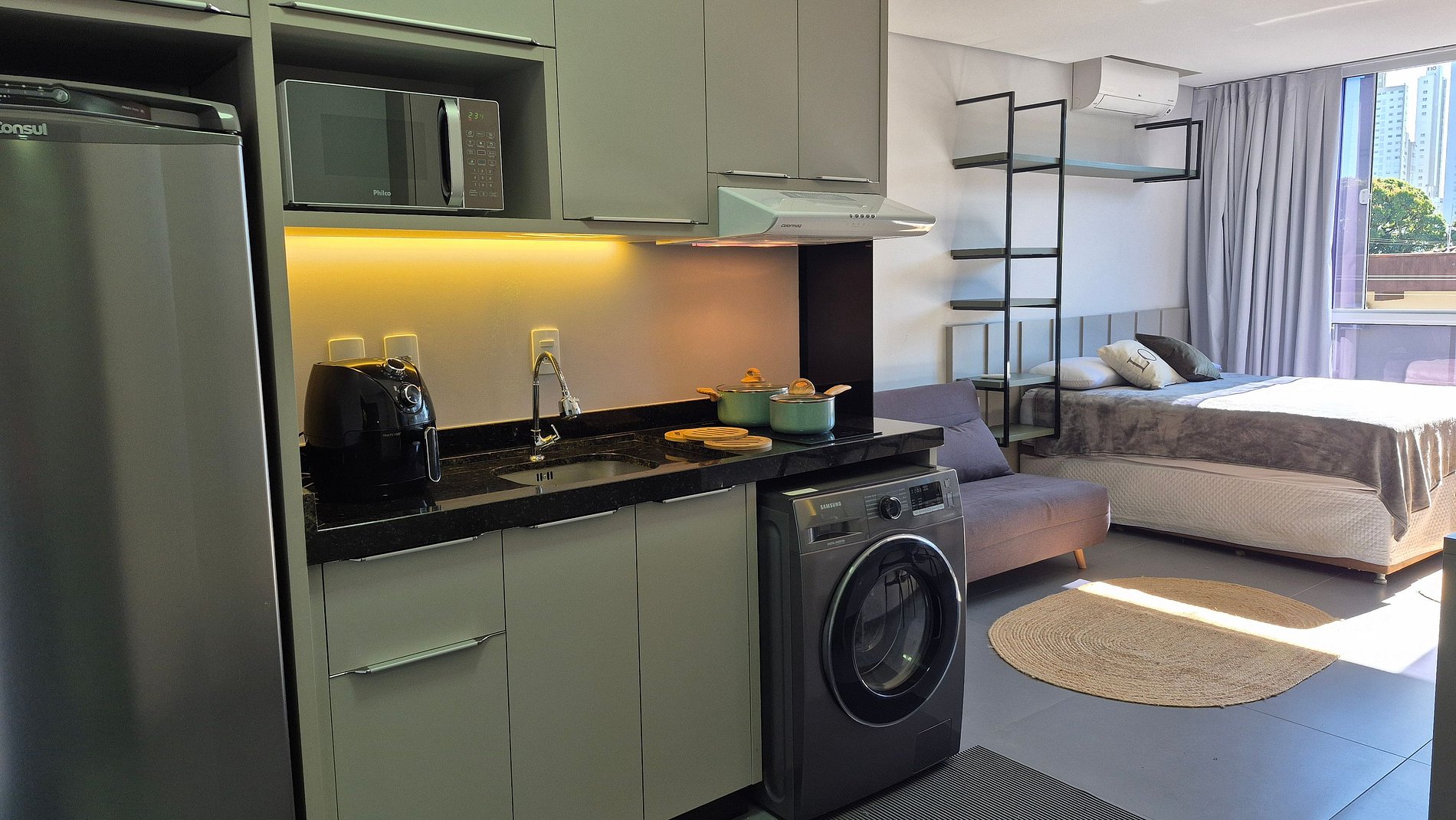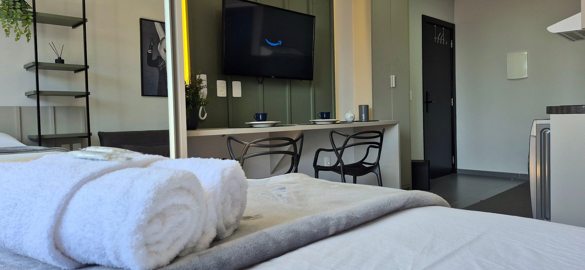 Nosso loft é bem areajado, com janela ampla e boa iluminação. Cozinha com utensílios, Smart TV, Ar condicionado, Internet WI-FI, cama de casal, armários e banheiro. Oferecemos o enxoval completo para sua hospedagem.