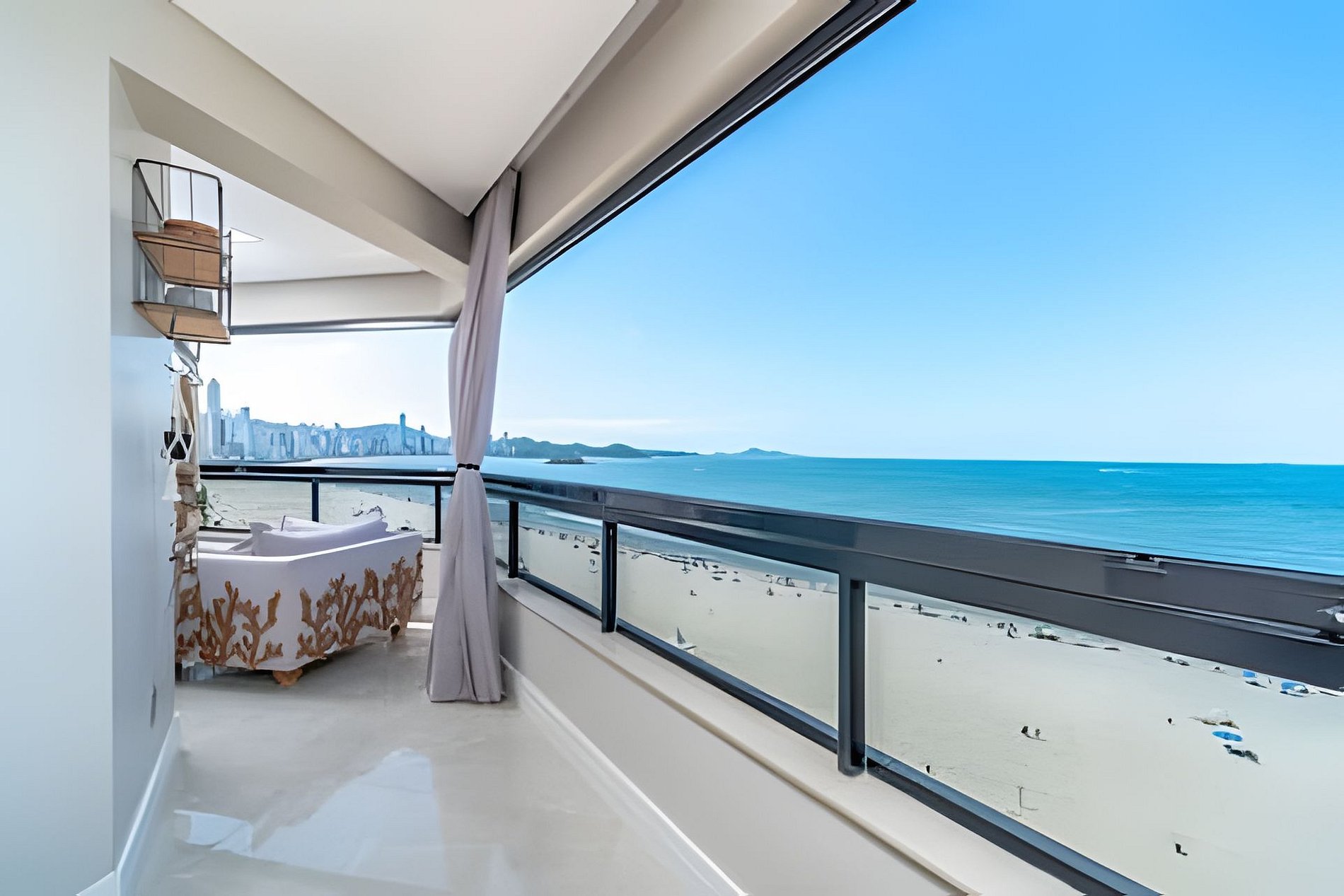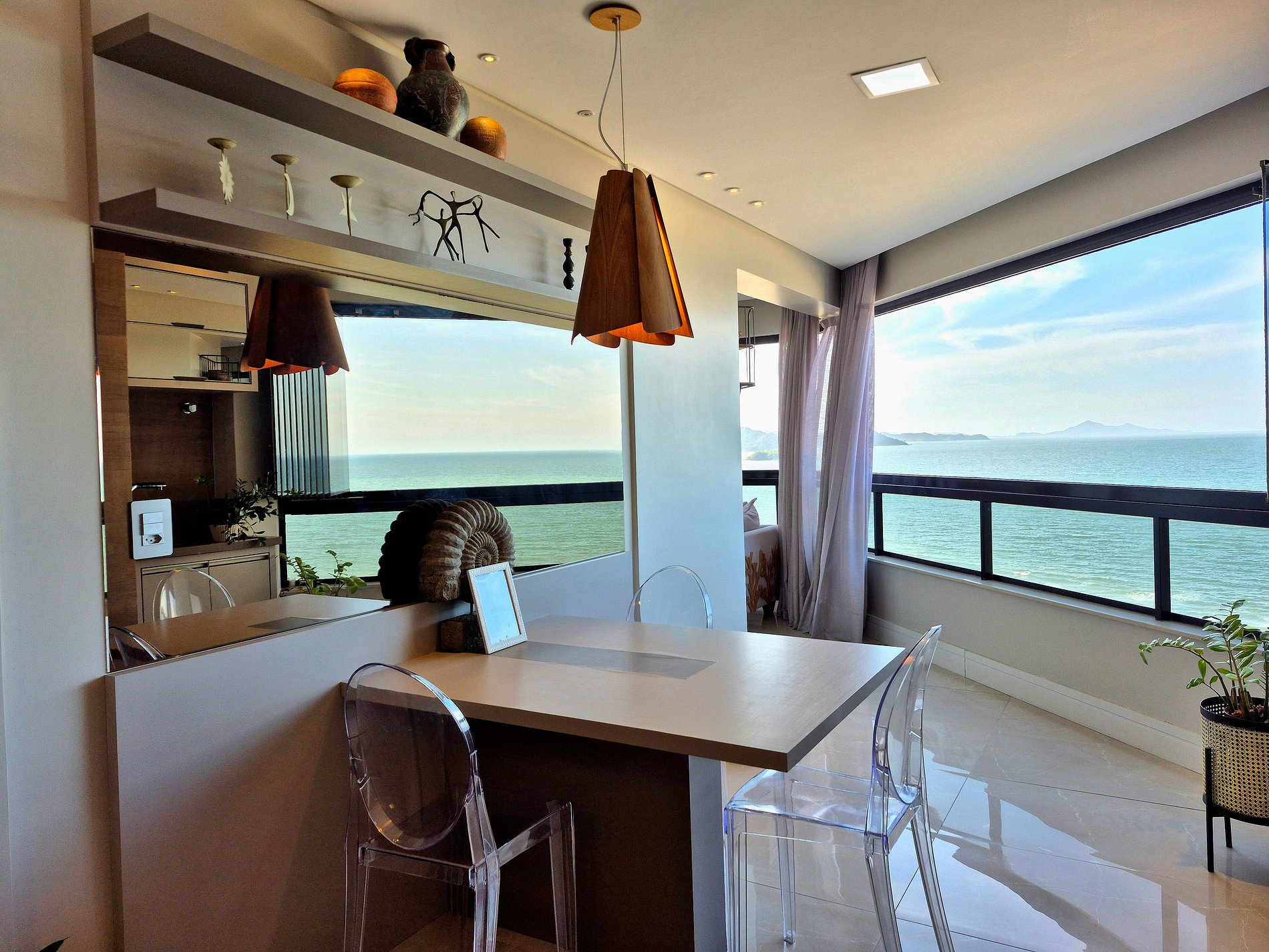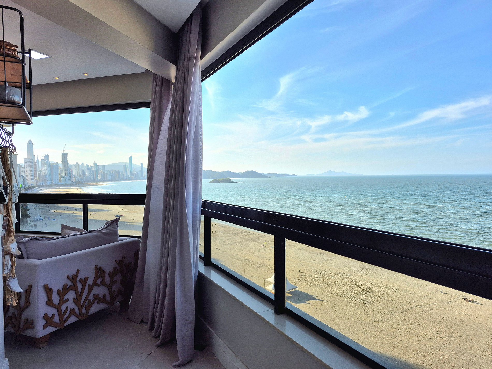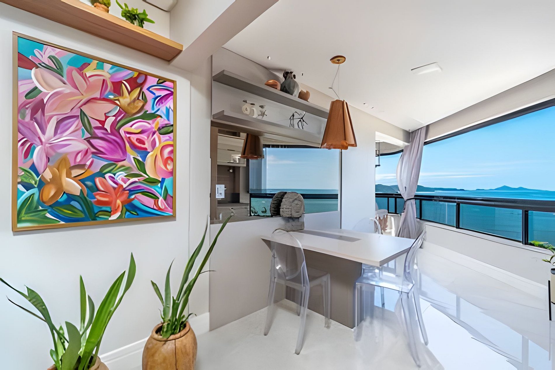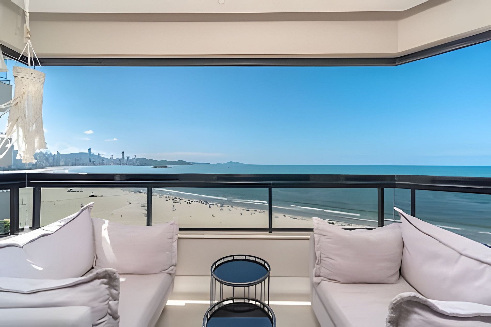 Sofisticado apartamento no 7º andar do Edifício Willimar, na Av. Atlântica, com vista deslumbrante de toda a orla de Balneário Camboriú. Conta com 3 suítes (1 cama king e 2 camas de casal), lavabo, salas de jantar e TV, varanda integrada e cozinha completa. Acomoda até 6 pessoas.