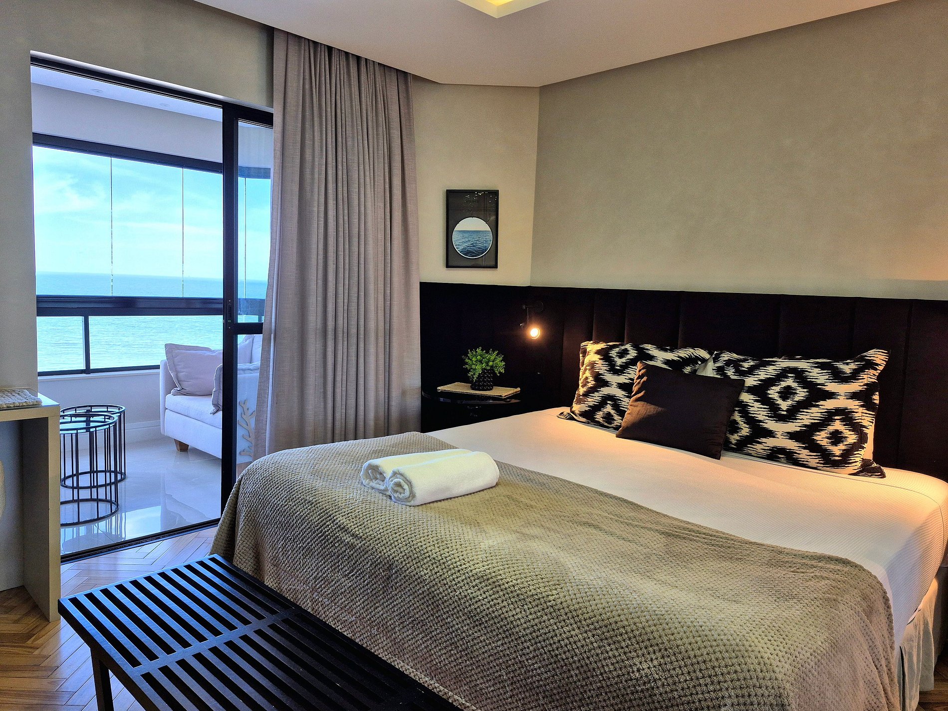 A varanda integrada conta com móveis sofisticados para relaxar e apreciar a vista (uso da churrasqueira não permitido).