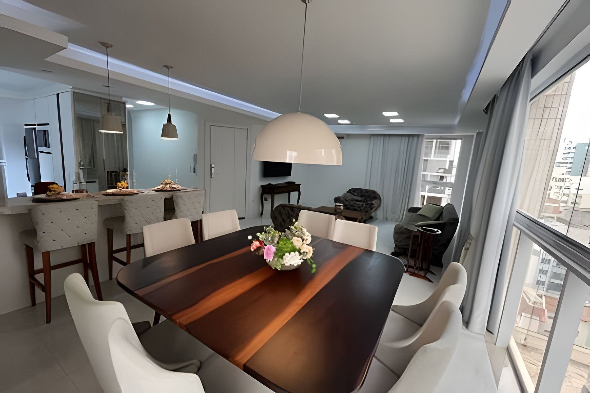 Este espaçoso apartamento oferece acomodações confortáveis e bem distribuídas. A suíte principal conta com cama king-size e tv. A segunda suíte possui cama de casal e a terceira suíte conta com uma cama de casal e uma cama de solteiro, tv e frigobar, acomodando confortavelmente diferentes configurações de hóspedes. Há um lavabo para maior comodidade. Proporcionando momentos de lazer e refeições especiais, a cozinha é totalmente equipada e integrada à área de estar, garantindo praticidade e conforto. Há também o diferencial da CHURRASQUEIRA A CARVÃO integrada a cozinha, que proporciona momentos muito prazerosos a famílias que curtem fazer um churrasco, e confraternizar juntos. Conta ainda com lavanderia equipada com máquina de lavar e varal, garantindo praticidade para sua estadia.