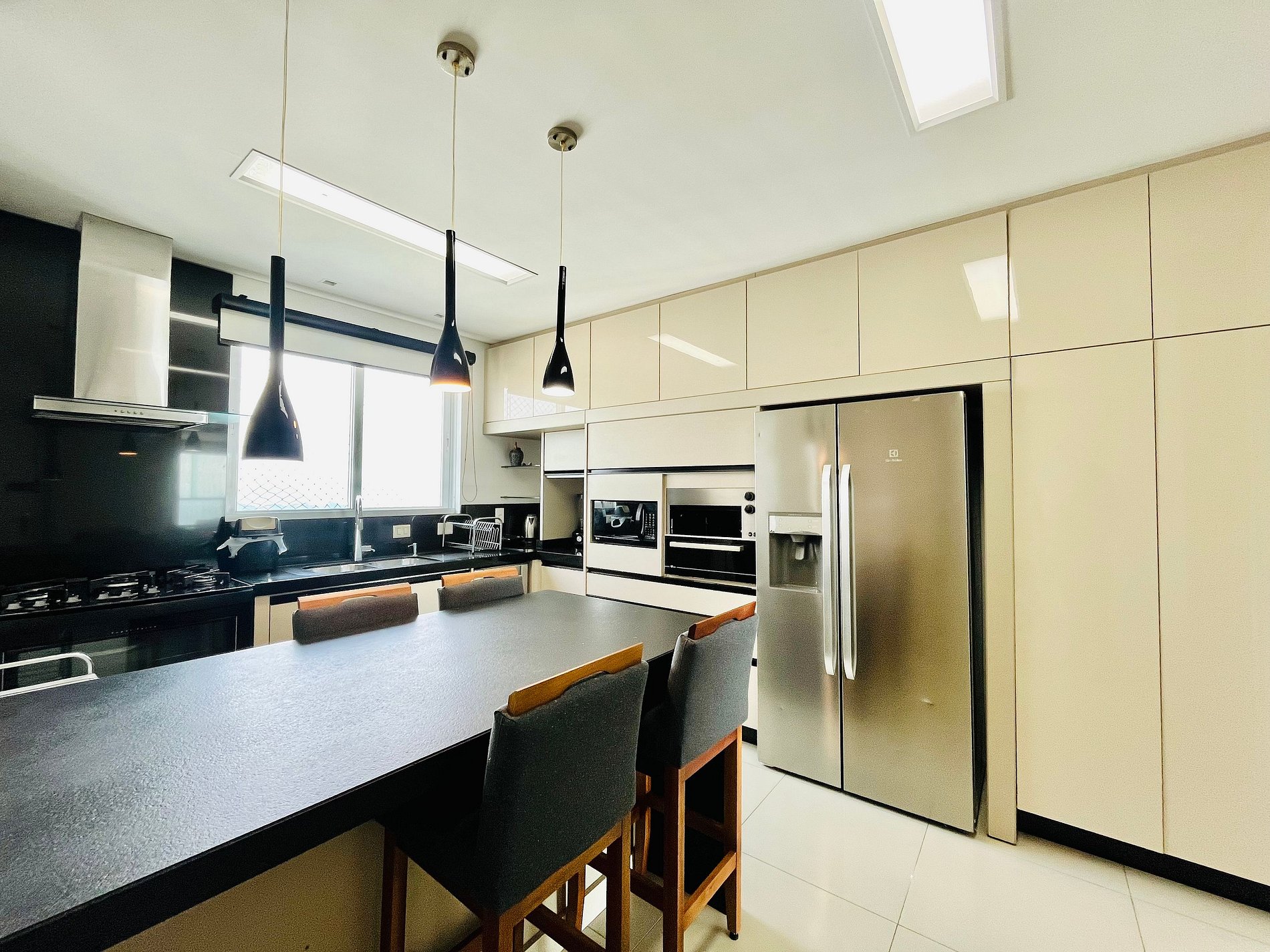 Apartamento completo, com churrasqueira elétrica na cozinha, fogão profissioal, geladeira dupla e jogo completo de louça e taças de vinho.